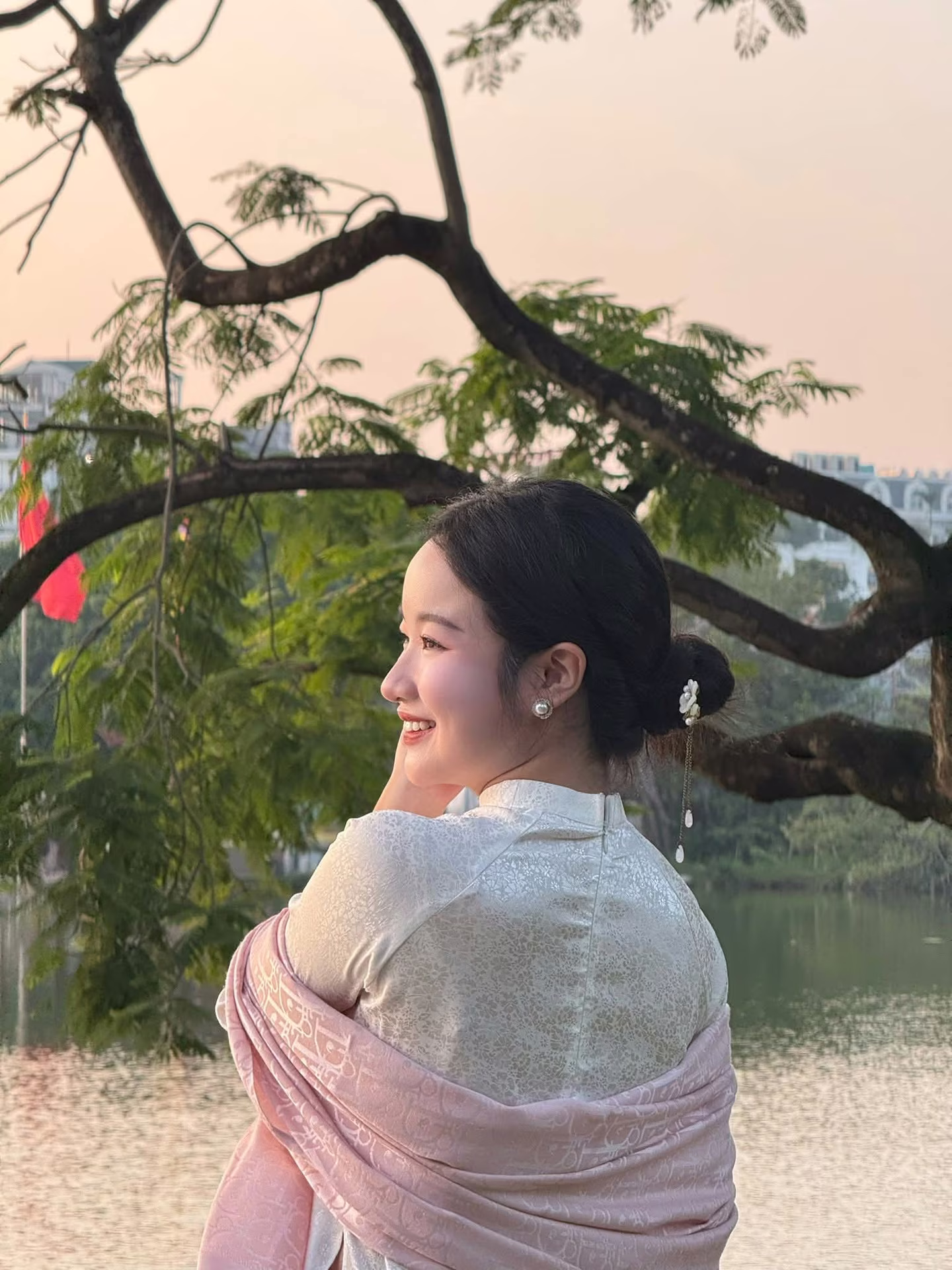 VGU No.148: Radiant Smile in Traditional Ao Dai: Elegant Vietnamese Beauty by the Lake.