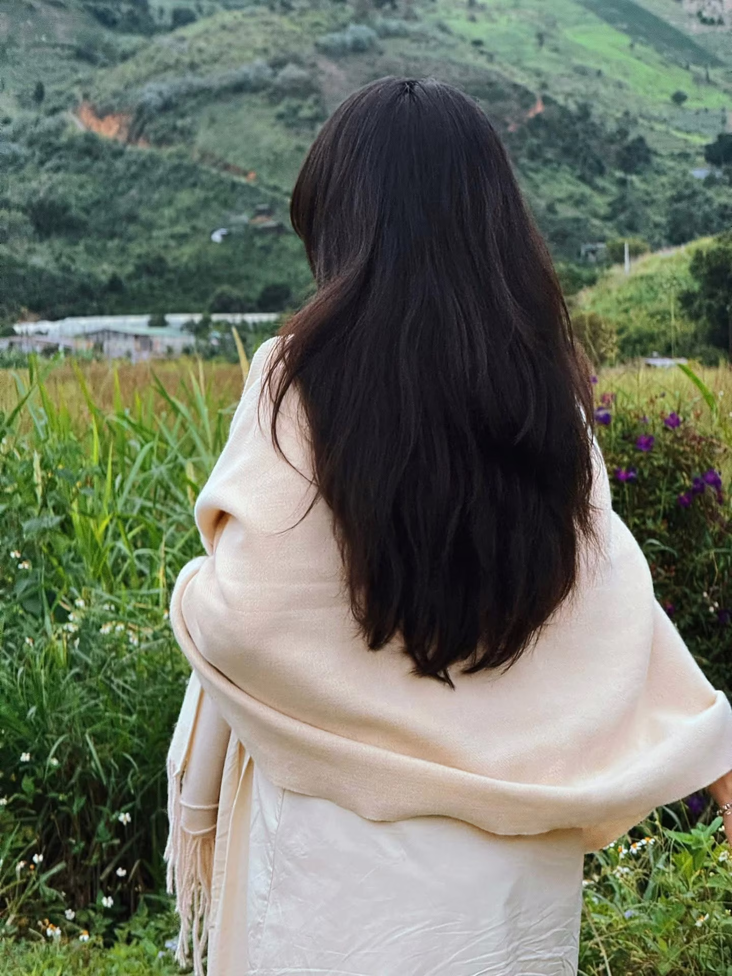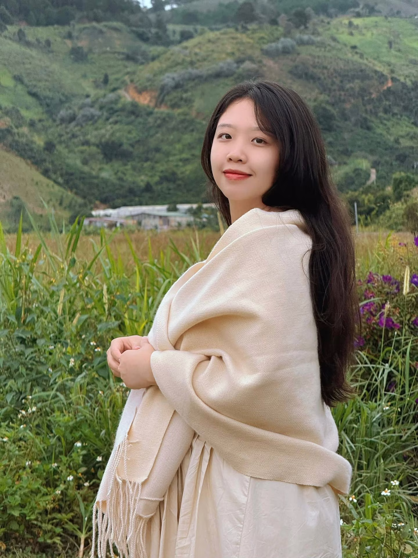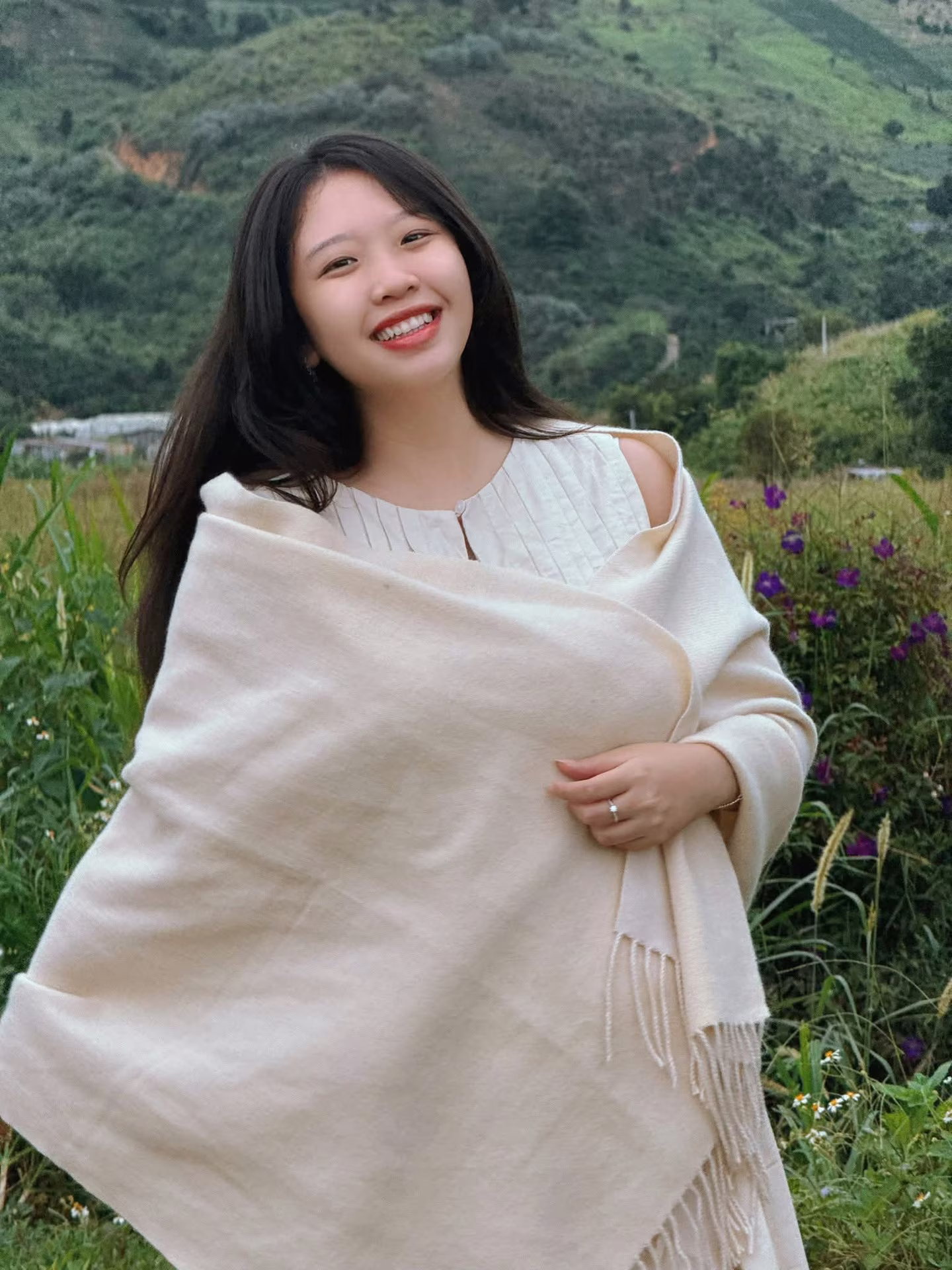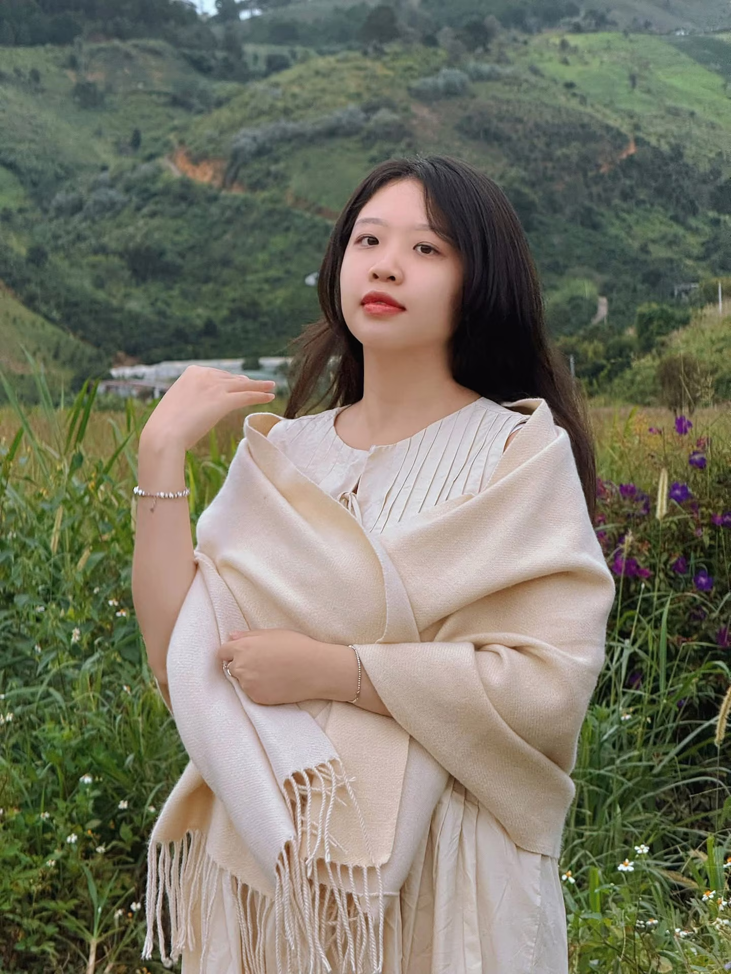 This VGU No.155 photograph captures a beautiful moment of a young woman with a radiant, vibrant smile. Her gentle and elegant beauty is enhanced by a soft cream-colored shawl, creating a harmonious and captivating overall look. Amidst the lush green natural scenery of hills and grassy fields, her fresh smile illuminates the entire space, bringing a sense of peace and tranquility. This is not just a pretty picture but also a moment that perfectly illustrates the wonderful harmony between human and natural landscapes, evoking joy and optimism. This image will surely touch viewers hearts, spreading positive energy.#VGU #RadiantSmile #NaturalBeauty #Elegant #SereneMoment