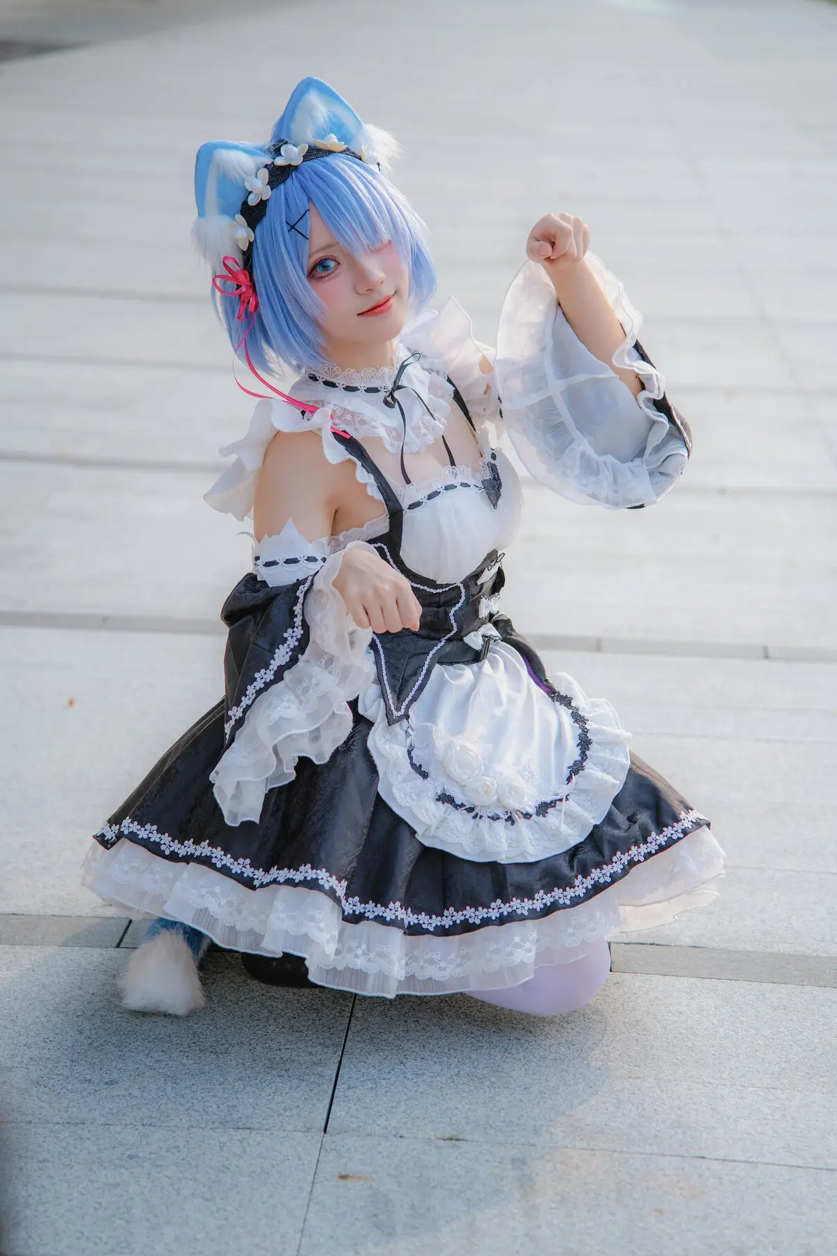 Coser Hua Qi Hana delivered a truly impressive Cat Rem transformation at the Anime Carnival. She appeared in the familiar black and white maid outfit, adorned with incredibly cute blue cat ears. With her striking blue short hair and large, sparkling eyes, Hua Qi Hana perfectly recreated the playful and charming image of Cat Rem. Her dynamic posing, coupled with a radiant smile, captured the character's innocence and allure. This photo collection is sure to captivate Rem fans and the cosplay community, offering a fresh and vibrant perspective on this adorable cat maid.#Coser #HuaQi #Hana #CatRem #RemCosplay #AnimeCarnival #MaidCosplay