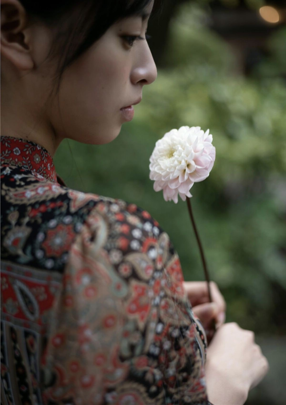 In this image Riko Otsuki 大槻理子 appears with elegant beauty and intense focus on the art of flower arrangement. She kneels in a space filled with natural light creating a serene atmosphere. Her skillful hands delicately arrange each yellow and pink flower showcasing her finesse and artistic soul. Every gesture exudes grace and patience. Her gaze is directed downwards with absolute concentration as if immersed in her own world. Her traditional attire with its patterned design further highlights her classic beauty and ethereal elegance. The photograph not only captures a moment but also conveys Riko Otsuki's profound inner peace and beauty. This image represents the harmonious blend of human and art offering tranquility to the viewer.Stories