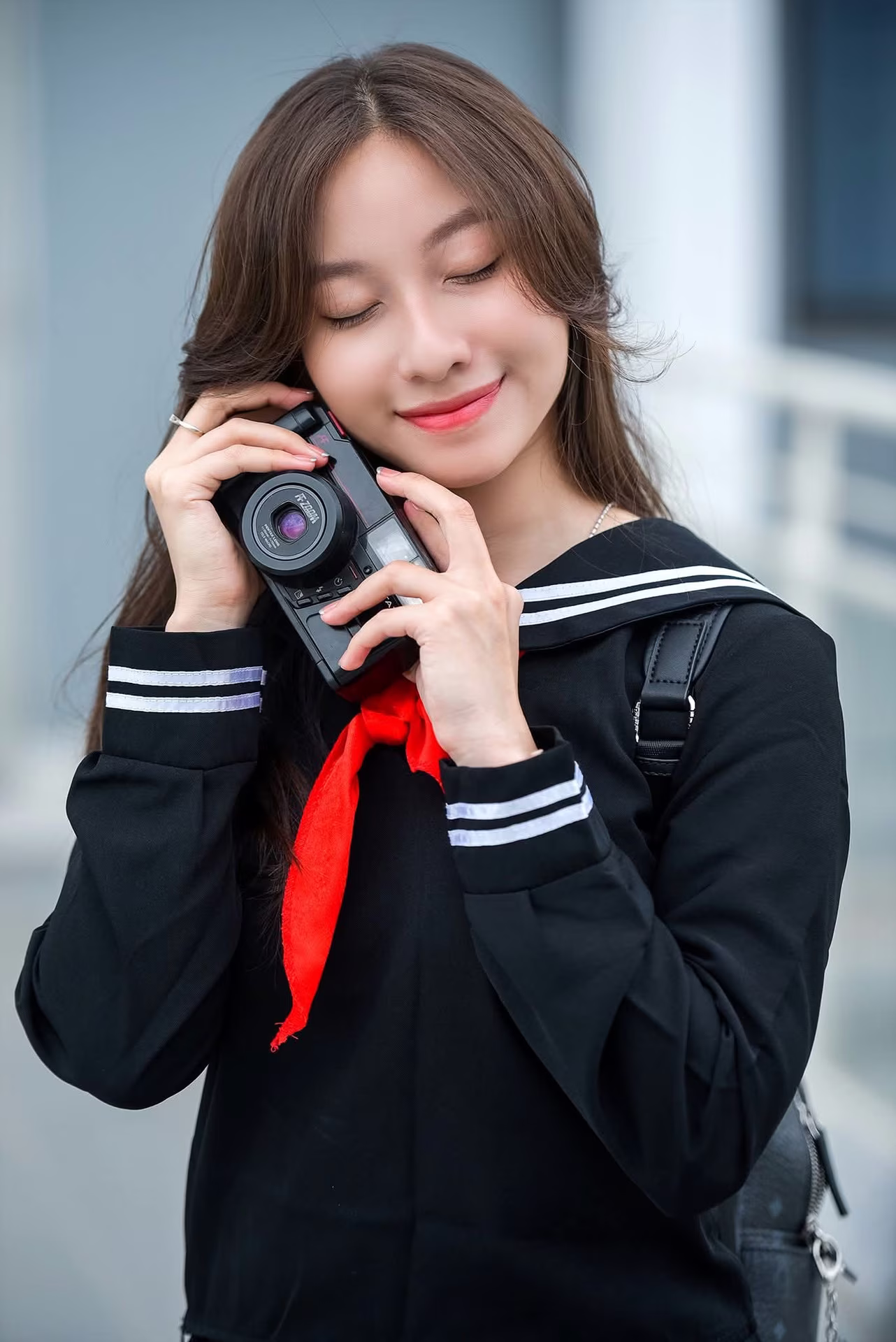 VGU No.17 captures a fresh moment of a youthful student on the VGU campus. The girl exudes a dynamic and confident charm with her modern school style. Her black sailor-collar top paired with a pleated skirt and a fashionable backpack creates a harmonious and striking ensemble. The distinctive platform shoes and white socks further enhance the unique flair of her outfit. Her gentle smile and radiant eyes reflect the vibrant spirit of youth. This image is not just a beautiful portrait but also symbolizes the youthful energy and dynamism of VGU students. #Vietnamese #pretty #charm