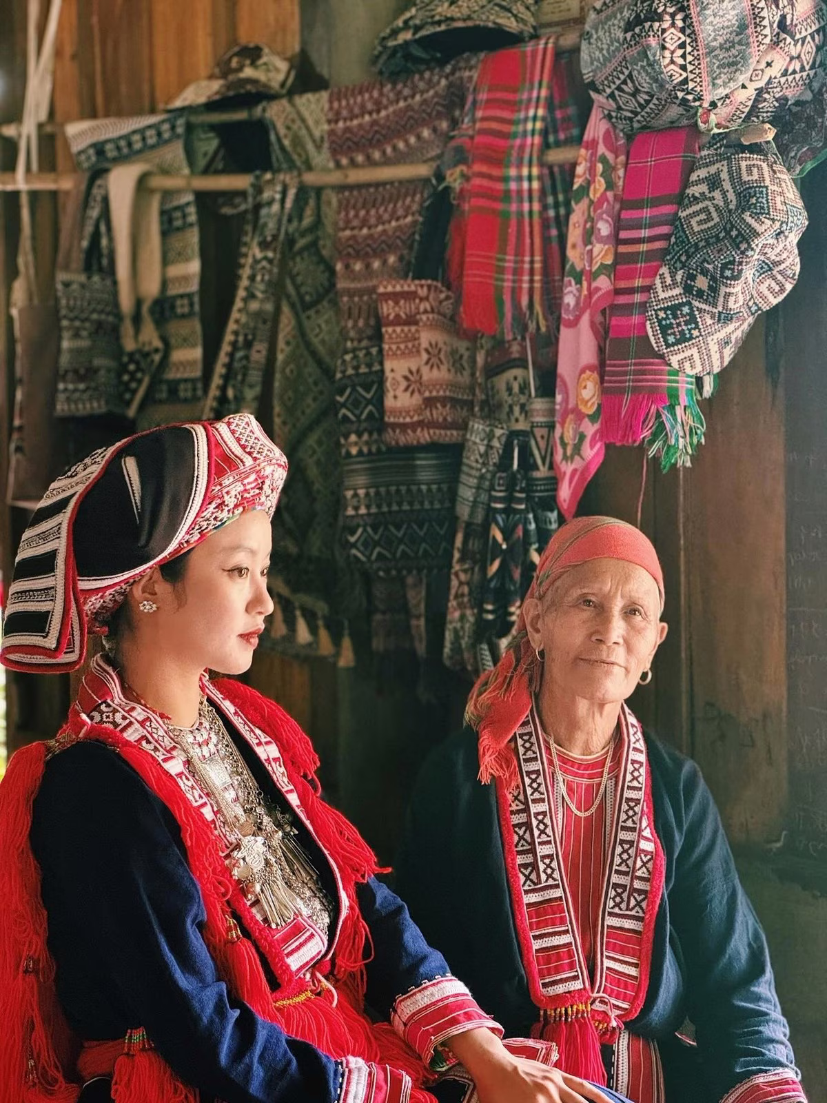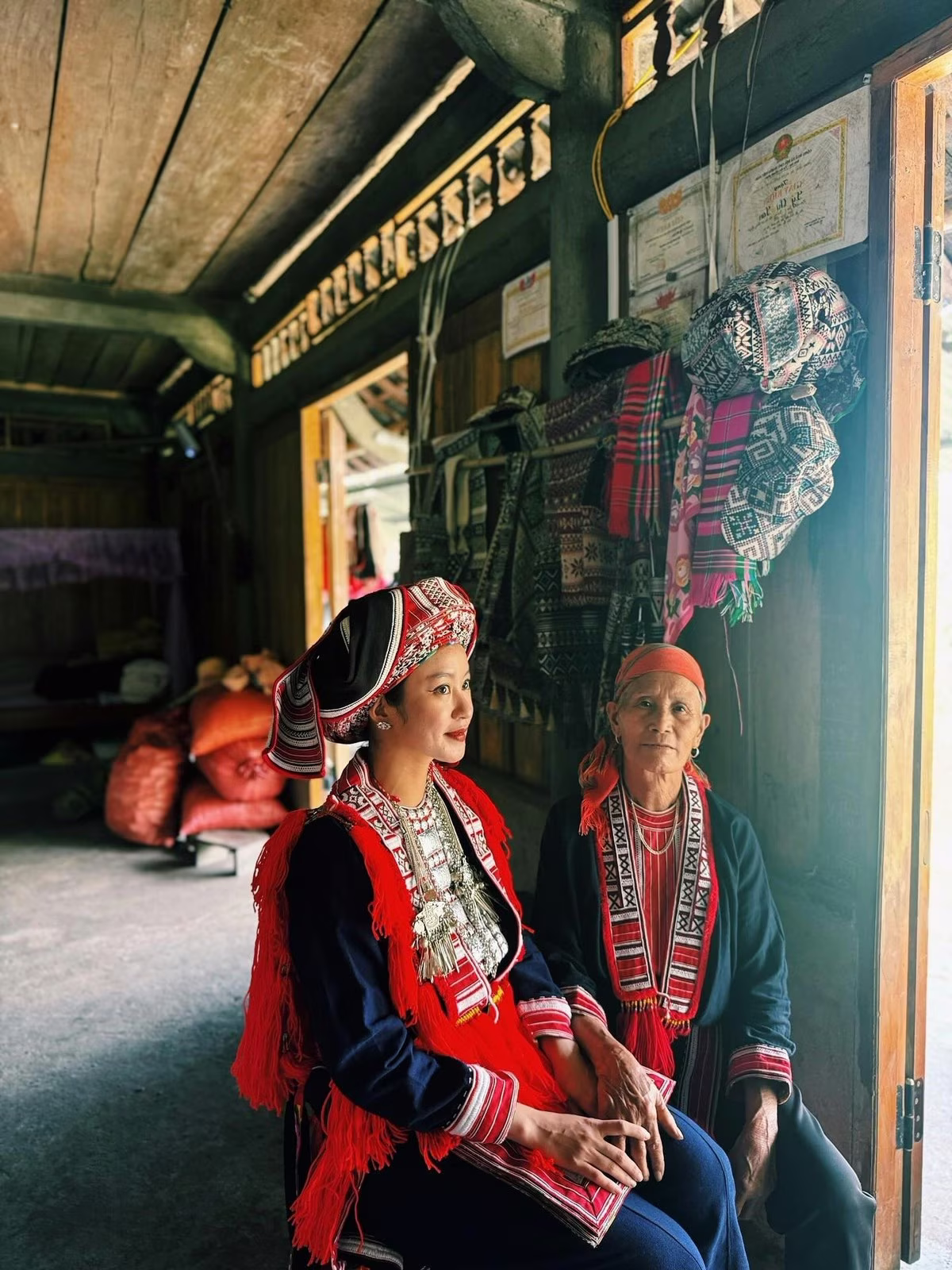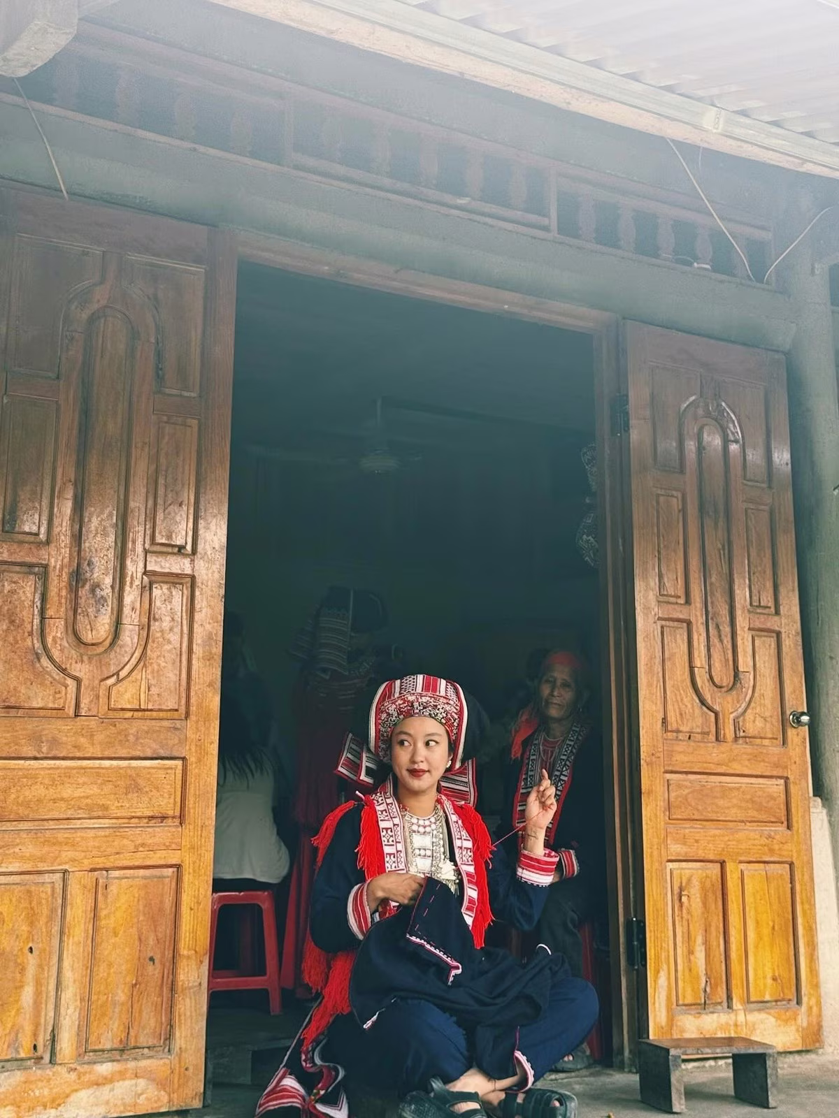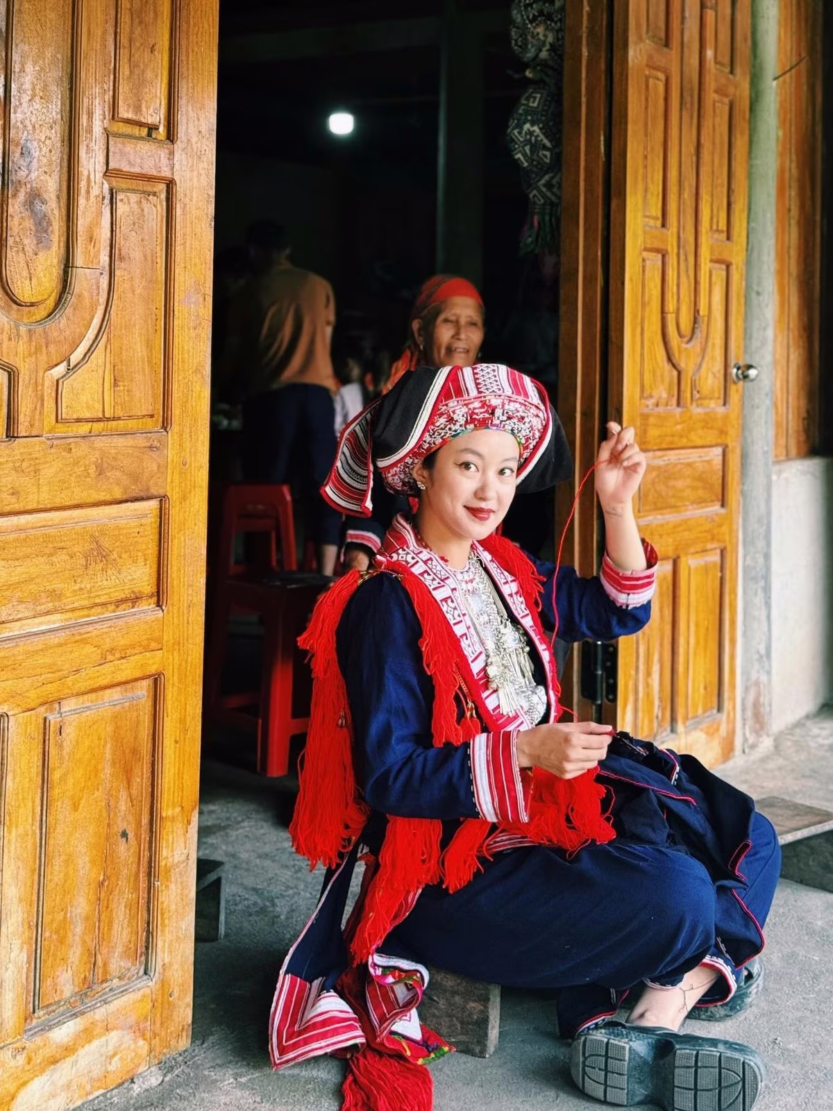 This image captures a graceful moment of Mi Van in the traditional attire of a Red Dao girl. She is meticulously engaged in handicraft work demonstrating her deep immersion into the ethnic cultural beauty of the highlands. This exploratory trip is not just a journey to experience the scenery but also an opportunity for Mi Van to share impressive images of the local people's life and traditions. The beauty of the former Hanoi hot girl donning Red Dao clothing has captivated many fans who admire her cultural appreciation and simplicity. This is truly a meaningful journey honoring the unique cultural values of Vietnam.