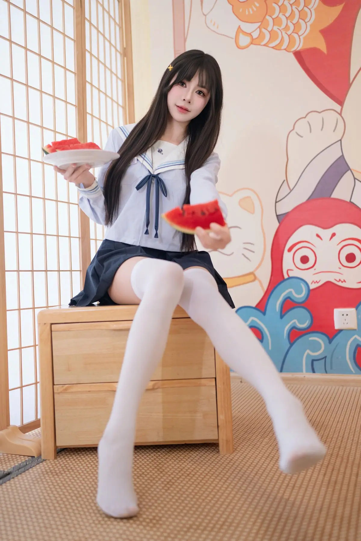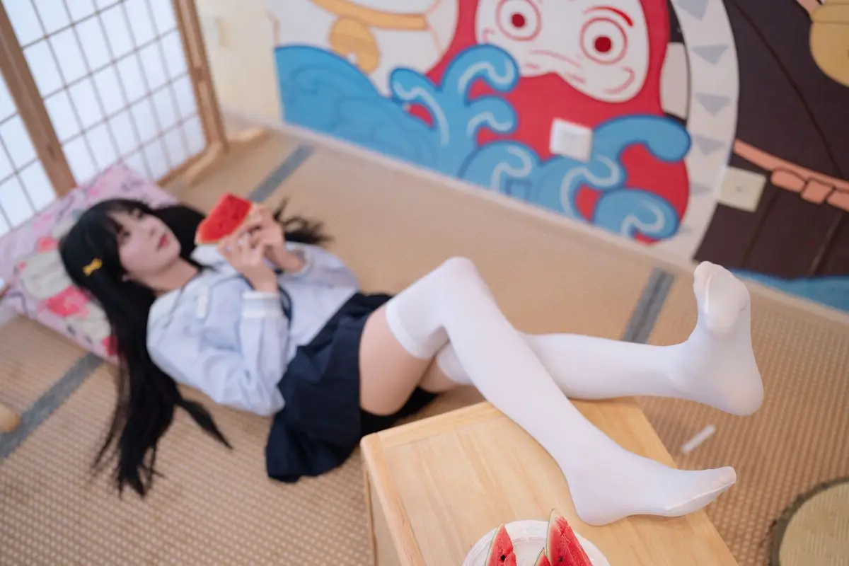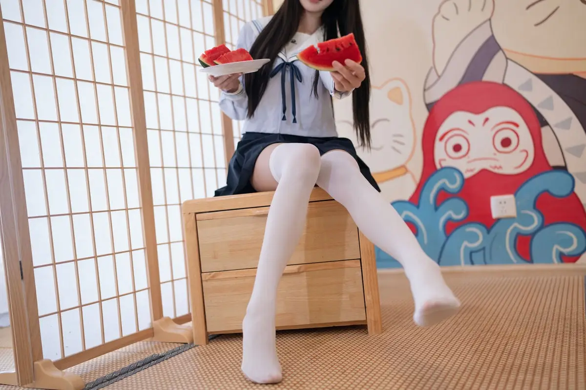 This charming image captures a delightful moment of a schoolgirl in her elegant white and blue sailor uniform. She sits comfortably on a wooden cabinet, her long flowing dark hair gracefully draped and her wide innocent eyes gaze directly at the camera with a charming purity. A highlight is her white thigh-high socks emphasizing her fresh and youthful beauty. In her hands she holds a plate of juicy red watermelon evoking a cool and sweet summer ambiance. The overall picture exudes a gentle and pristine aura like a serene summer dream leaving viewers captivated by her radiant youthful charm.#schoolgirl #uniform #summerreverie #schoolfashion #youthfulcharm