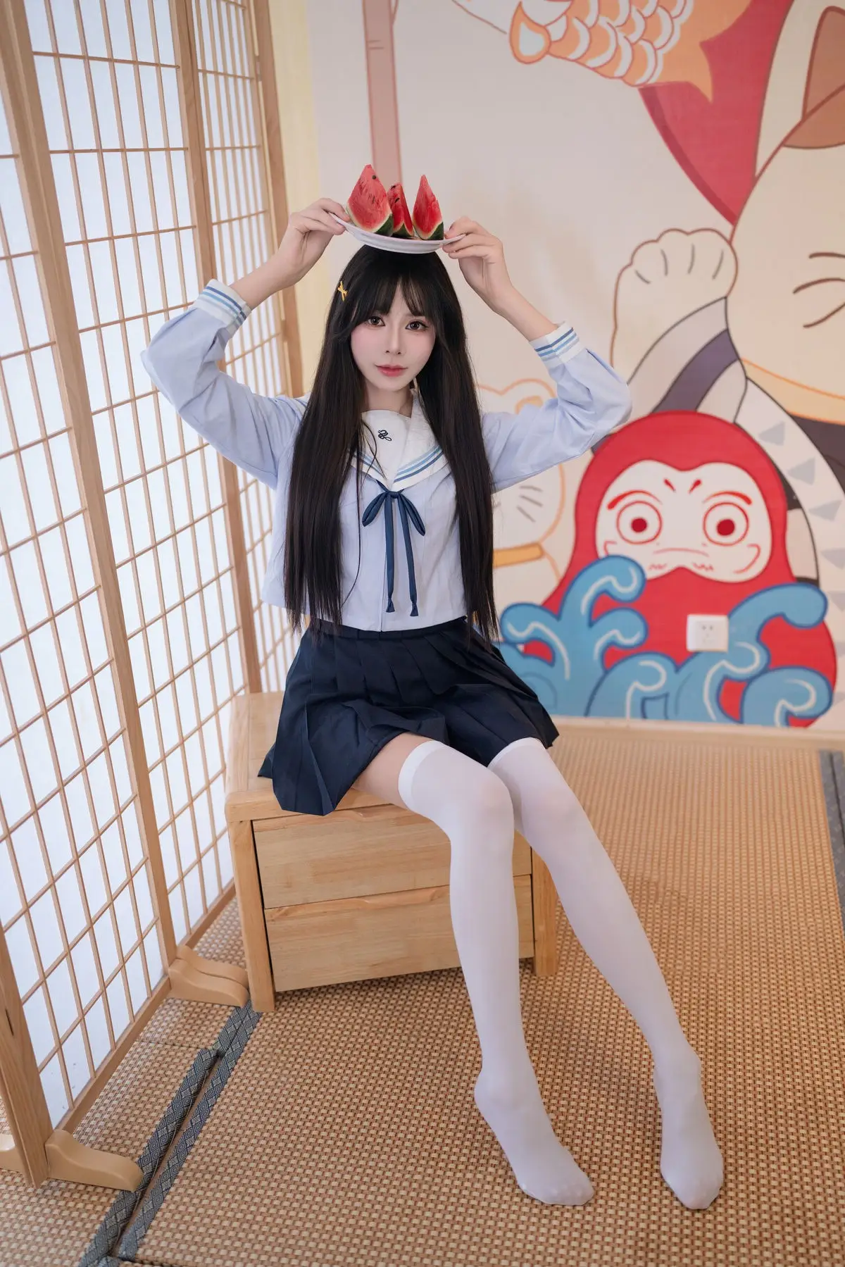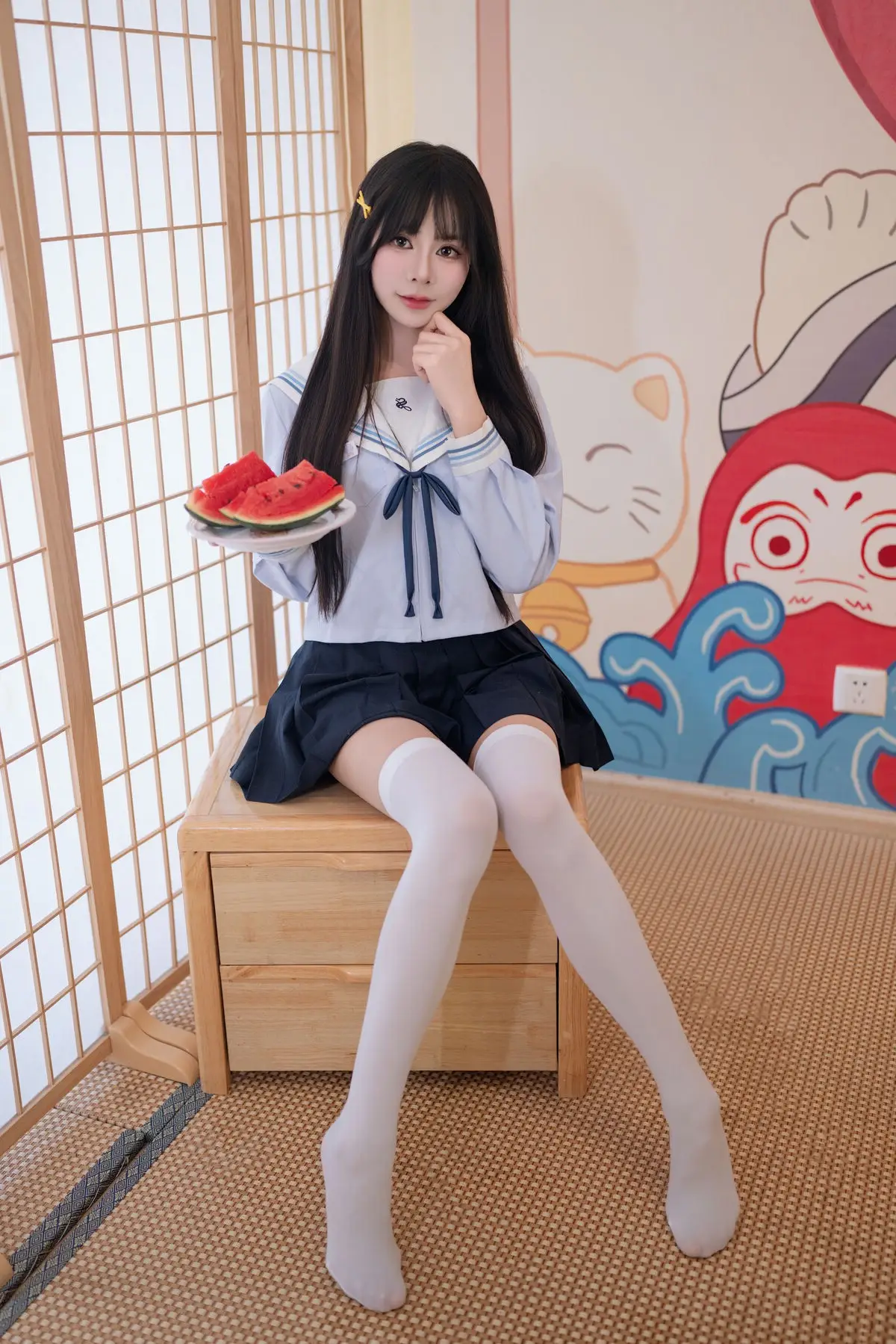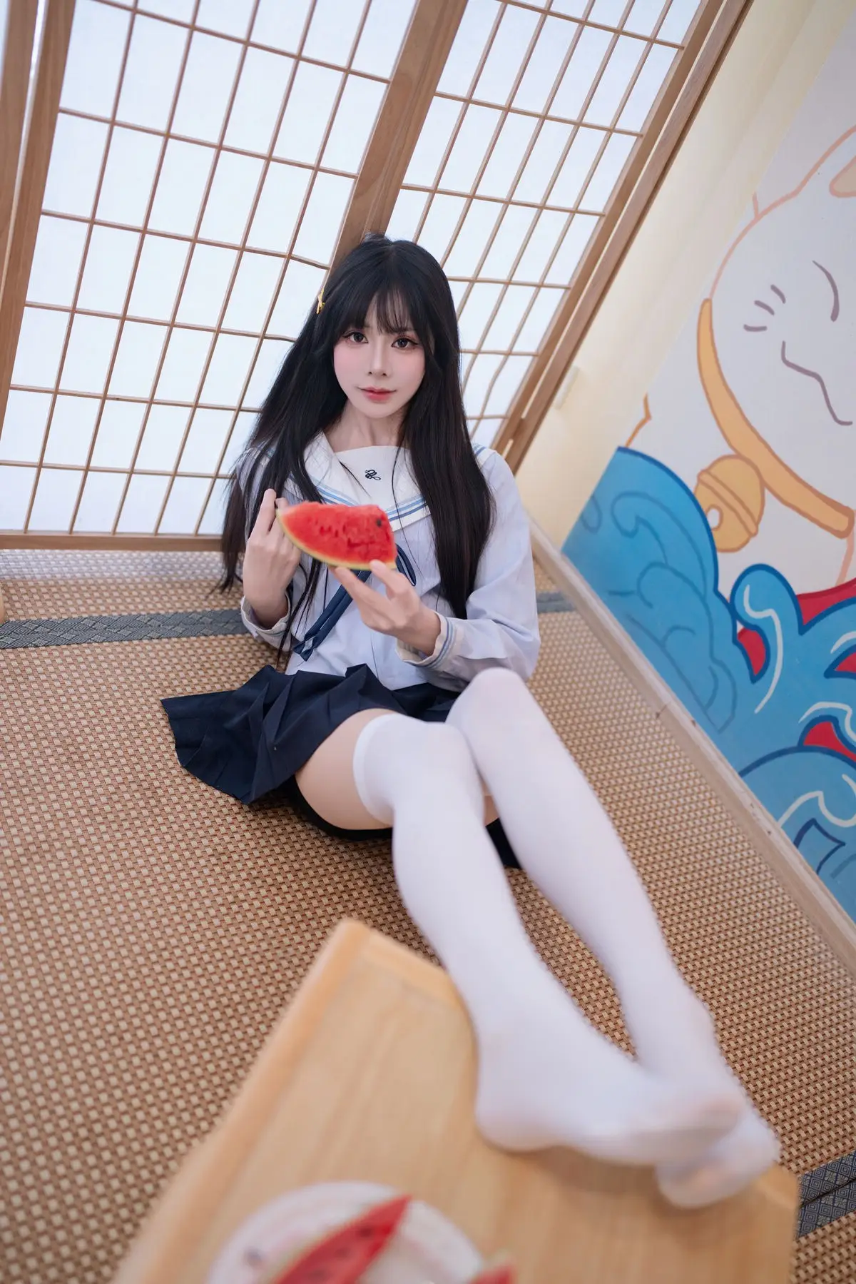 This charming image captures a delightful moment of a schoolgirl in her elegant white and blue sailor uniform. She sits comfortably on a wooden cabinet, her long flowing dark hair gracefully draped and her wide innocent eyes gaze directly at the camera with a charming purity. A highlight is her white thigh-high socks emphasizing her fresh and youthful beauty. In her hands she holds a plate of juicy red watermelon evoking a cool and sweet summer ambiance. The overall picture exudes a gentle and pristine aura like a serene summer dream leaving viewers captivated by her radiant youthful charm.#schoolgirl #uniform #summerreverie #schoolfashion #youthfulcharm