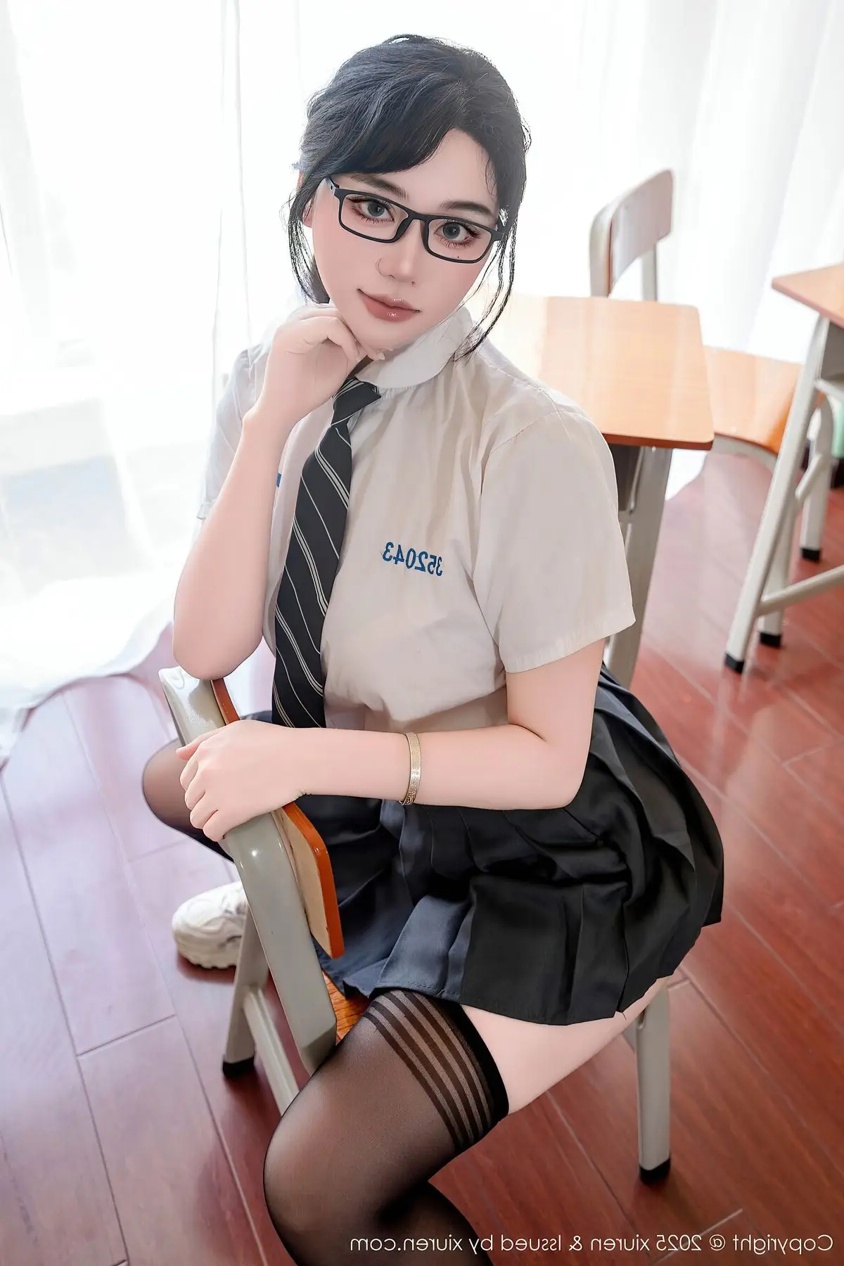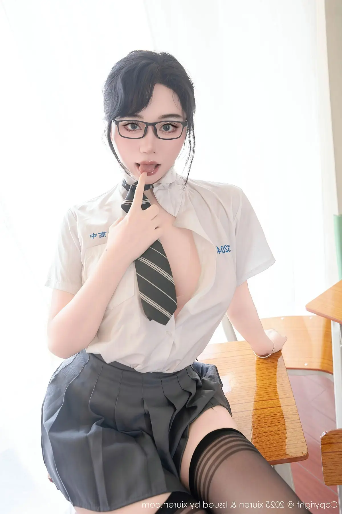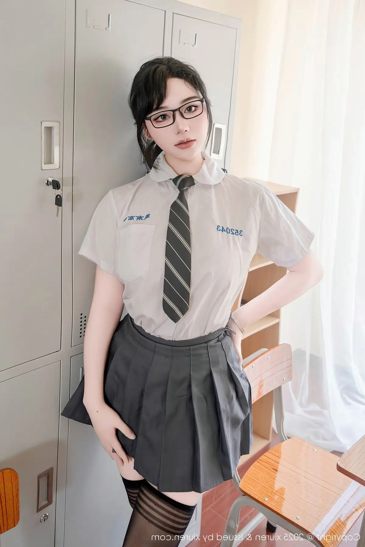 The XiuRen No.10530 photo collection proudly presents model Xi Xi Ai Chi Cao Mei in a captivating schoolgirl persona. She is elegantly dressed in a classic school uniform featuring a crisp white shirt a striped tie and a neatly pleated skirt. A pair of stylish glasses adds an intellectual charm perfectly complementing her alluring long legs in dark thigh-high stockings. Xi Xi Ai Chi Cao Mei radiates a beauty that is both innocent and subtly mysterious effortlessly drawing the viewers gaze. She showcases remarkable confidence and an enchanting demeanor in every frame creating an irresistible appeal. Her sweet and distinctive charm is beautifully captured through her expressive eyes and gentle smile. This is an artistic and emotive series highlighting the fascinating allure of a modern schoolgirl.
