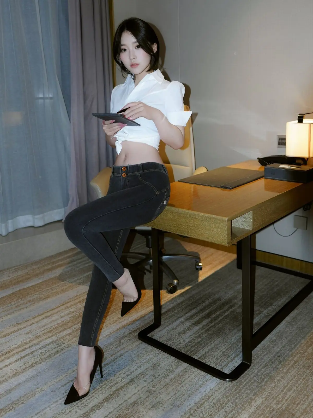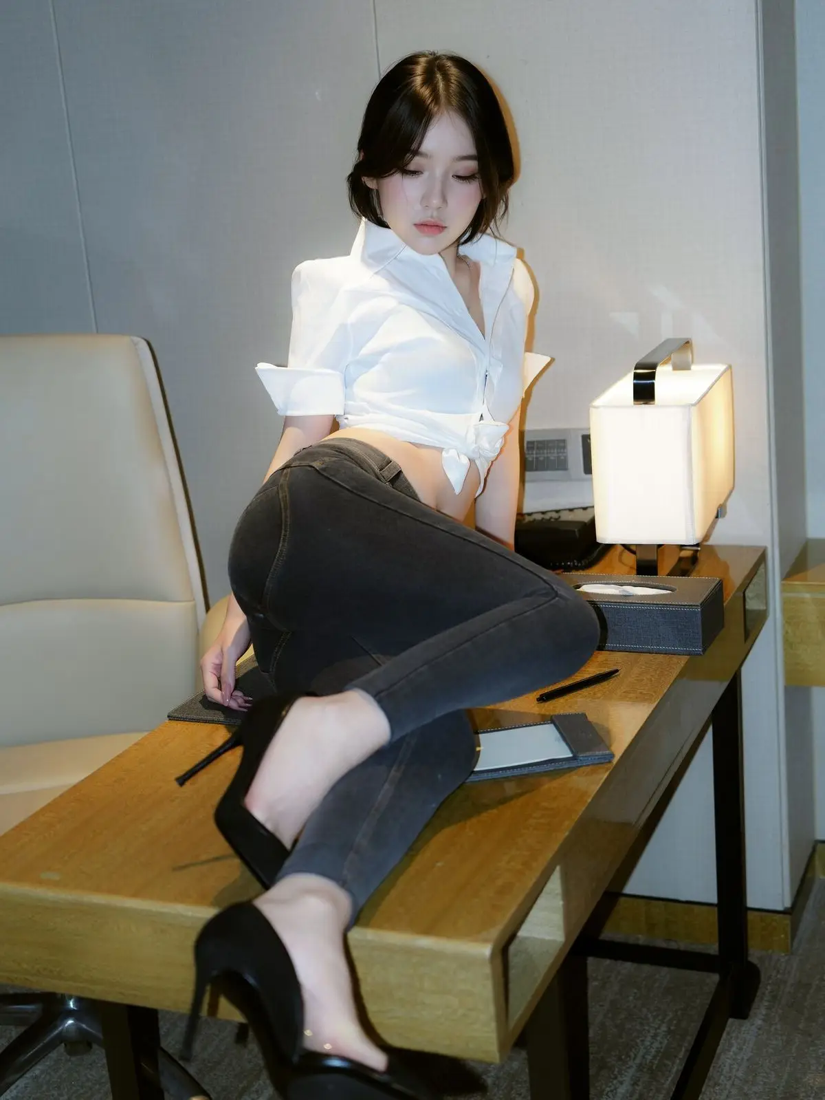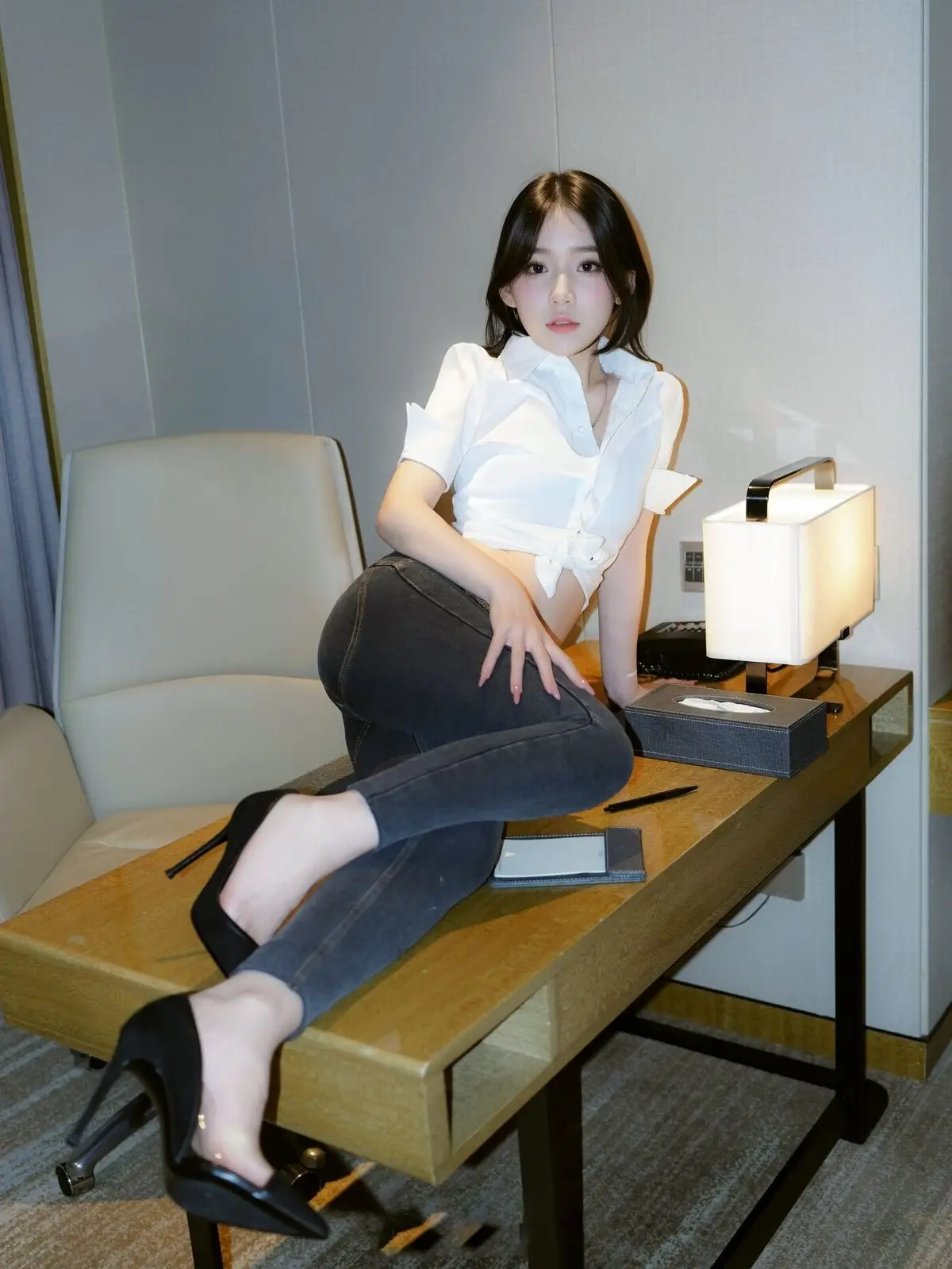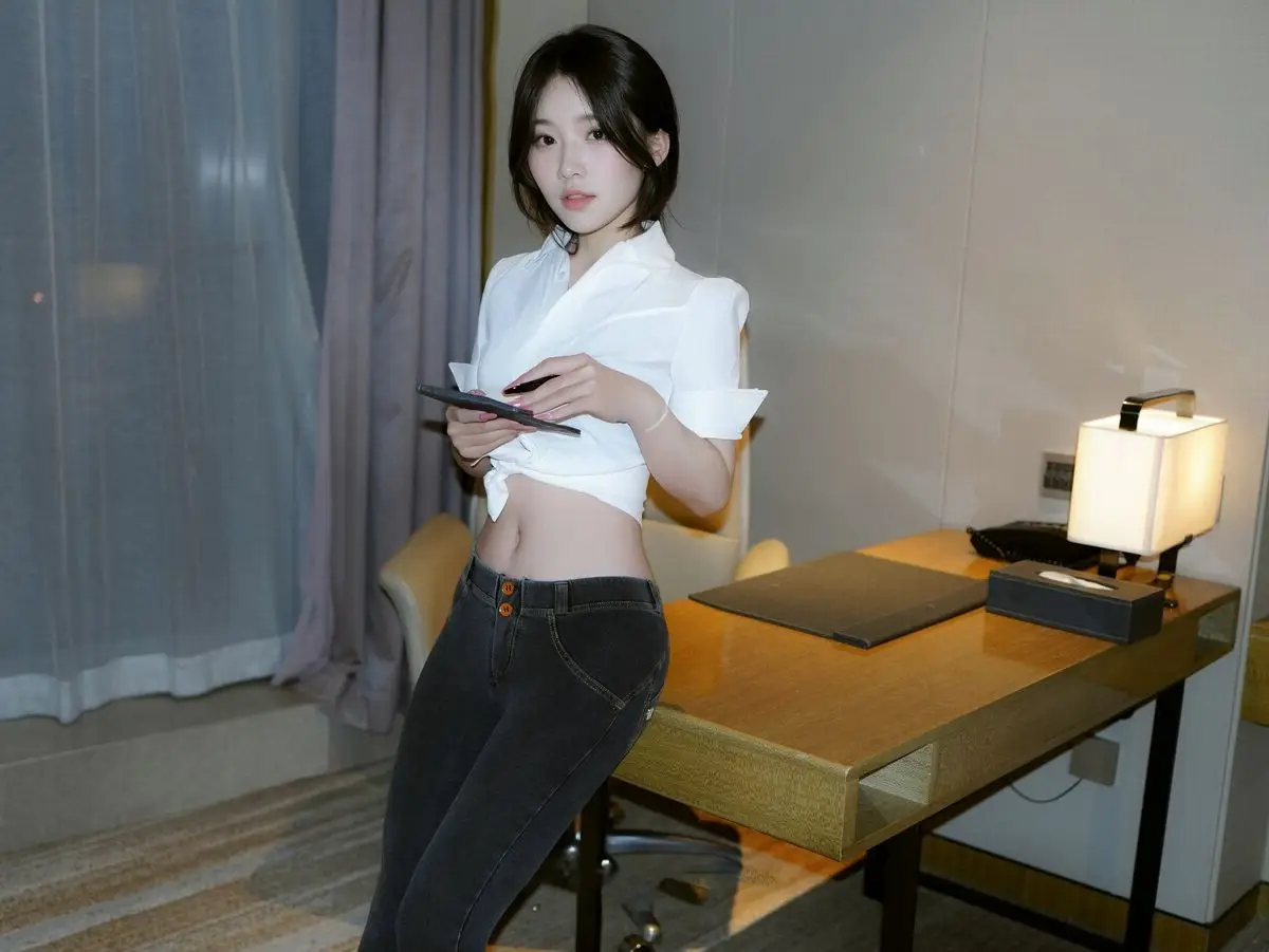 This stunning image focuses on Zhi Zhi, a captivating XiuRen intern secretary, exuding both professionalism and allure in her workspace. She is elegantly dressed in a white crop top shirt, paired with dark trousers and black high heels, accentuating her slender figure and modern fashion sense. Zhi Zhi’s confident pose at the desk, her engaging gaze, and a subtle smile convey an irresistible charm. She not only embodies a diligent secretary but also showcases a confident and subtly sensual presence. The photograph skillfully balances office elegance with personal appeal, inviting viewers to discover more about the beautiful Zhi Zhi.#ZhiZhi #InternSecretary #XiuRen #OfficeFashion #AlluringModel #OfficeLady #OL #jean