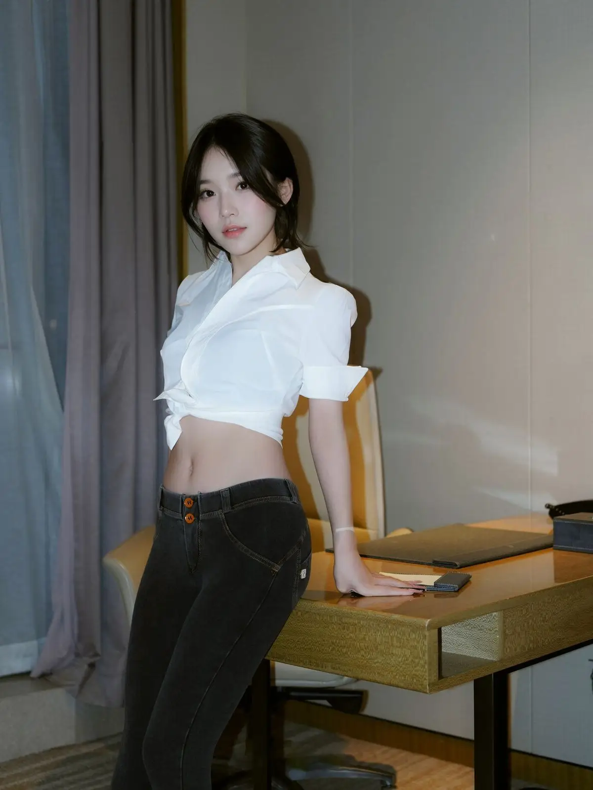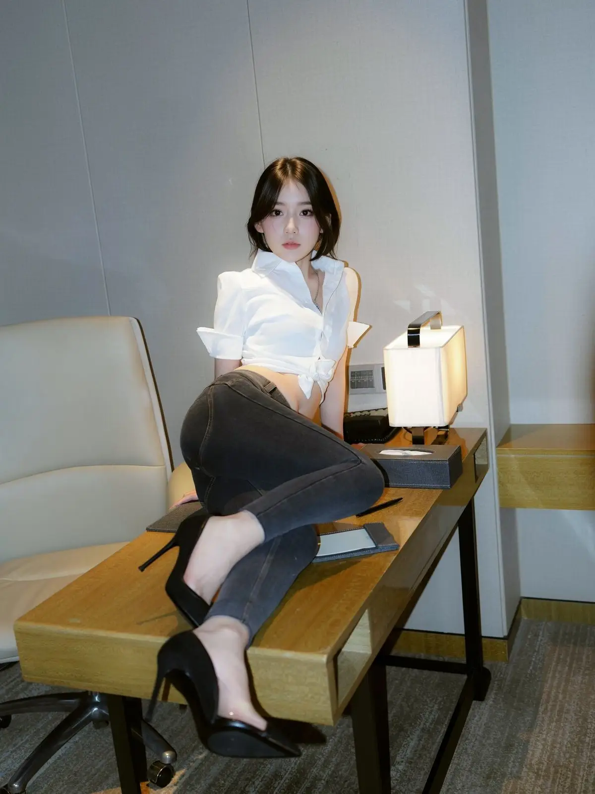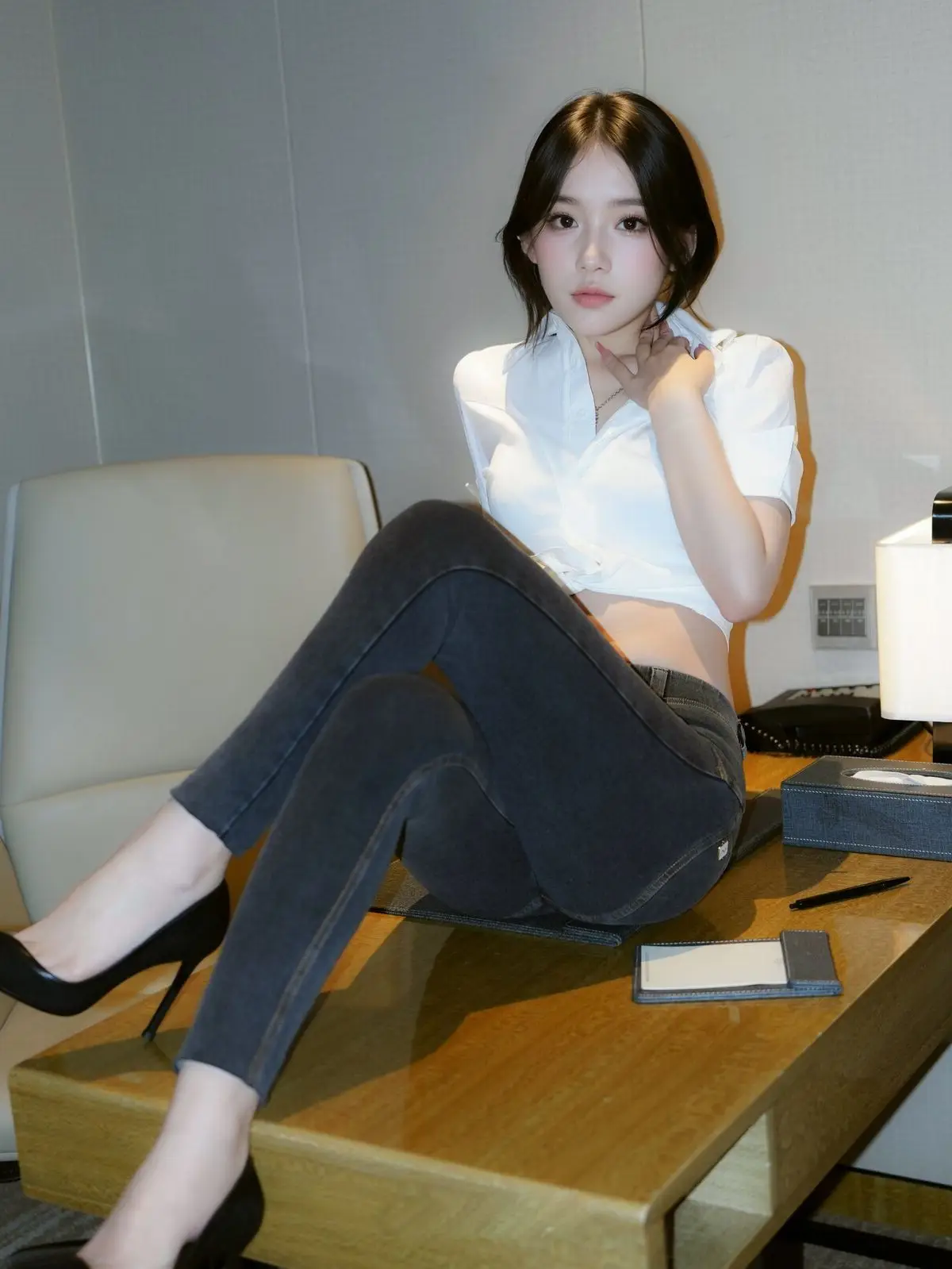 This stunning image focuses on Zhi Zhi, a captivating XiuRen intern secretary, exuding both professionalism and allure in her workspace. She is elegantly dressed in a white crop top shirt, paired with dark trousers and black high heels, accentuating her slender figure and modern fashion sense. Zhi Zhi’s confident pose at the desk, her engaging gaze, and a subtle smile convey an irresistible charm. She not only embodies a diligent secretary but also showcases a confident and subtly sensual presence. The photograph skillfully balances office elegance with personal appeal, inviting viewers to discover more about the beautiful Zhi Zhi.#ZhiZhi #InternSecretary #XiuRen #OfficeFashion #AlluringModel #OfficeLady #OL #jean