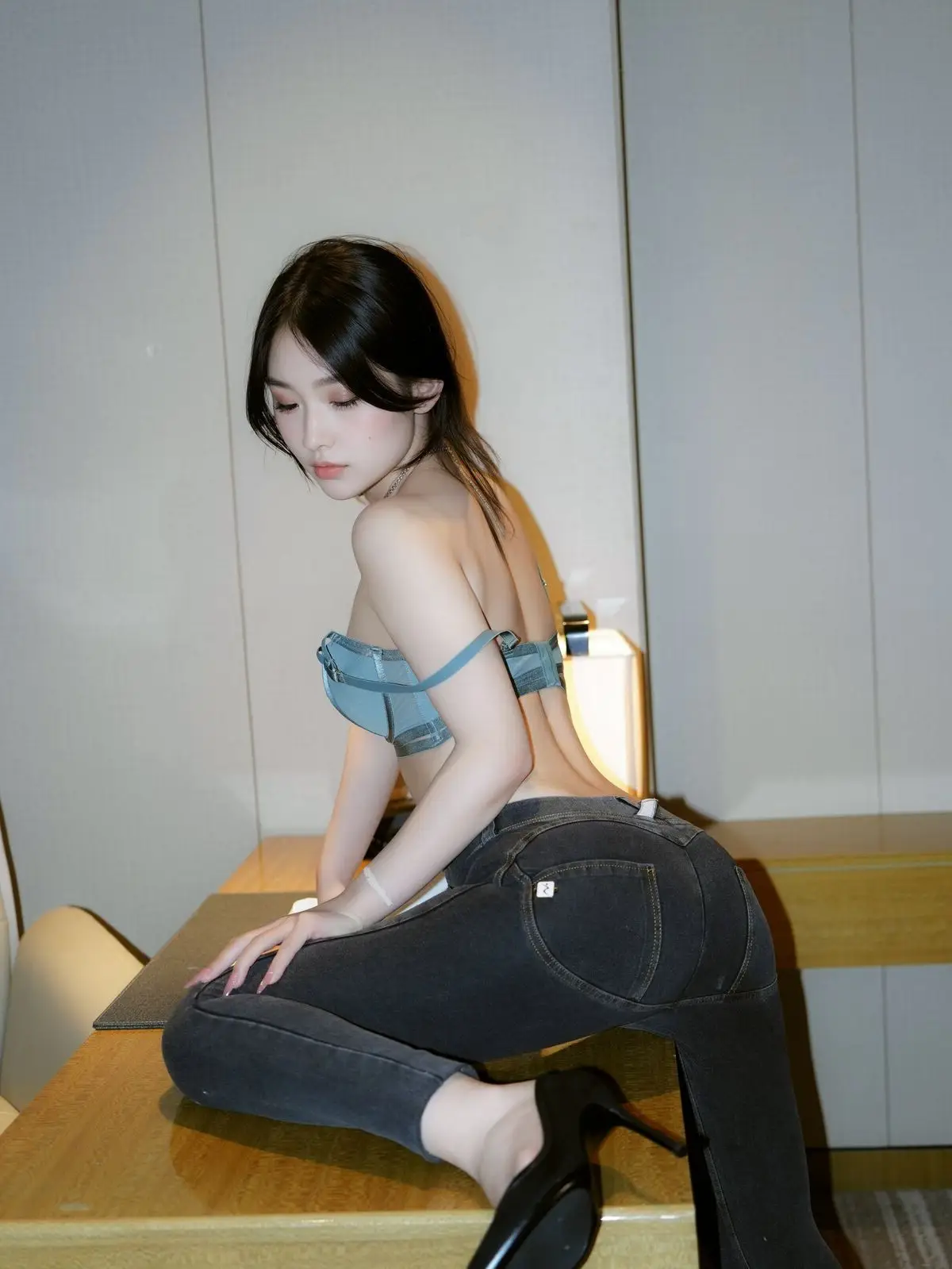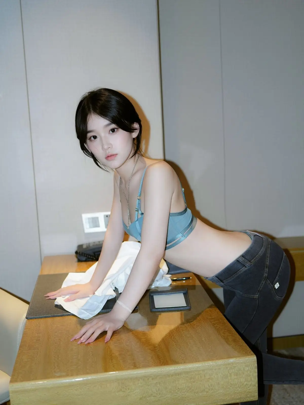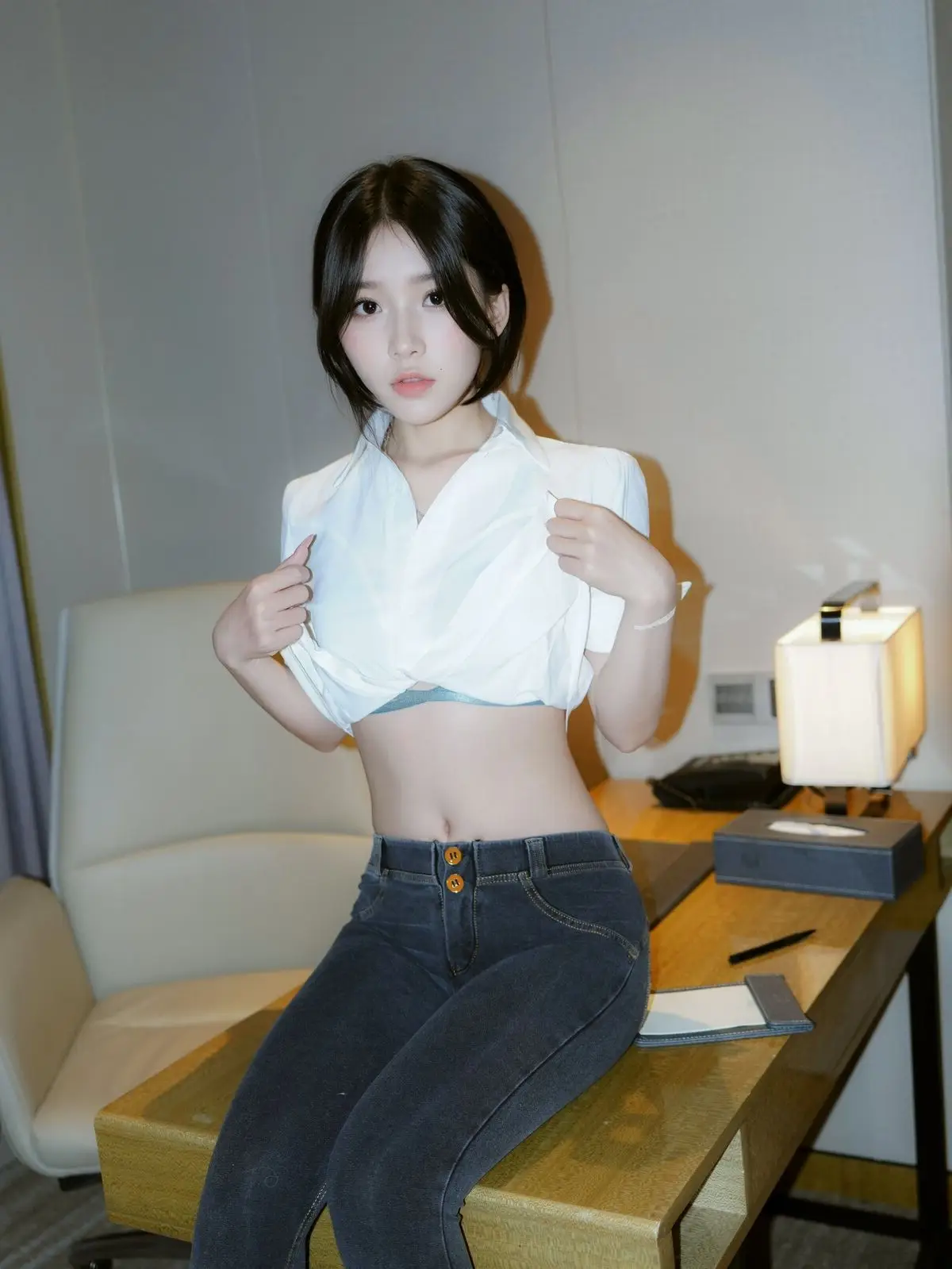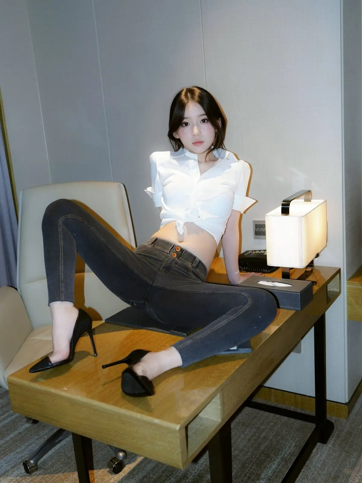 This stunning image focuses on Zhi Zhi, a captivating XiuRen intern secretary, exuding both professionalism and allure in her workspace. She is elegantly dressed in a white crop top shirt, paired with dark trousers and black high heels, accentuating her slender figure and modern fashion sense. Zhi Zhi’s confident pose at the desk, her engaging gaze, and a subtle smile convey an irresistible charm. She not only embodies a diligent secretary but also showcases a confident and subtly sensual presence. The photograph skillfully balances office elegance with personal appeal, inviting viewers to discover more about the beautiful Zhi Zhi.#ZhiZhi #InternSecretary #XiuRen #OfficeFashion #AlluringModel #OfficeLady #OL #jean