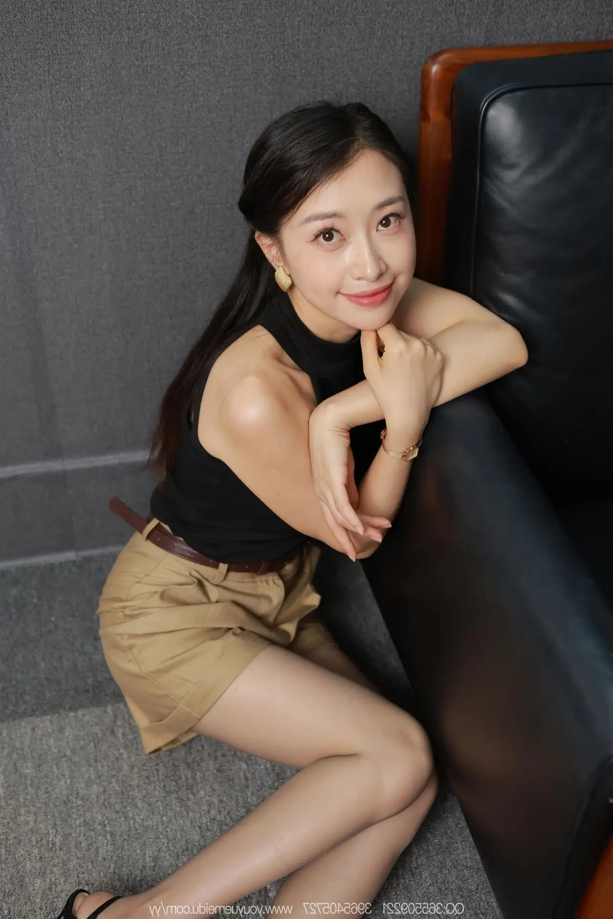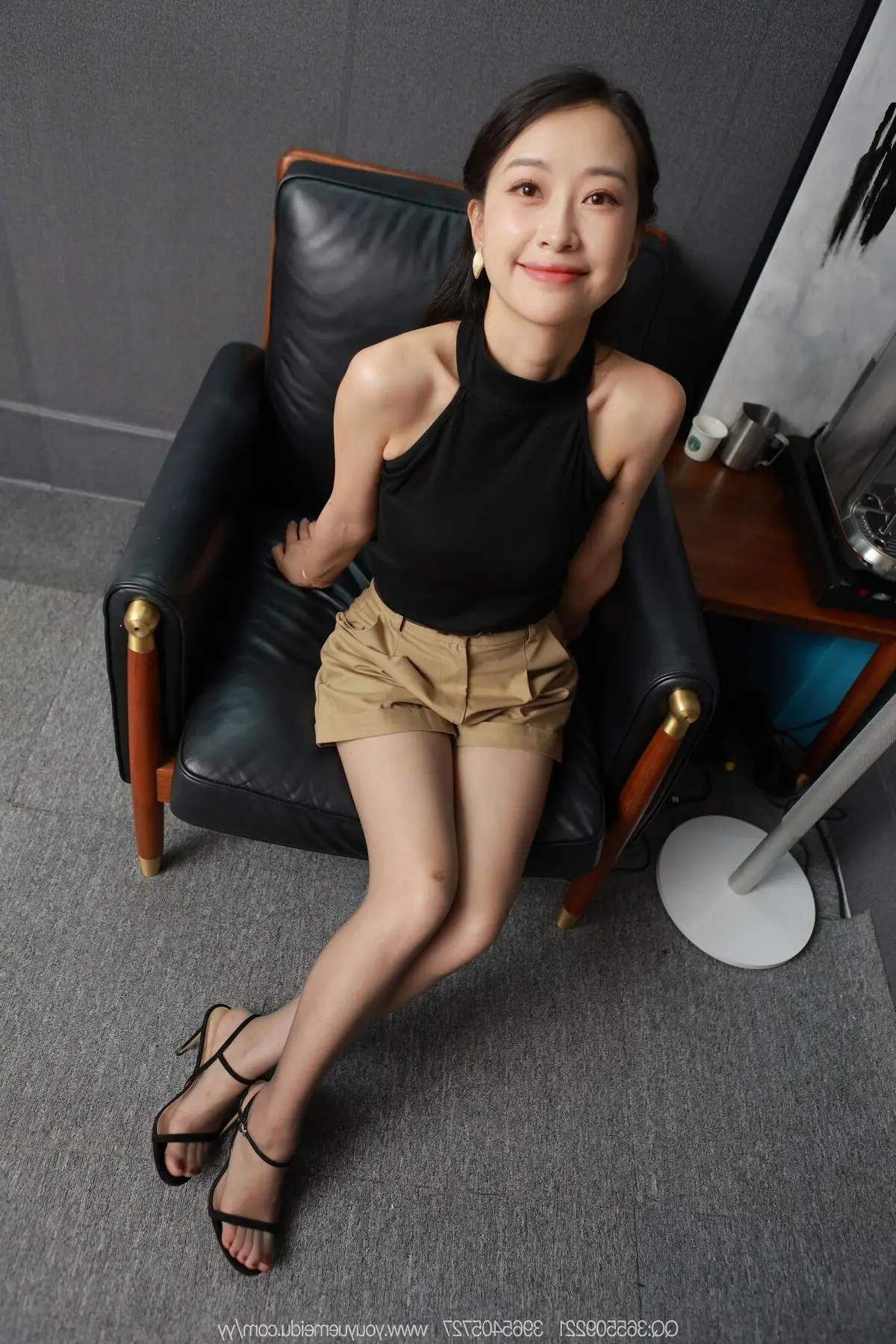 In this IESS SXJ No.2103 photoshoot, model Xiao Jie exudes an elegant charm and confident allure. She poses gracefully on a luxurious black leather armchair, dressed in a simple yet sophisticated ensemble: a chic black sleeveless top paired with stylish khaki shorts. Her long, slender legs are accentuated by fashionable high heels. A gentle gaze and subtle smile highlight her serene demeanor and professional grace. The minimalist modern setting further emphasizes Xiao Jie's natural beauty and captivating presence, creating artistic moments filled with emotion and timeless style.#IESS #XiaoJie #ChineseModel #ElegantStyle #FashionPhotography #OfficeLady #OL #Secretary