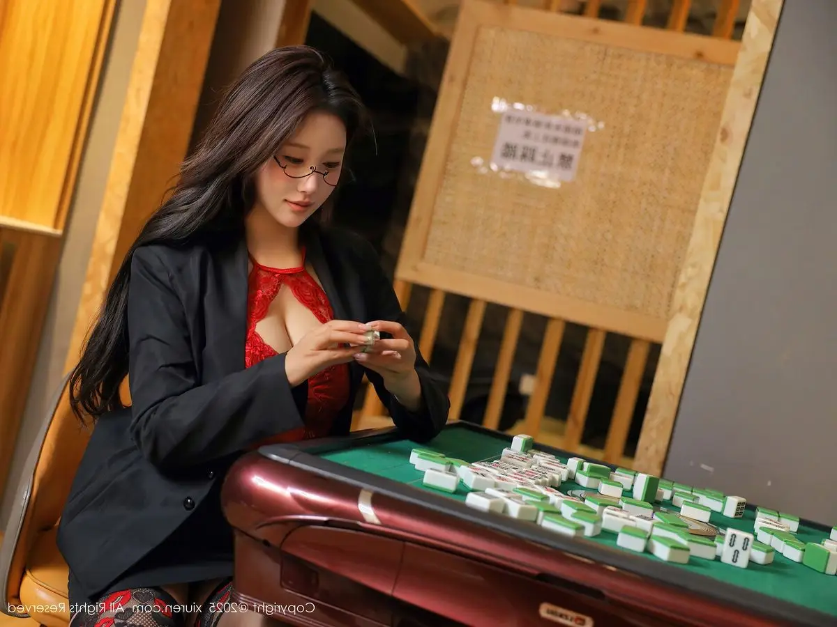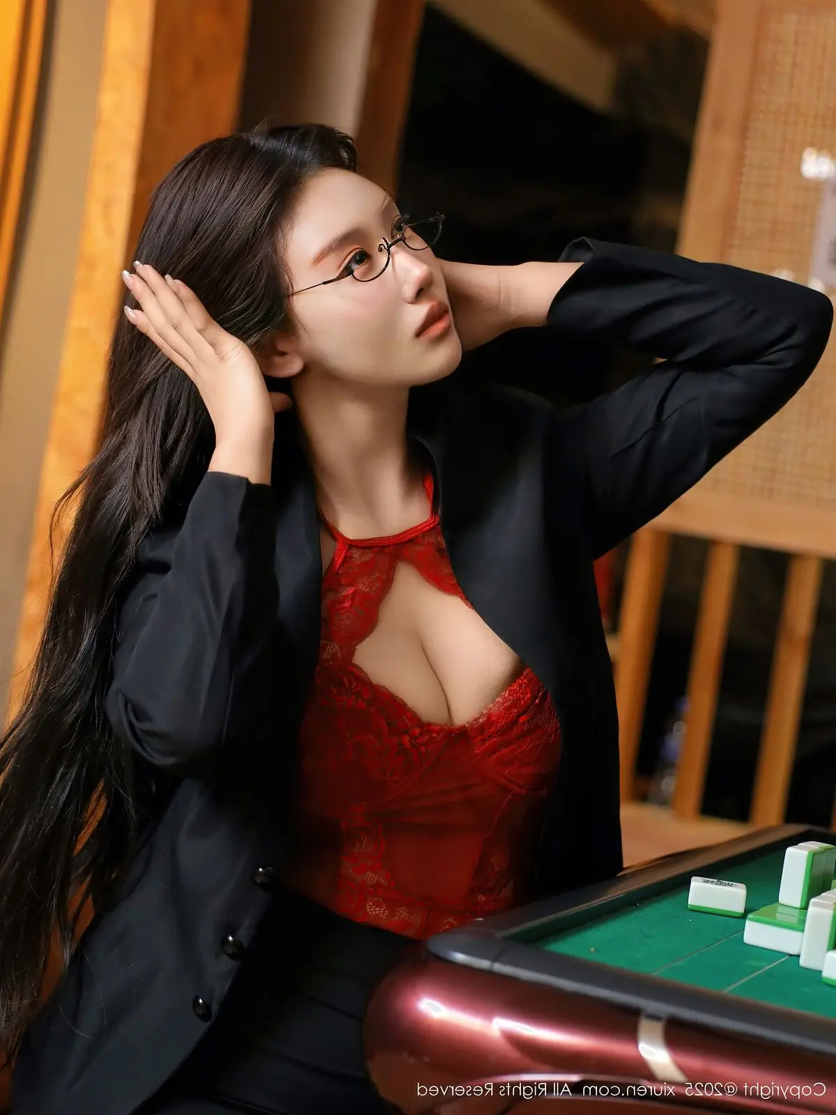 The XiuRen No.10614 photo collection features Jin Yun Xi Yuki a model possessing captivating beauty and a distinctive style. In this image she appears confidently in a sophisticated black blazer paired with a seductive red lace top creating a delicate yet alluring contrast. Her sharp gaze behind intellectual glasses and confident demeanor exude an irresistible charm. The way she gracefully places her hands behind her head and on her chest not only subtly highlights her figure but also showcases her relaxed professionalism. The entire setting combined with soft lighting accentuates Jin Yun Xi Yuki's elegant yet enchanting beauty promising an impressive visual experience for viewers.#JinYunXiYuki #XiuRen #SeductiveModel #FashionStyle #ModernBeauty