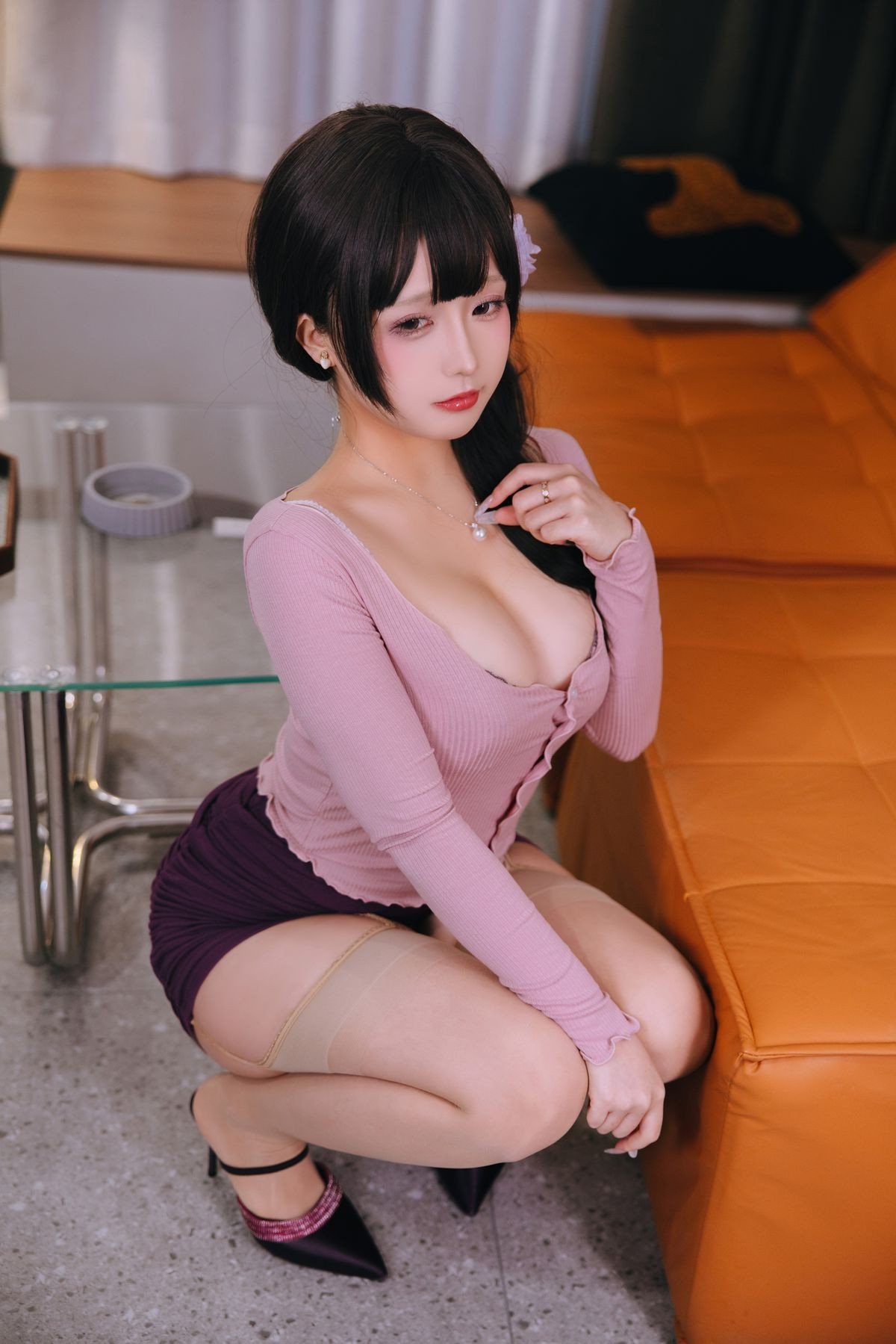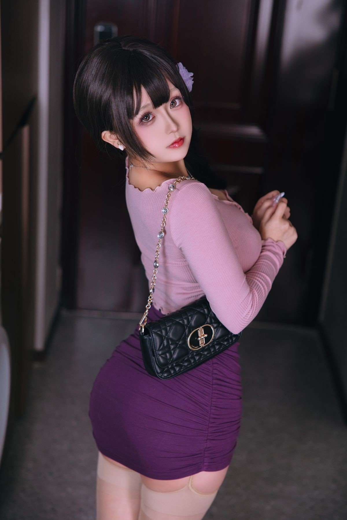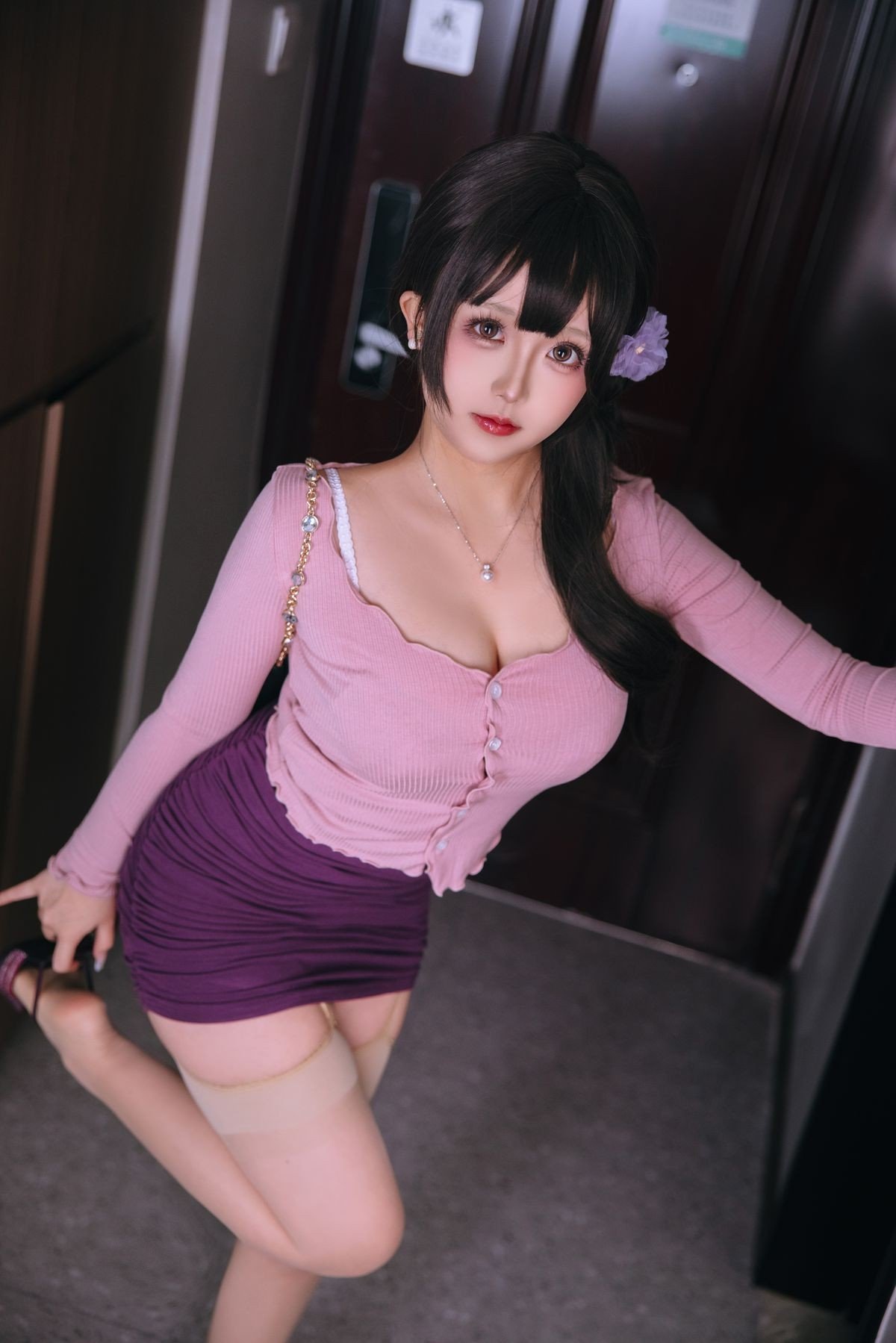 This captivating image features Coser Ri Nai Jiao embodying the alluring Stepmom persona. She radiates a sweet charm with her long dark hair adorned by a delicate purple flower. Her ensemble a fitted long-sleeved pink top paired with a chic dark purple mini skirt gracefully accentuates her figure. Ri Nai Jiao's gentle yet mesmerizing gaze adds to her captivating presence creating an elegant and subtly sensual appeal. A small black handbag and a refined necklace complete her sophisticated look. This is Part1 of Ri Nai Jiao's remarkable cosplay series offering a unique visual treat for cosplay enthusiasts.