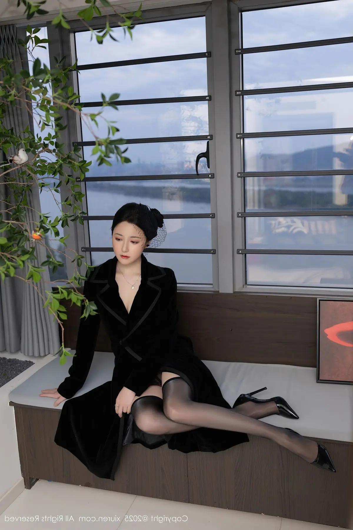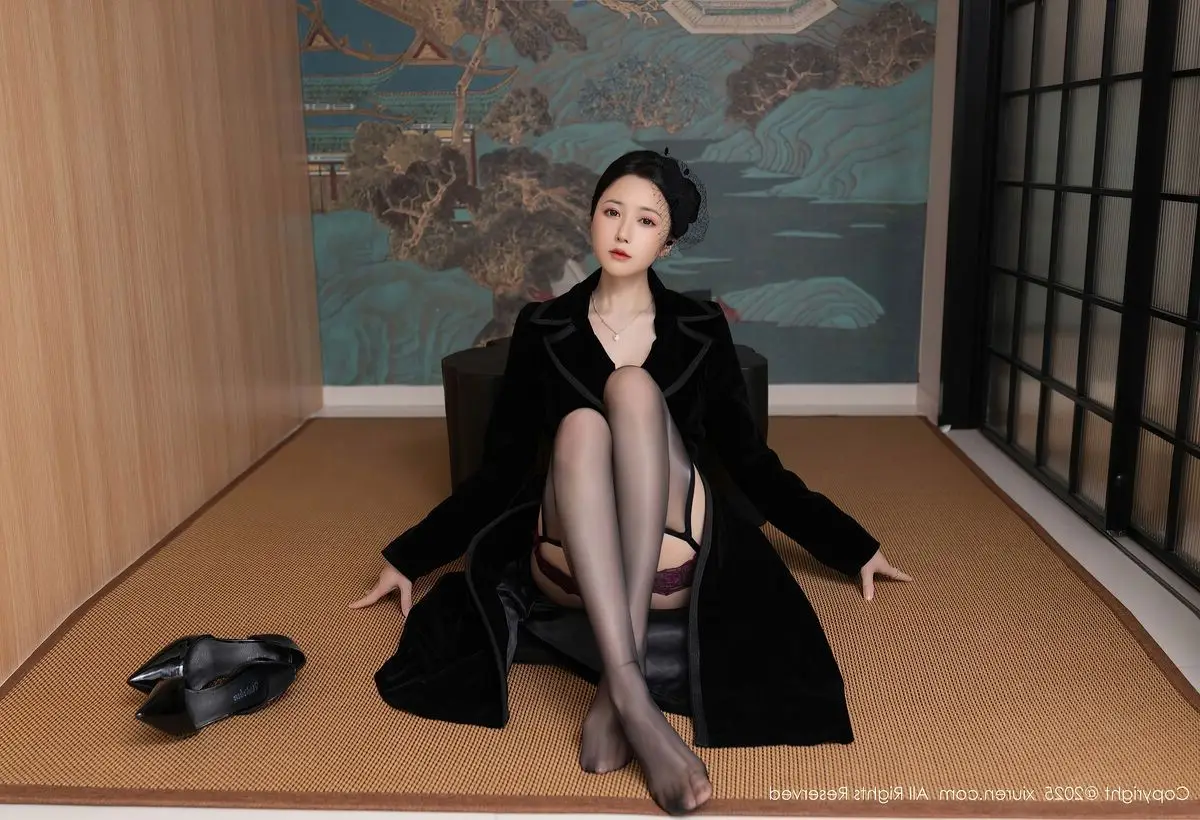 In the XiuRen No.10564 photo series, model Yu Zi Jiang Fish captivates with her seductive yet elegant demeanor. She dons a luxurious black coat, artfully revealing alluring sheer stockings, creating a subtle and refined contrast. With a pensive gaze and graceful reclining pose on a traditional mat, Yu Zi Jiang Fish exudes a mysterious and enchanting beauty. The distinctly East Asian backdrop featuring a classic landscape painting further accentuates her artistic aura. This emotionally rich photographic work harmoniously blends modern sensuality with traditional aesthetics, affirming Yu Zi Jiang Fishs irresistible charm and timeless appeal.