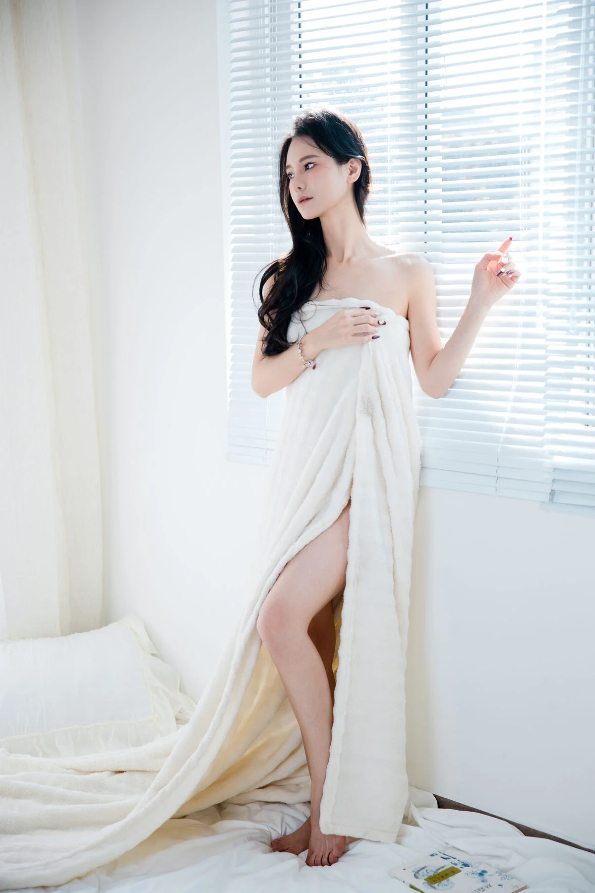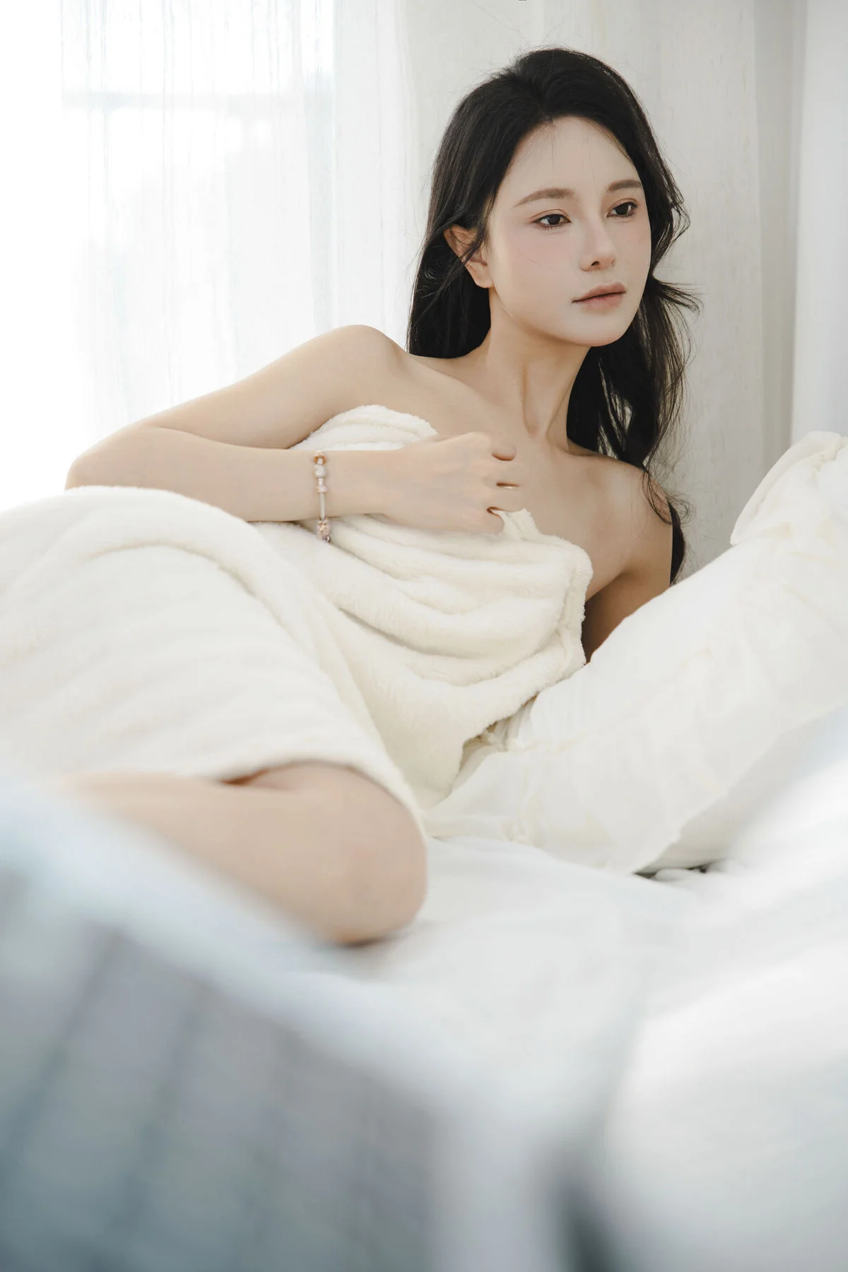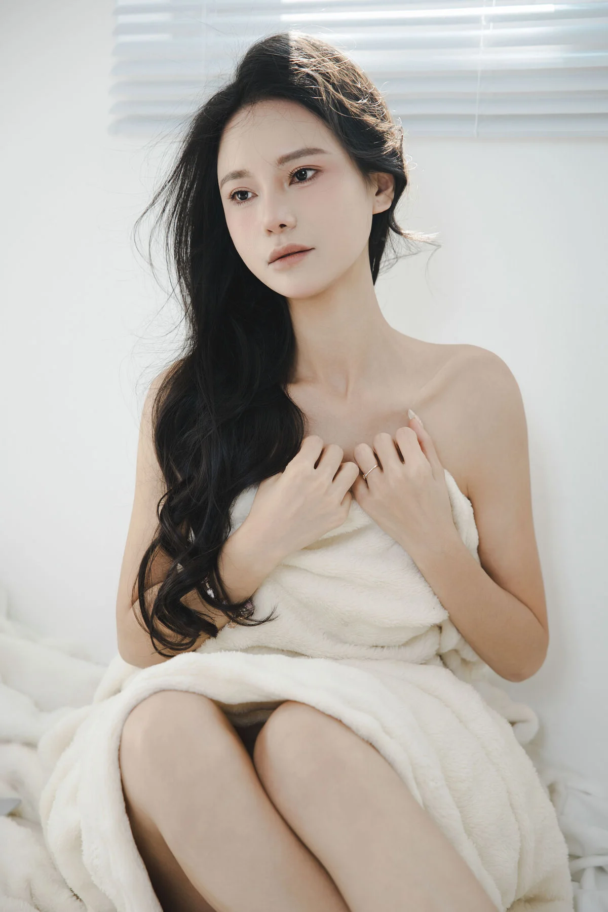 In the YiTuYu Vol.8756 collection, Sha Sha emerges with a deeply pensive and fragile beauty. Wrapped in a pristine white sheet, her downcast gaze suggests a soul lost in private emotions. The image evokes the profound inner moments of a girl perhaps experiencing loneliness or heartbreak much like a fallen flower in the rain. The pure white setting accentuates Sha Sha's ethereal elegance and captivating vulnerability. This artistic portrayal masterfully captures emotional depth inviting viewers to contemplate the hidden narratives within her delicate expression. It is a compelling visual study of introspection and grace.#YiTuYu #ShaSha #PensiveBeauty #FragileElegance #ArtisticPortrait