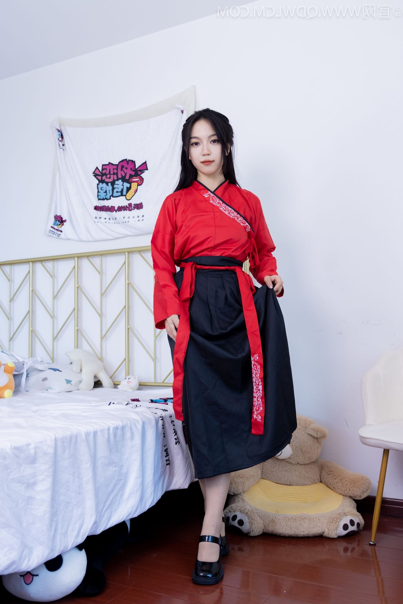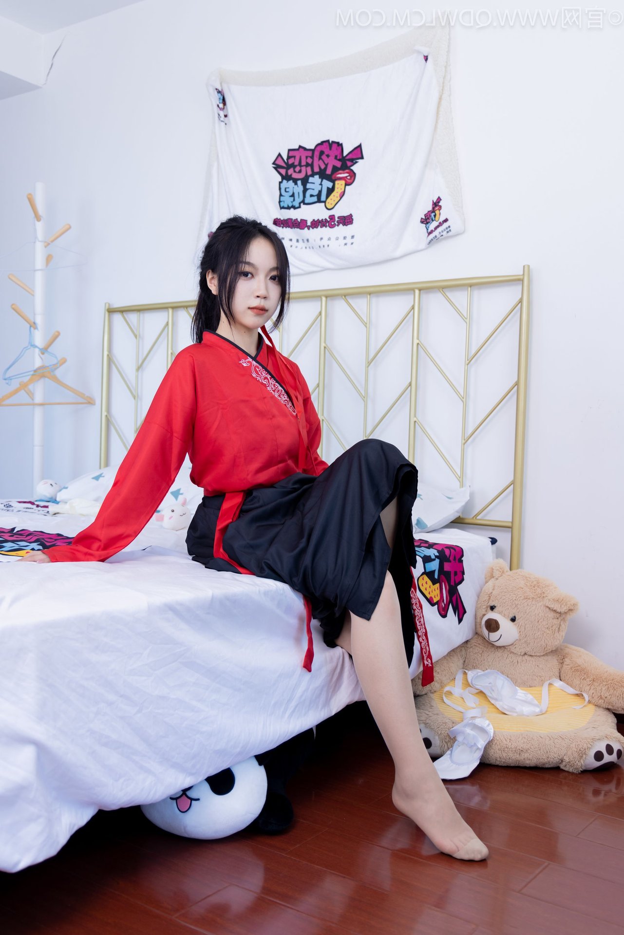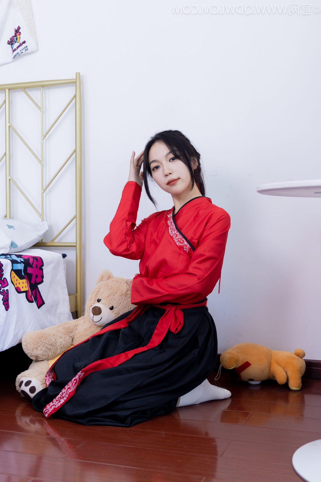 Immerse yourself in the sweet and elegant beauty of Chinese Model No.2330 Shasha. This graceful young woman shines in a refined red and black Hanfu ensemble, a harmonious blend of traditional charm and modern style. Her comfortable pose beside a large teddy bear on the warm wooden floor exudes a sense of peace and gentleness. Her soft gaze and subtle smile highlight her pure and captivating beauty. The photograph not only showcases the allure of Hanfu attire but also clearly depicts the model's confident and charming demeanor. This image represents the fascinating interplay between classical culture and contemporary fashion trends offering a visually rich and emotional experience.Stories