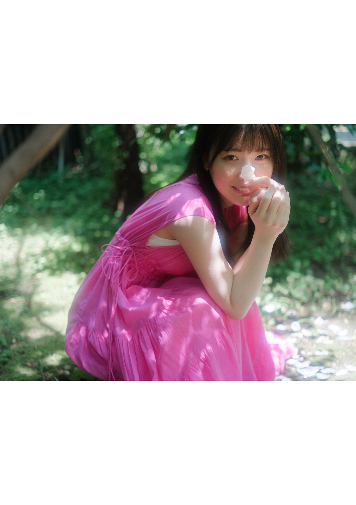 In this captivating image, Japanese model Mio Ishikawa (石川澪) shines with pure and radiant beauty. She appears in a vibrant pink dress, highlighting her smooth, fair skin and lustrous dark hair. With her hands gracefully posed above her head, Mio Ishikawa conveys a gentle, alluring expression. Natural light filters through lush green foliage, creating sparkling streaks of light on her, evoking a sense of a peaceful afternoon in an outdoor setting. This lovely moment fully captures Mio Ishikawa's innate charm, inviting viewers to explore more of the impressive とられち Part01 collection.