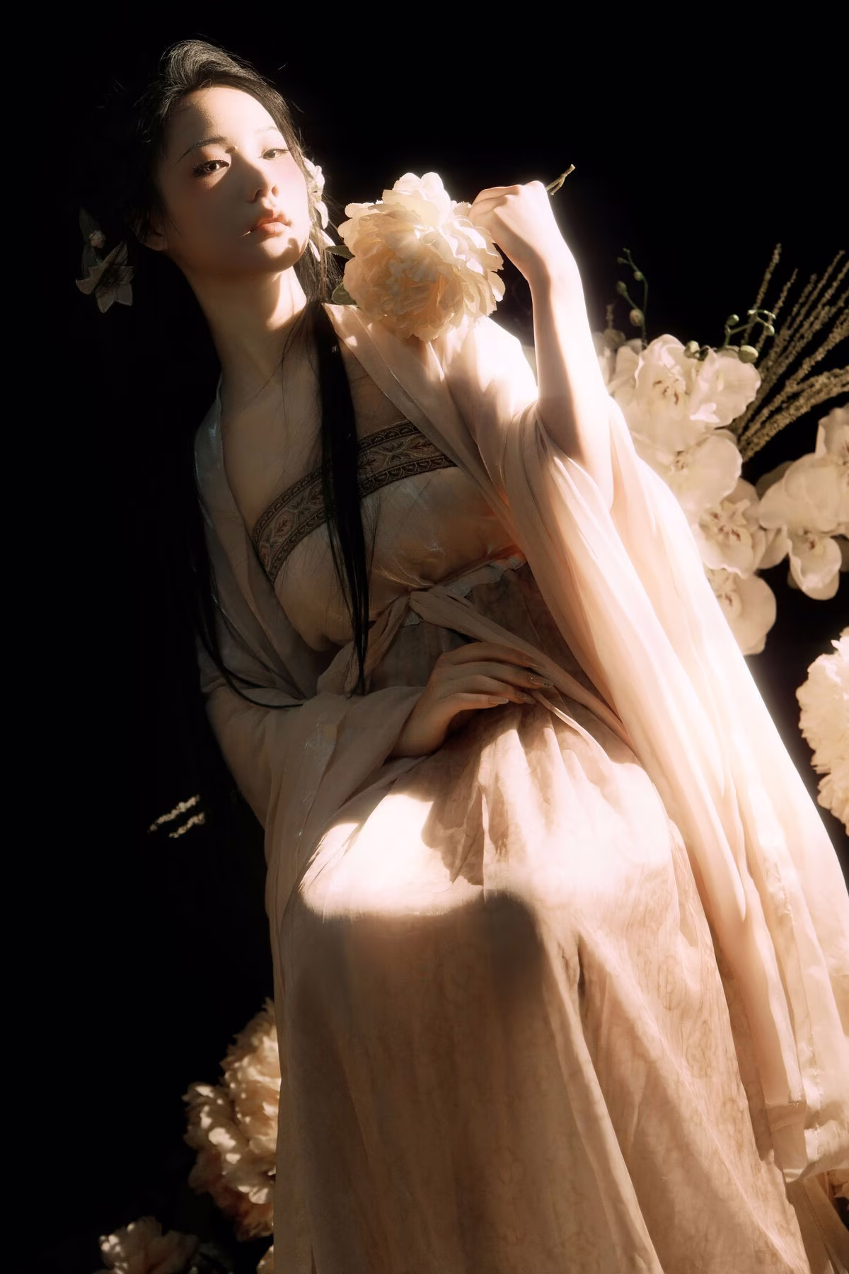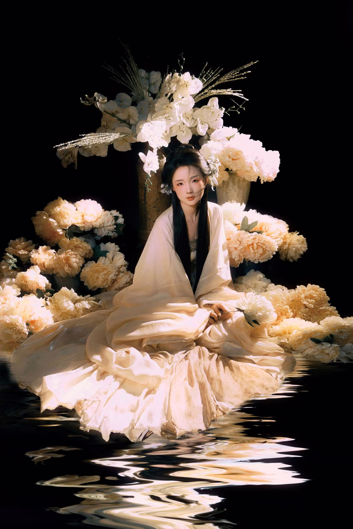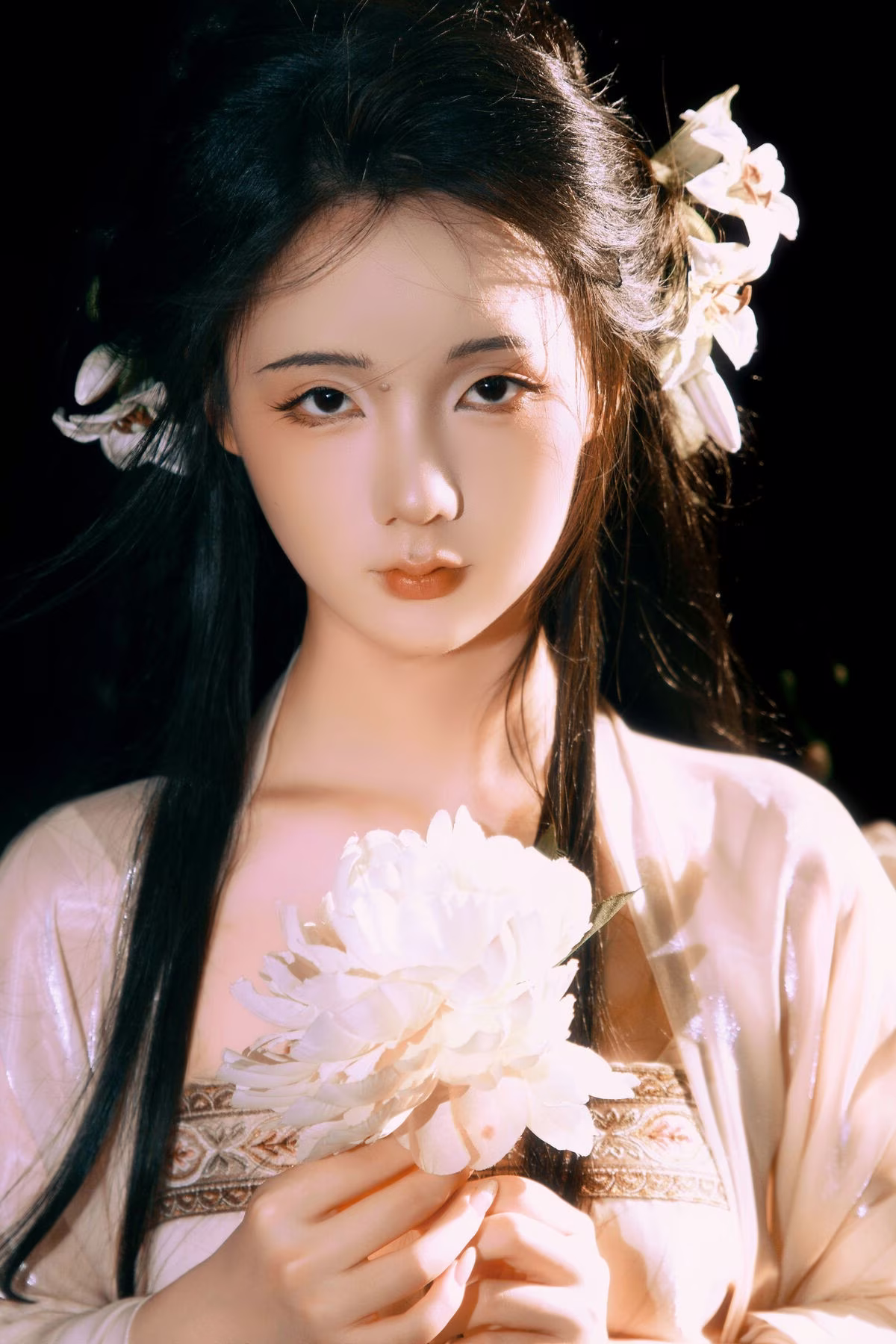 This exquisite photograph captures Ren Gui Yu Er, resembling a fairy from ancient tales. Dressed in refined classical attire with flowing dark hair, she emanates an ethereal and otherworldly beauty. Soft golden light gently caresses her face, highlighting delicate features and a contemplative expression, creating a poetic and mystical scene. The harmonious blend of her human beauty with pristine white flowers further enhances the purity, transforming this YiTuYu Vol.8284 piece into a true 'art language'. Every detail, from her dreamy gaze to the gracefully draped silk garment, is meticulously crafted, inviting viewers into a world of East Asian grace and elegance. This is not just a picture, but a deeply moving visual experience.