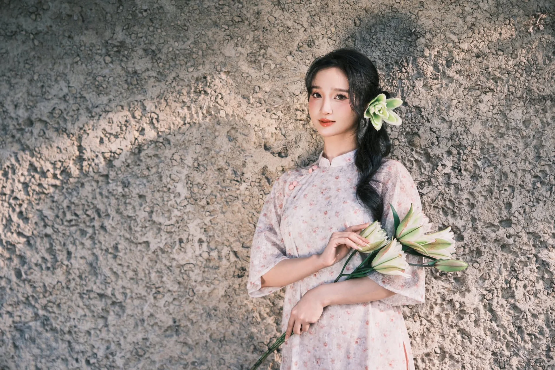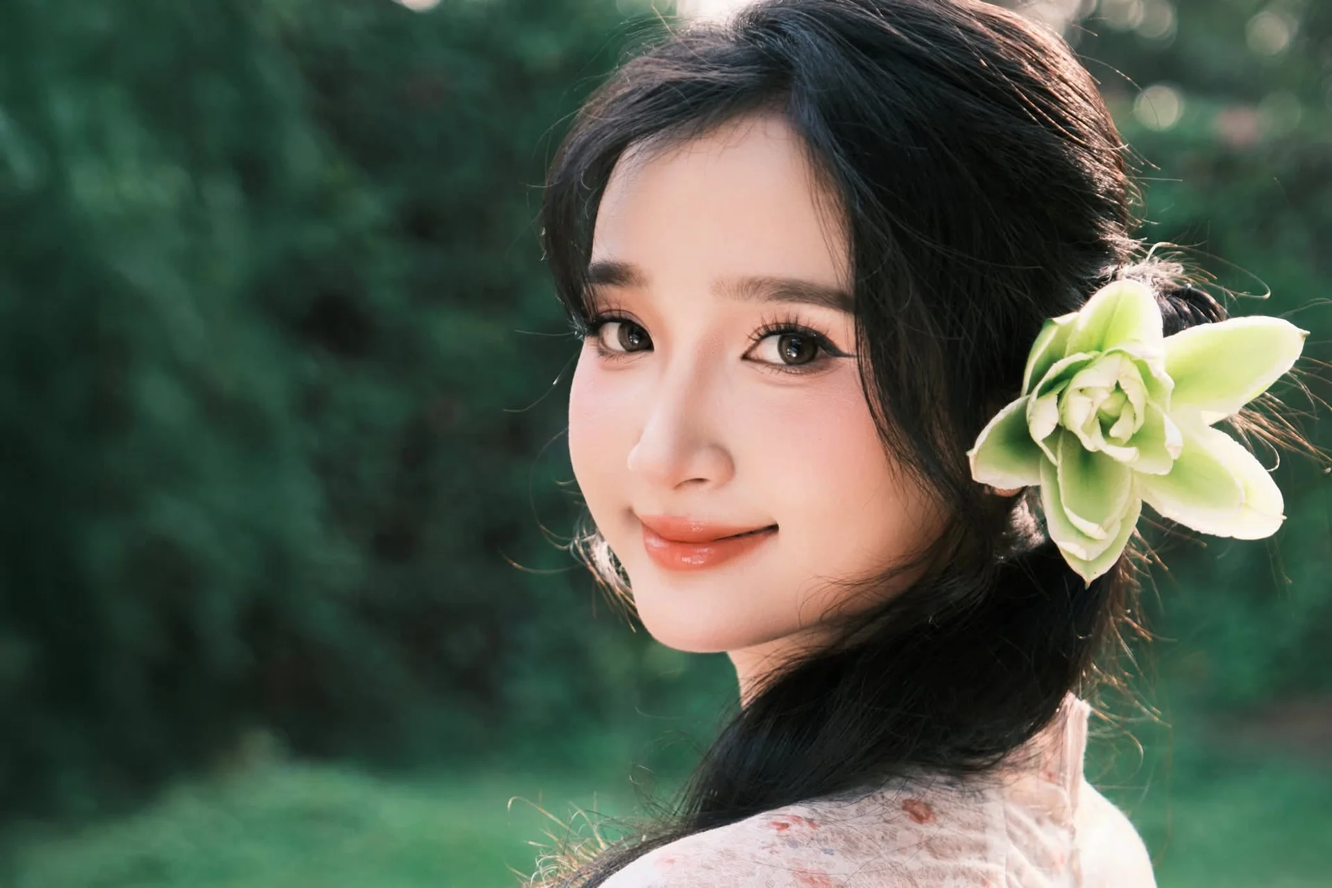 This moment feels like a poetic cinematic frame where human beauty and nature seamlessly intertwine. The girl appears with a gentle aura, her distant gaze carrying a sweet sense of nostalgia that captivates the soul. Her outfit, featuring delicate floral patterns on soft fabric in pale peach tones, highlights her feminine grace and elegant fashion sense. The subtle touch of a green flower tucked into her hair, complemented by the white lilies in her hand, creates a harmonious color palette that feels both vintage and timeless. The golden twilight light filters through the foliage, wrapping the FB_IMG_1767877960694.jpg scene in an enchanting natural glow. This is more than just a portrait; it is a celebration of traditional beauty within a contemporary setting, evoking memories of peaceful afternoons in a forgotten garden. The composition and soft focus enhance the dreamy atmosphere, making it a perfect inspiration for those who love romantic and minimalist aesthetics.#VintageAesthetic #SoftGirlStyle #NaturePhotography #DreamyVibes #FloralFashion