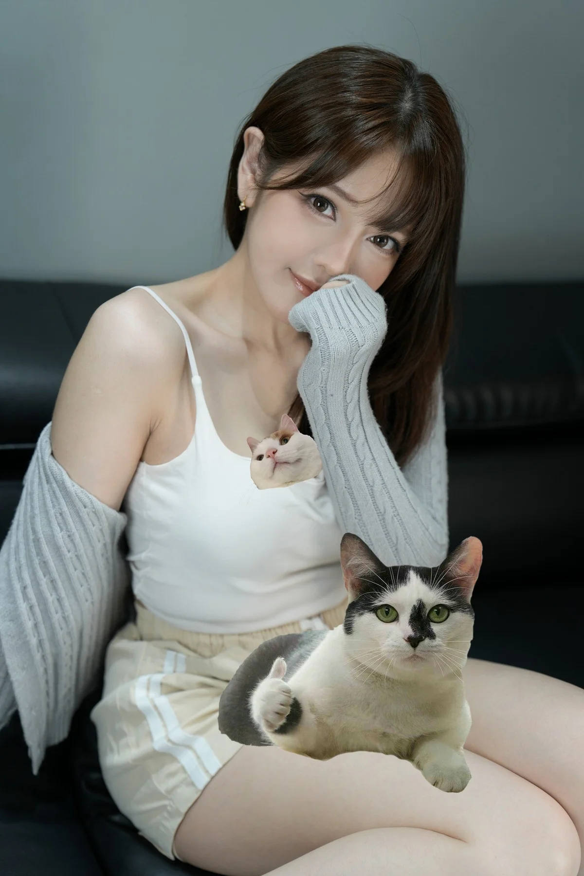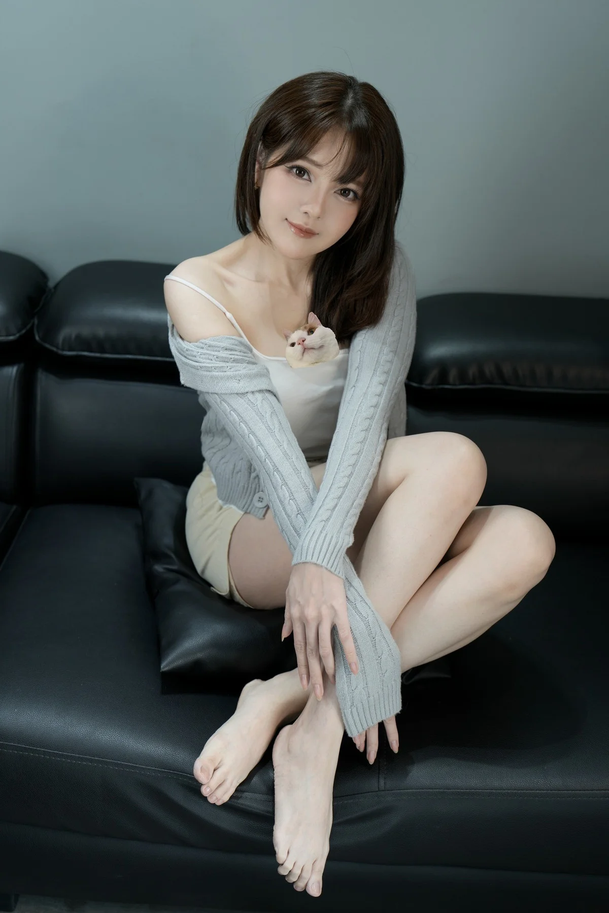 Captured in a moment of pure serenity, Trang Bit Tet radiates a gentle charm that feels both intimate and inspiring. Dressed in cozy everyday wear, she effortlessly blends comfort with style by layering a soft grey cable-knit cardigan over a simple white camisole. The neutral color palette and minimalist setting highlight her porcelain skin and the soft, soulful expression in her eyes. There is a sense of quiet elegance in her pose, sitting comfortably on a dark leather sofa that provides a sharp yet sophisticated contrast to her bright outfit. This visual story is less about fashion and more about the feeling of a peaceful afternoon spent in solitude. Her natural charisma shines through every detail, from the way the fabric drapes over her shoulders to her subtle, captivating smile. It is a beautiful testament to the girl next door aesthetic, proving that true beauty often lies in simplicity and authentic emotions that resonate deeply with the viewer.#TrangBitTet #CozyVibes #NaturalBeauty #SoftGirlStyle #PortraitPhotography