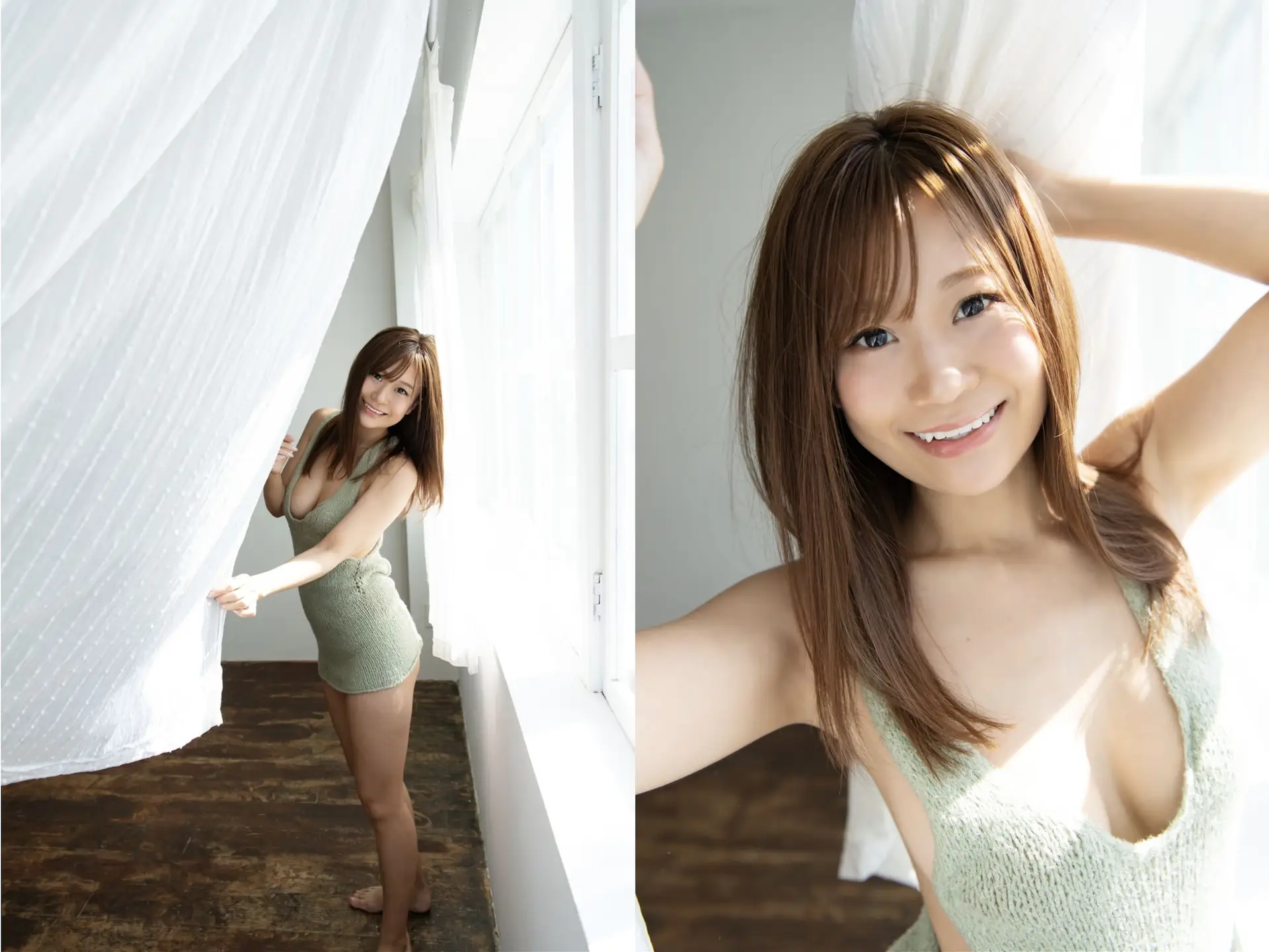 Akutsu Mao radiates a captivating and cherubic beauty in this enchanting image. She reclines gracefully on a warm wooden floor her long flowing hair spread naturally around her. Gentle sunlight streams in softly illuminating her figure and creating an ethereal glow. Her simple light green attire accentuates her delicate features and elegant posture. Akutsu Mao's subtle smile and alluring gaze convey a sense of serene confidence and innate charm. This moment captures not just a visual but also the tranquil emotions and captivating allure that she effortlessly embodies making it a truly mesmerizing portrait.#AkutsuMao #CherubicBeauty #JapaneseModel #SoftLight #AlluringPose