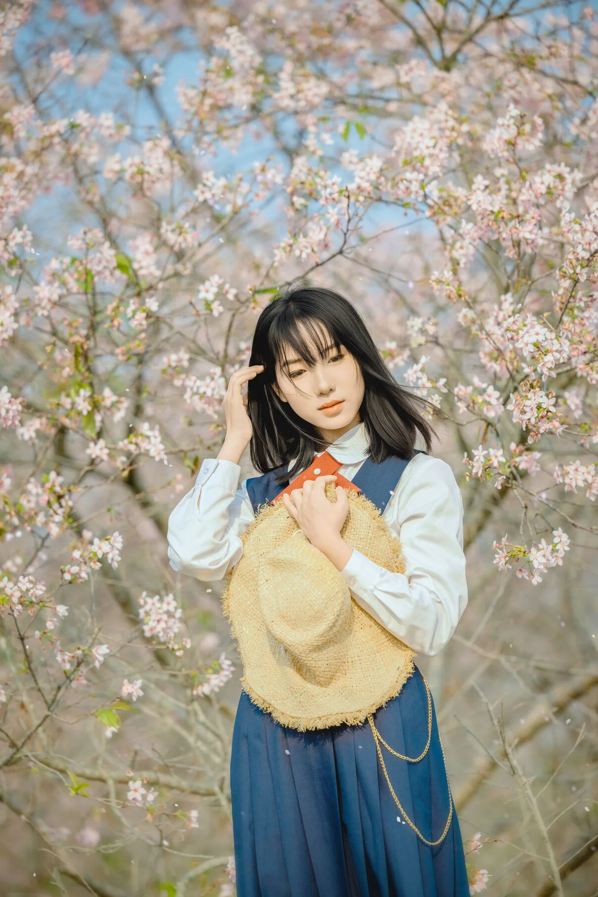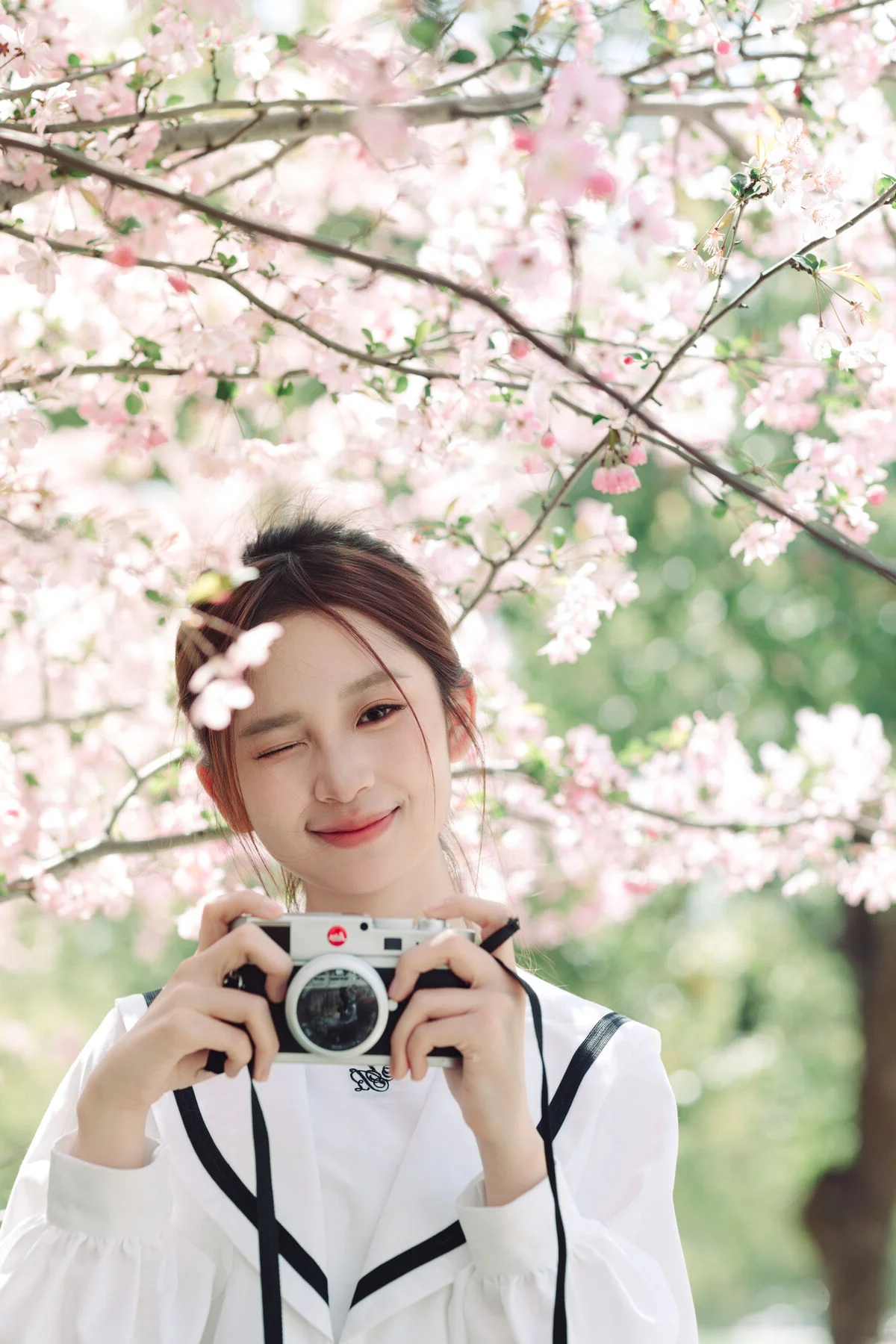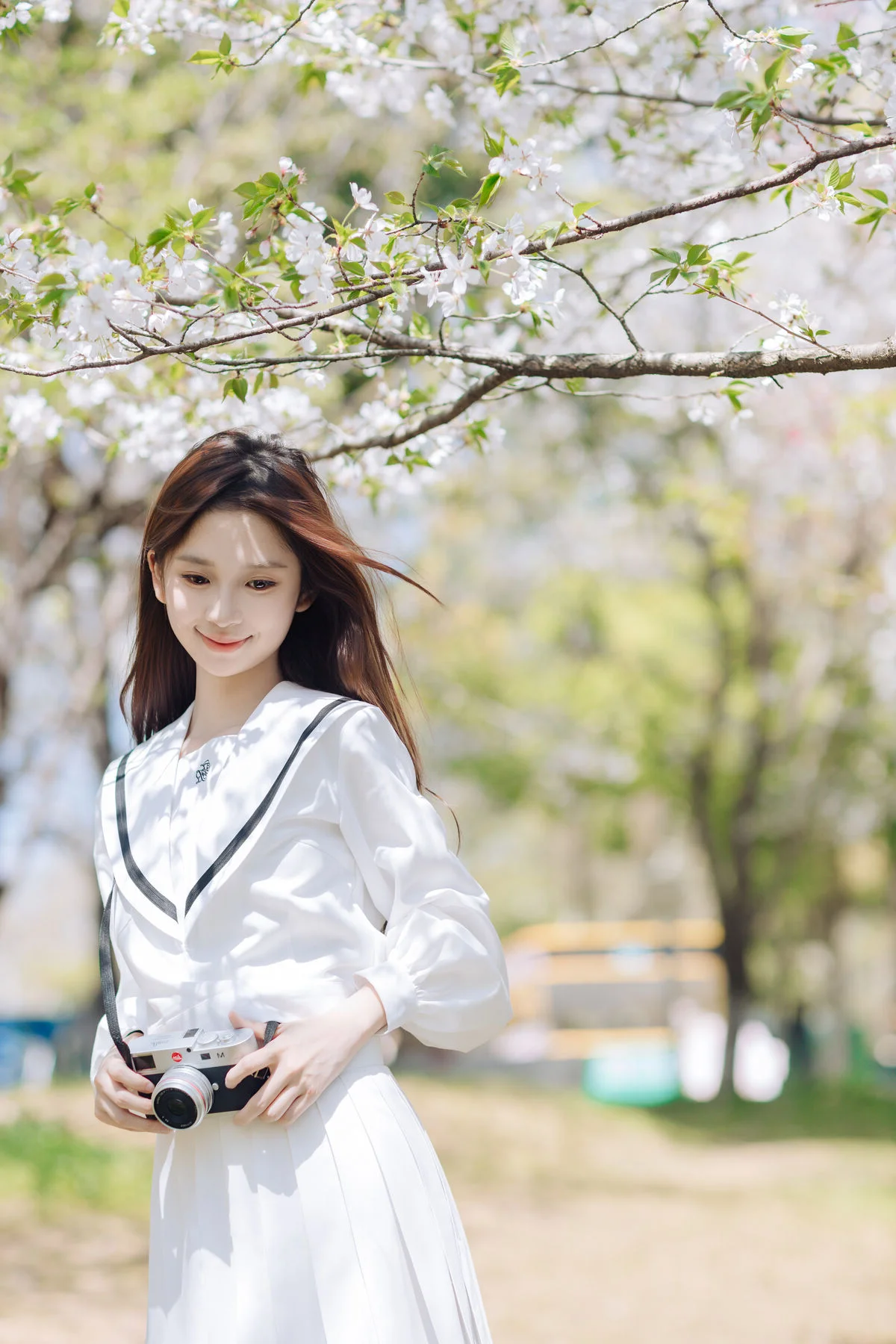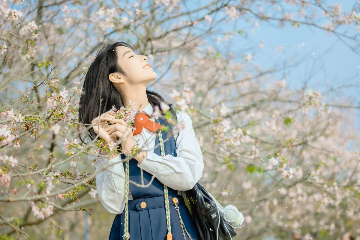 Spring Muse: Pure Elegance in JK Uniform Amidst Blossoms