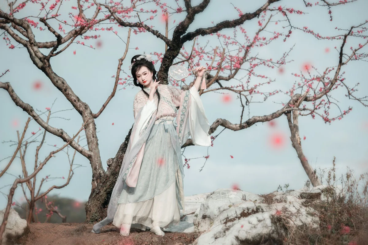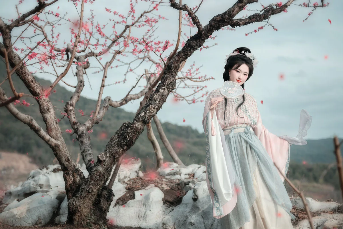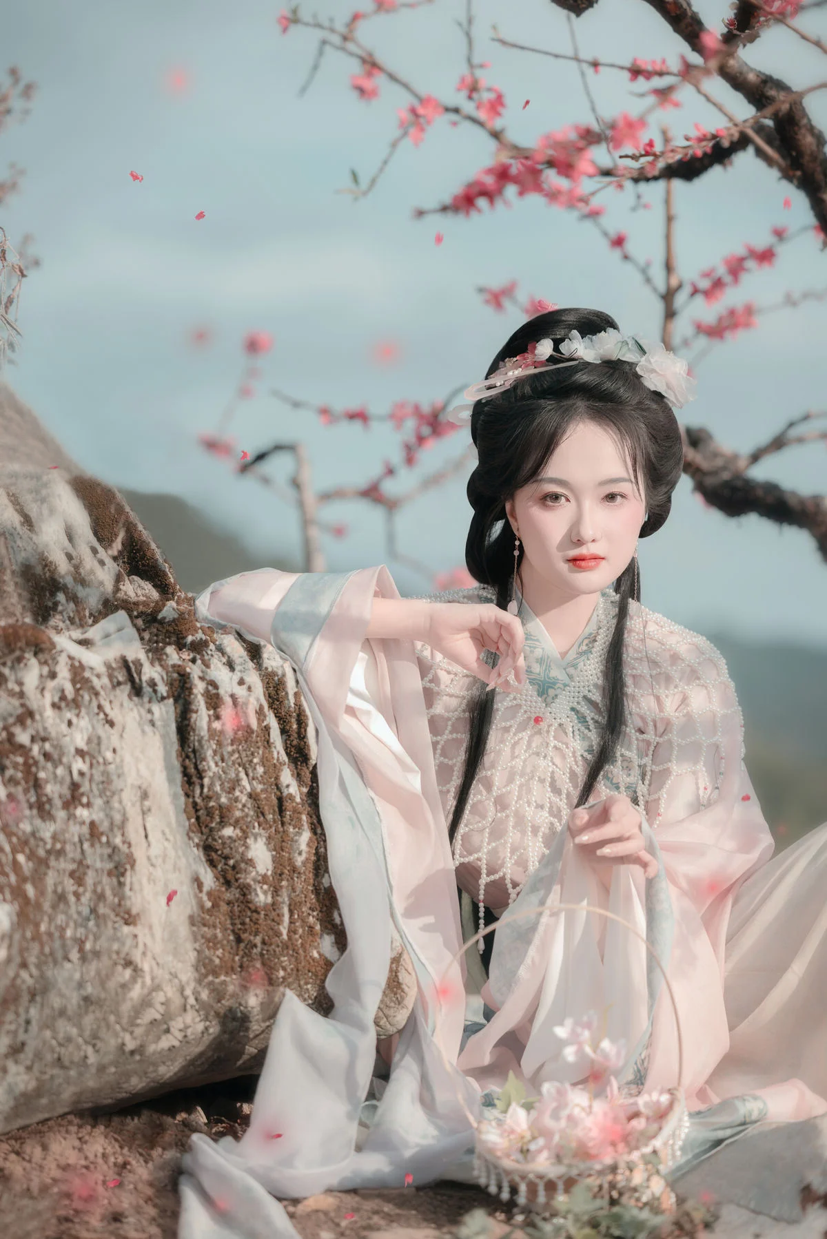 This captivating image transports us into a poetic realm where human grace meets the ethereal breath of spring. Standing beneath the blooming blossoms Da Wai Wai Ge embodies the essence of a classical heroine from ancient legends. Her Hanfu ensemble crafted from delicate and flowing fabrics dances gracefully with the gentle breeze creating a sense of weightless elegance. The harmonious blend of soft pink and pale blue tones mirrors the natural palette of a spring morning offering a visual experience that is both soothing and sophisticated. Her gentle gaze and fluid body language exude a serene aura capturing a moment of profound stillness and nostalgic beauty. The misty mountains in the background and the soft natural light accentuate her delicate features and the intricate details of her traditional attire. This visual masterpiece is more than just a fashion shoot it is an artistic exploration of cultural heritage and the timeless connection between soul and nature inviting the viewer to lose themselves in a dreamlike landscape of tranquility.#TraditionalFashion #SpringAesthetic #HanfuModel #VisualArt #EtherealVibes