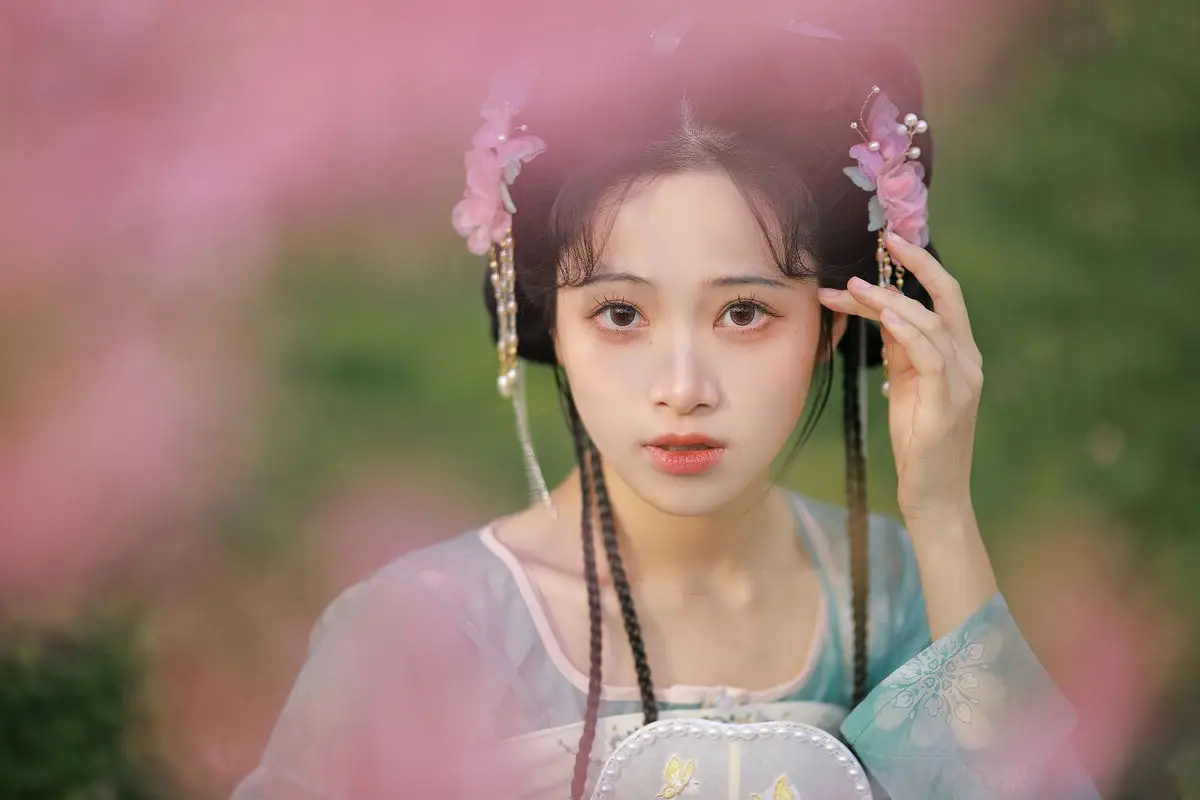 Step into a world where time stands still and the air is filled with the sweet scent of blooming peach blossoms. In this collection, Qi Luo Sheng De Xiao Su Su embodies the ethereal essence of spring, appearing like a goddess stepped out of a classical painting. Her traditional Hanfu attire, featuring delicate layers of flowing chiffon in blush pink and ivory white, creates a mesmerizing movement with every soft breeze. The fashion choice here is impeccable, blending perfectly with the natural backdrop to evoke a sense of purity and timeless elegance. The visual storytelling focuses on her graceful posture and soulful gaze, capturing a moment of profound tranquility. The soft-focus lighting and pastel color palette enhance the romantic and nostalgic mood, making each frame feel like a poetic whisper. It is a masterful display of visual art that celebrates the harmony between feminine beauty and the fleeting splendor of nature, perfect for those seeking inspiration in minimalism and traditional aesthetics.