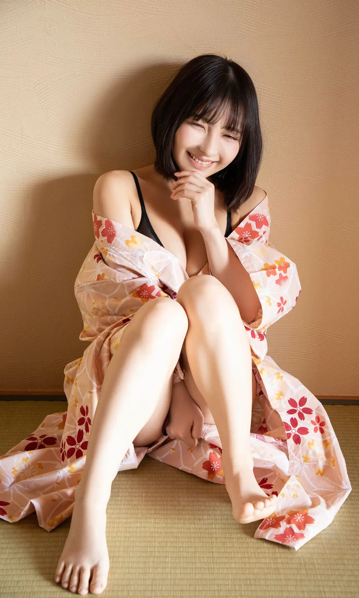 In the 'KiMi to Haru Ranman' photo collection from 週プレ PHOTO BOOK, JP TOOMI 十味 shines with a pure and radiant beauty, like the blossoming breath of spring itself. This charming Japanese girl is adorned in a traditional yukata with delicate cherry blossom patterns, exuding a gentle and captivating allure. Her bright smile, sparkling eyes, and natural, modest sitting pose perfectly capture the 'radiant spring' spirit that the photo book aims to convey. Toomi presents an image that is both innocent and full of vitality, leaving viewers enchanted by her pristine beauty and refreshing charm. This moment truly encapsulates Toomi's distinctive grace and appeal, a true embodiment of East Asian beauty.