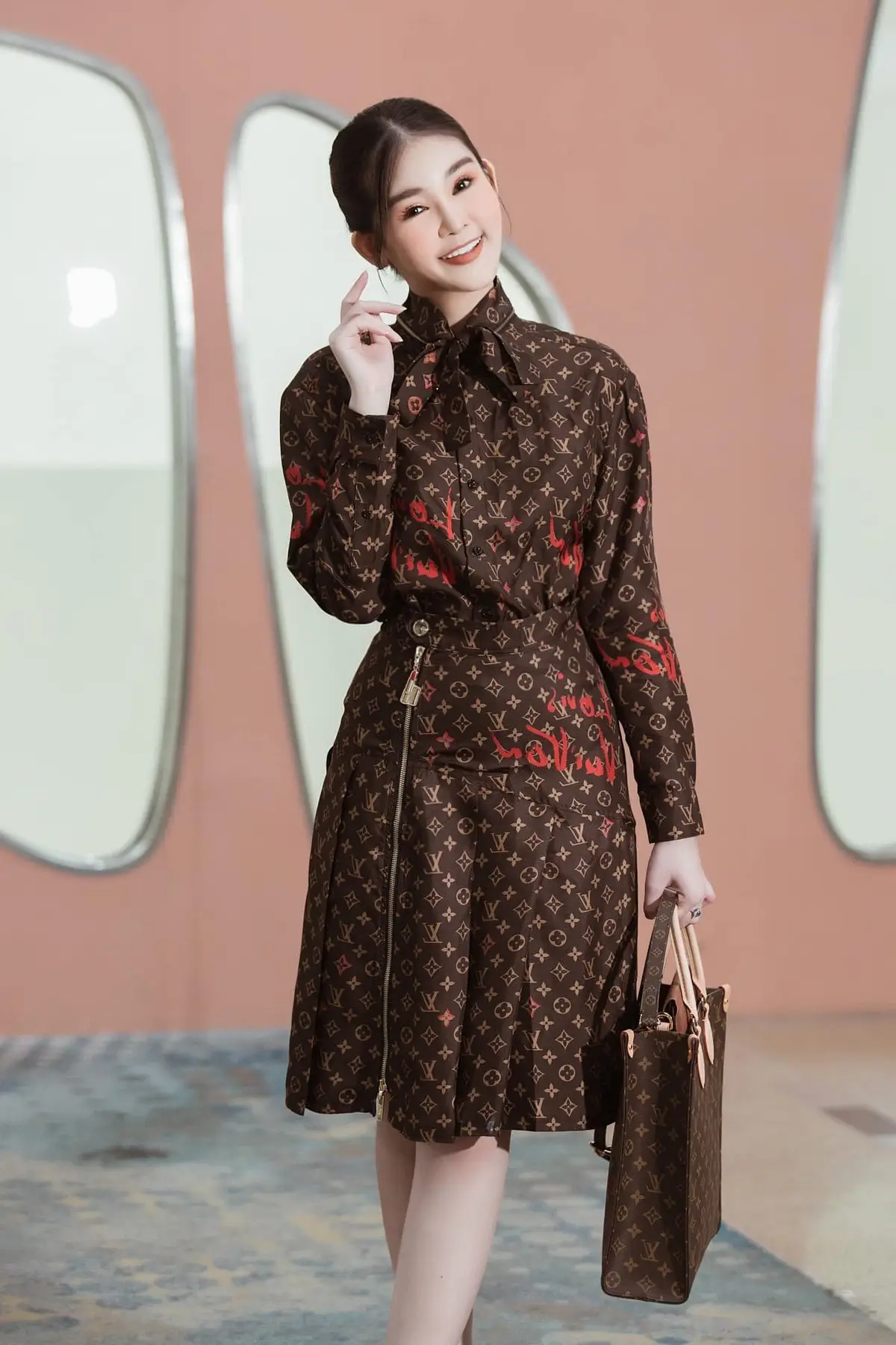 In the captivating XiuRen No.10571 collection, model An Ran presents a uniquely alluring style. She dons a modified student uniform, featuring a chic brown blazer paired with a distinctive striped tie. An Ran poses confidently on the patterned rug, her sharp gaze directed at the camera, exuding an irresistible charm. The exquisite blend of the uniform's elegance and An Ran's captivating demeanor creates artistic and emotional photographs. Her outfit, subtly highlighting her long, slender legs, offers an image that is both vibrant and mesmerizing. This photoshoot is a must-see for enthusiasts of bold fashion and An Ran's expressive artistry.
