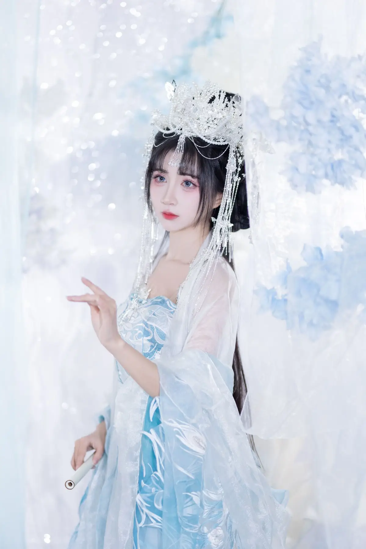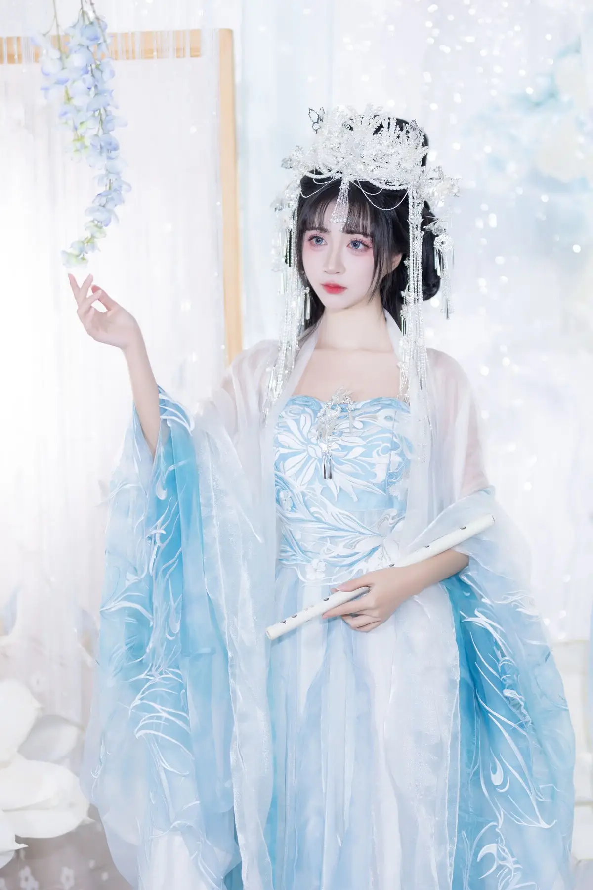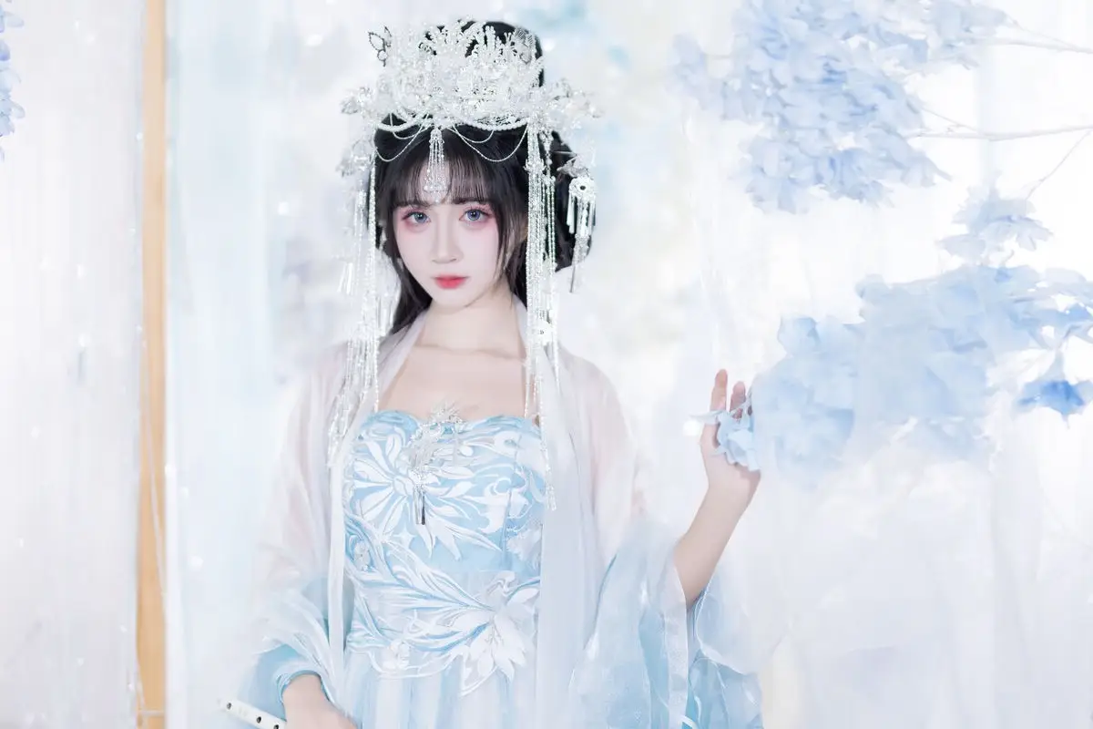 This image transports us into a fairytale world where the muse Qi Luo Sheng De Xiao Su Su appears with delicate and graceful beauty. Dressed in a pristine aqua and white traditional costume, she resembles a lost fairy, exuding purity and fragility. Every detail, from the elaborate updo adorned with sparkling hairpins to the soft flowing fabrics, is meticulously crafted, highlighting the model's noble and refined charm. The surrounding space, enveloped in white silk drapes and gentle flower clusters, creates an ethereal, dreamy backdrop, accentuating Xiao Su Su's captivating elegance. This YiTuYu Vol.8652 collection is not merely a series of photographs but a work of art, successfully capturing the timeless beauty of the muse.