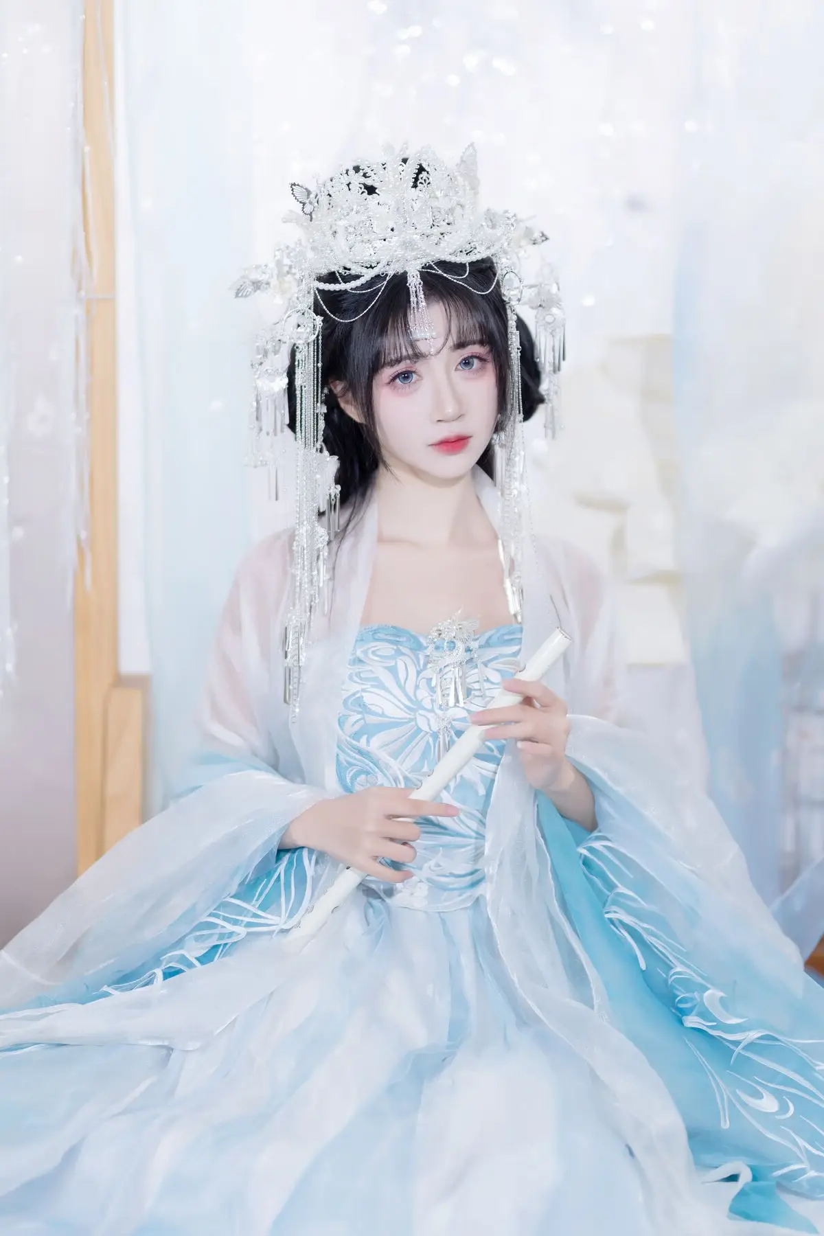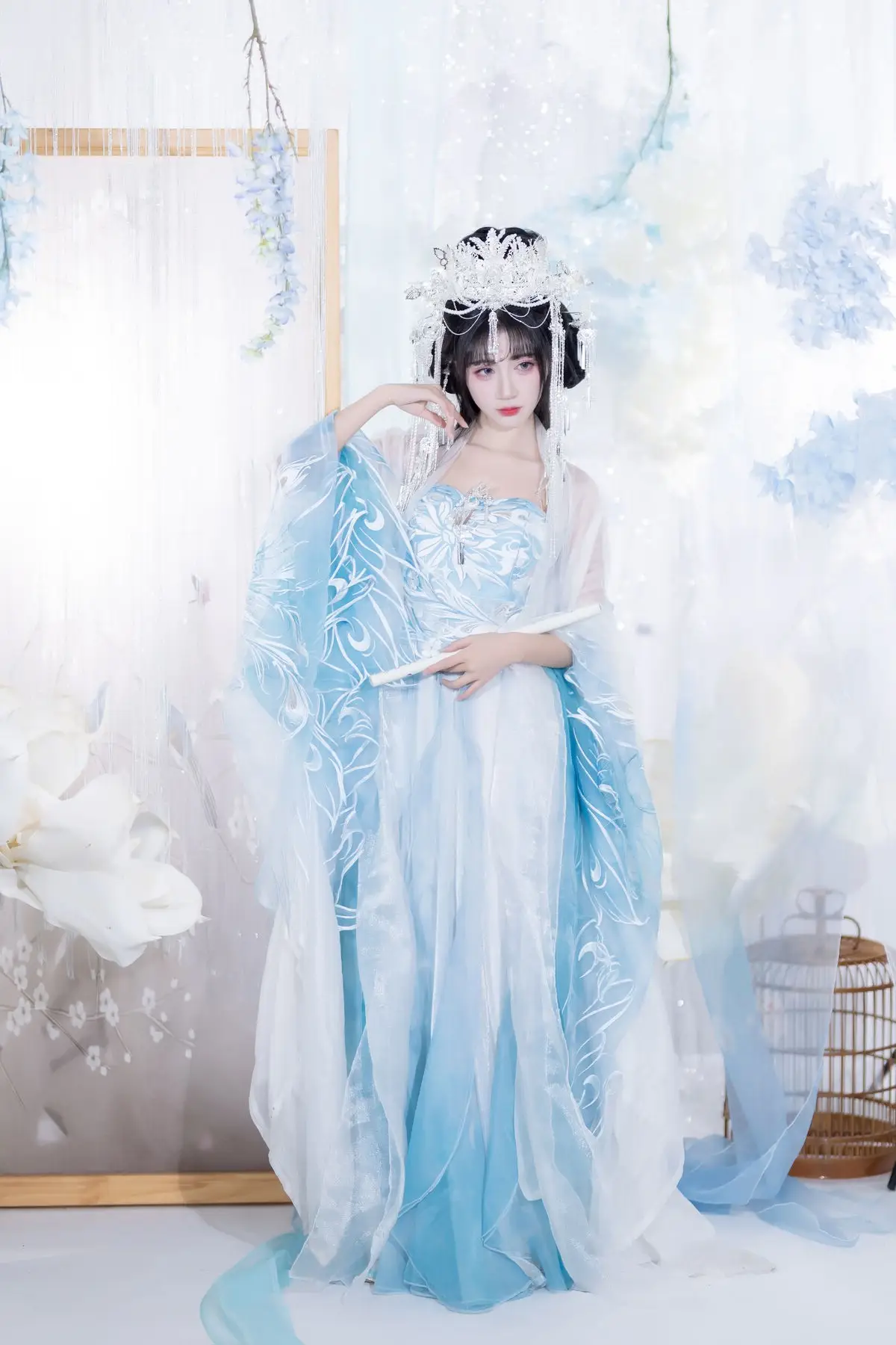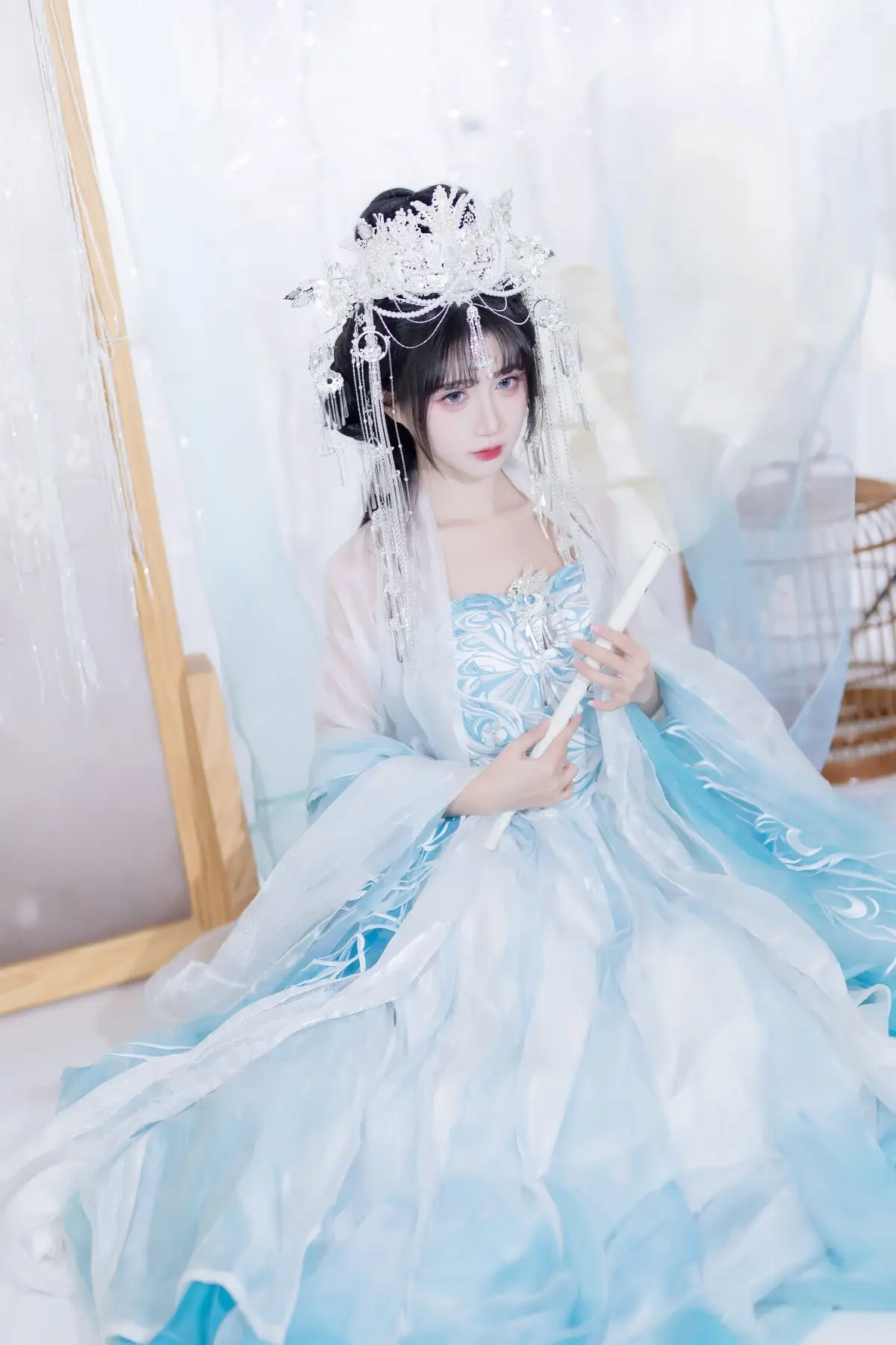 This image transports us into a fairytale world where the muse Qi Luo Sheng De Xiao Su Su appears with delicate and graceful beauty. Dressed in a pristine aqua and white traditional costume, she resembles a lost fairy, exuding purity and fragility. Every detail, from the elaborate updo adorned with sparkling hairpins to the soft flowing fabrics, is meticulously crafted, highlighting the model's noble and refined charm. The surrounding space, enveloped in white silk drapes and gentle flower clusters, creates an ethereal, dreamy backdrop, accentuating Xiao Su Su's captivating elegance. This YiTuYu Vol.8652 collection is not merely a series of photographs but a work of art, successfully capturing the timeless beauty of the muse.