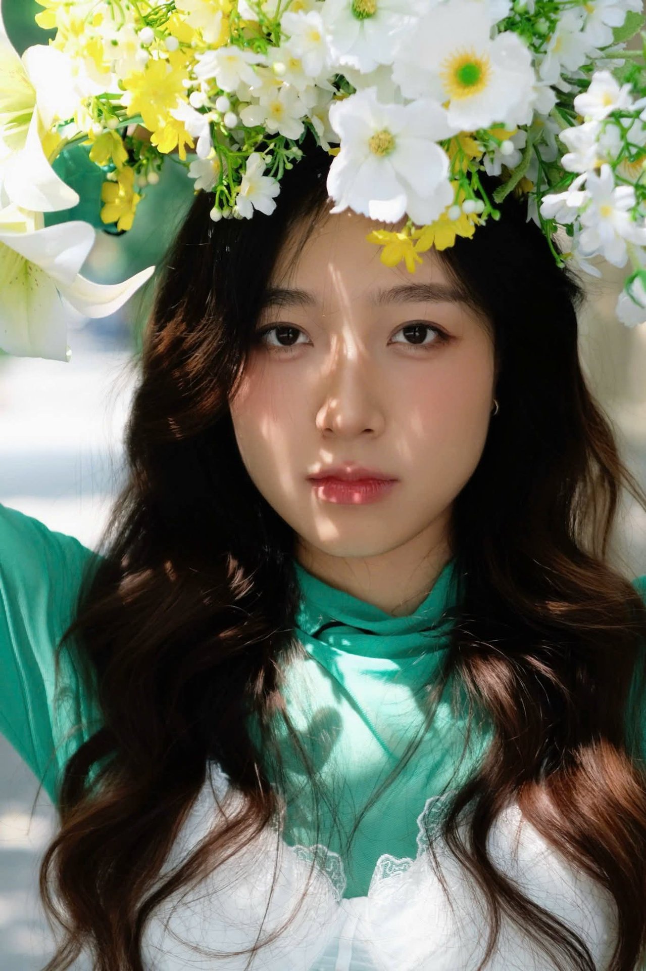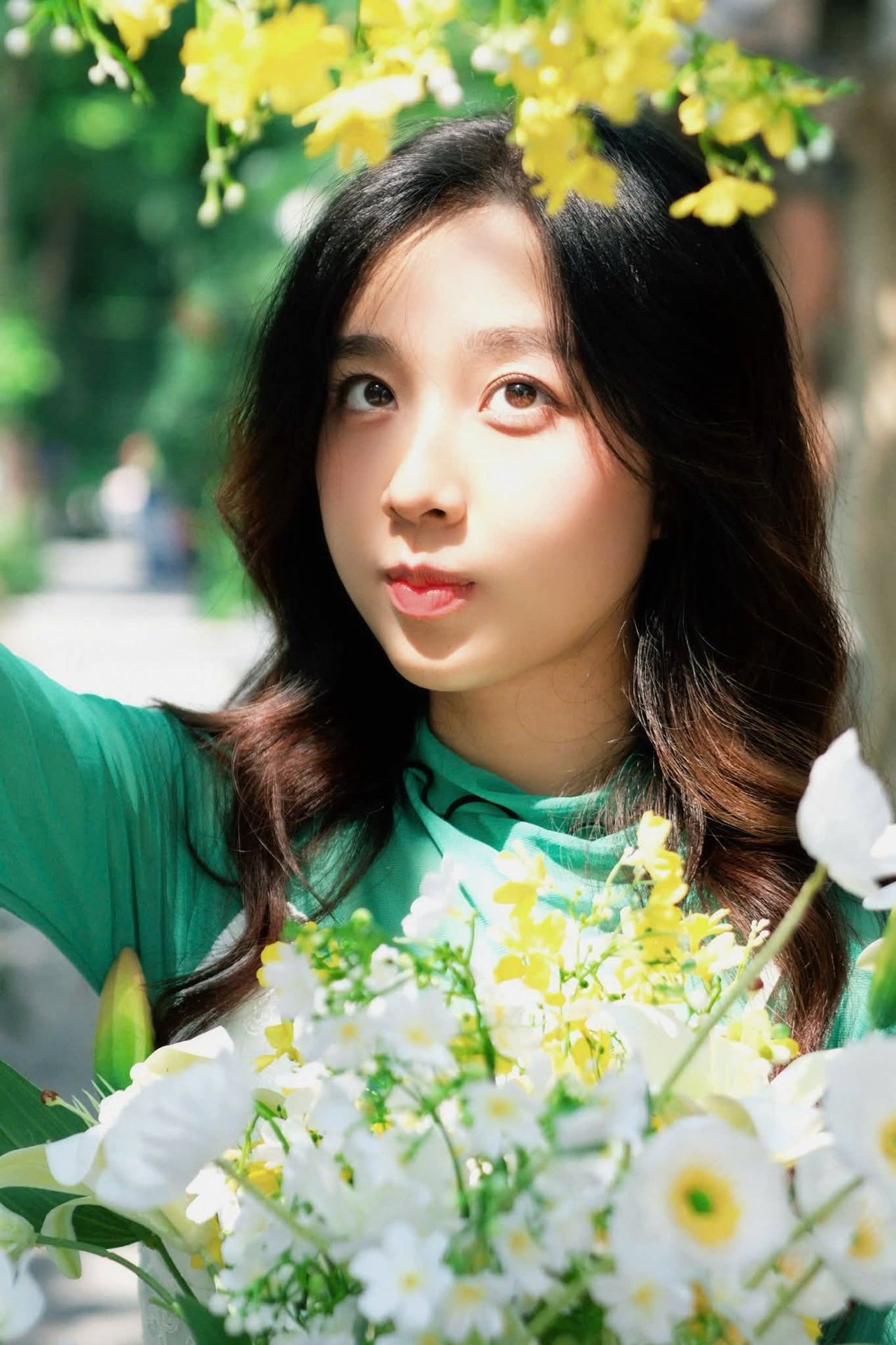 This enchanting photograph captures a captivating moment of a young woman exuding pure East Asian beauty. Her gentle, charming smile and clear eyes create an irresistible allure. Her long, flowing hair gracefully frames her shoulders, perfectly complementing the vibrant green top that accentuates her elegant and delicate features. The backdrop of lush green foliage evokes a sense of pristine, fresh, and peaceful natural surroundings. The overall image radiates natural beauty, vitality, and optimism, like a refreshing breeze on a summer day. It represents understated elegance and authentic charm, offering viewers a feeling of tranquility and ease.Đông Hoàng