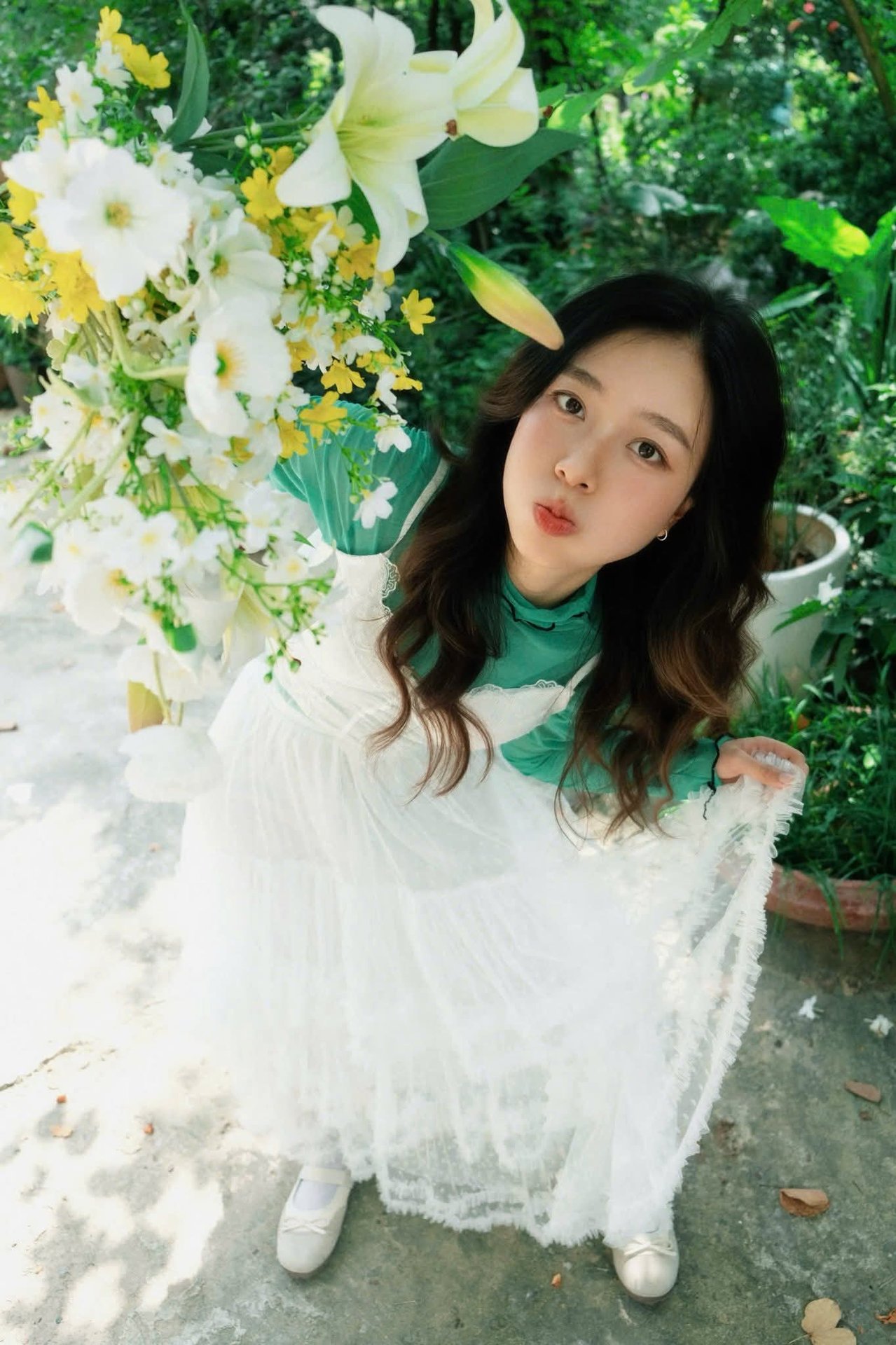 This image captures a gentle moment of a young woman in a pristine white dress, standing amidst the lush green embrace of nature. Her graceful beauty blends seamlessly with the vibrant hues of the trees and grass, creating a truly poetic scene. The flowing white dress and knee-high socks accentuate her innocence and charm. Holding a book in her hands, she appears to be enjoying peaceful, tranquil moments within the garden. The picture evokes a sense of lightness, purity, and refined summer fashion, perfect for those who appreciate natural beauty and elegant style.Đông Hoàng