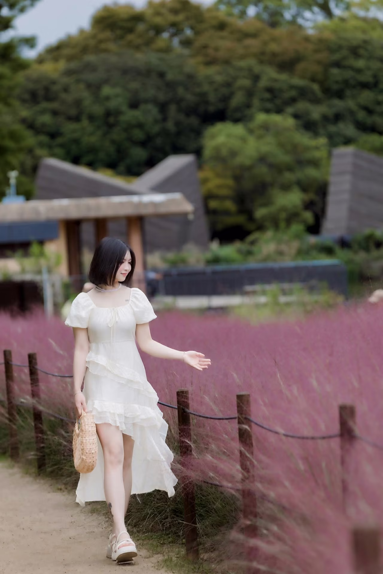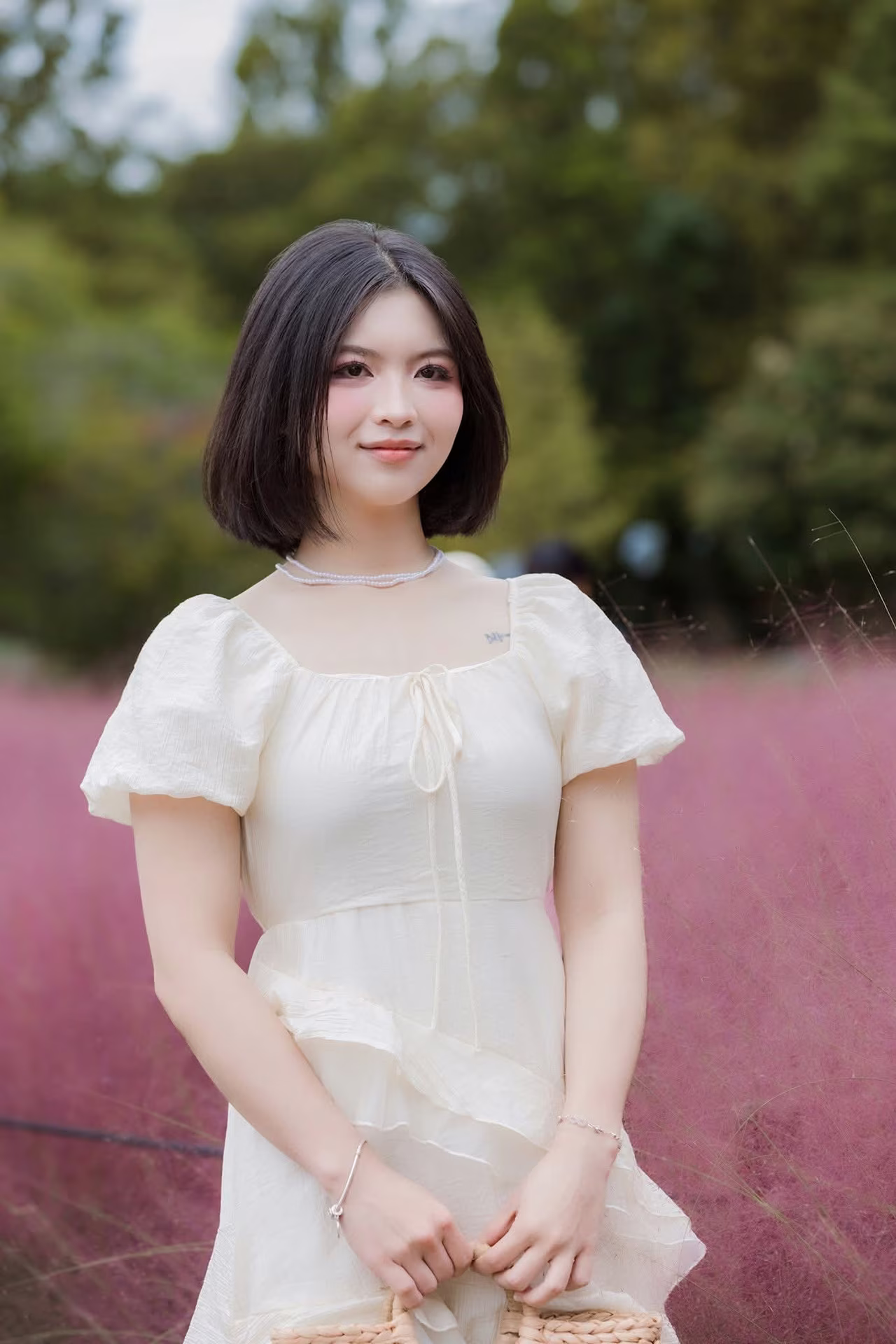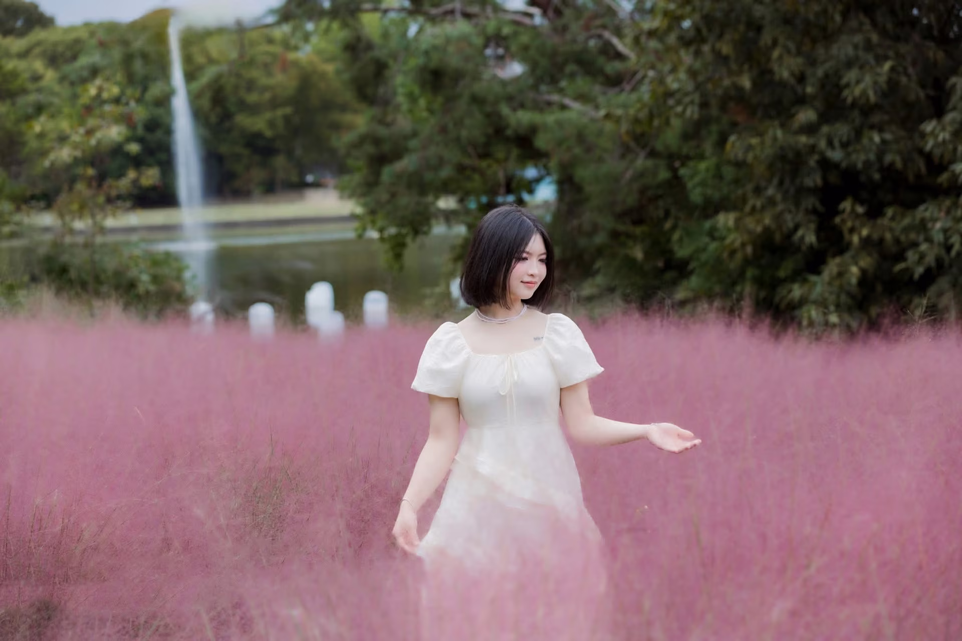In this captivating image XVG No.33 a young woman with elegant short dark hair graces a breathtaking field of fluffy pink grass. Dressed in a pristine white ethereal dress with a flowing design she embodies a poetic beauty. The soft sunlight gently illuminates her delicate and graceful presence. The sprawling pink grass field resembling a silky carpet creates a romantic and dreamy backdrop. Her gentle stroll with a subtle hand gesture amidst this beautiful nature evokes a sense of peace and tranquility. This photograph is more than just a captured moment it is a perfect fusion of human elegance and the wondrous magic of creation offering an indescribably uplifting feeling. A truly picturesque and inspiring natural scene.Đông Hoàng