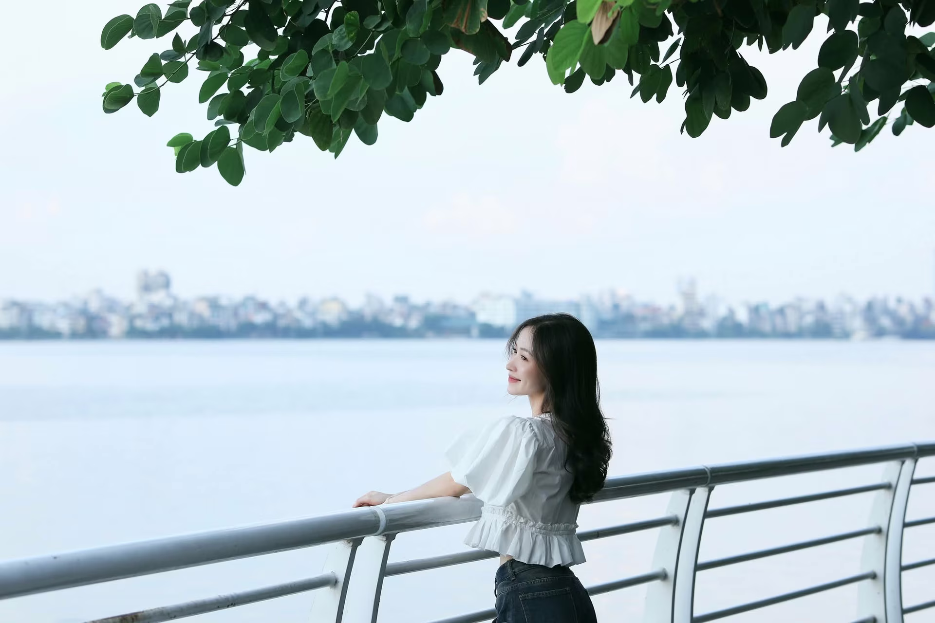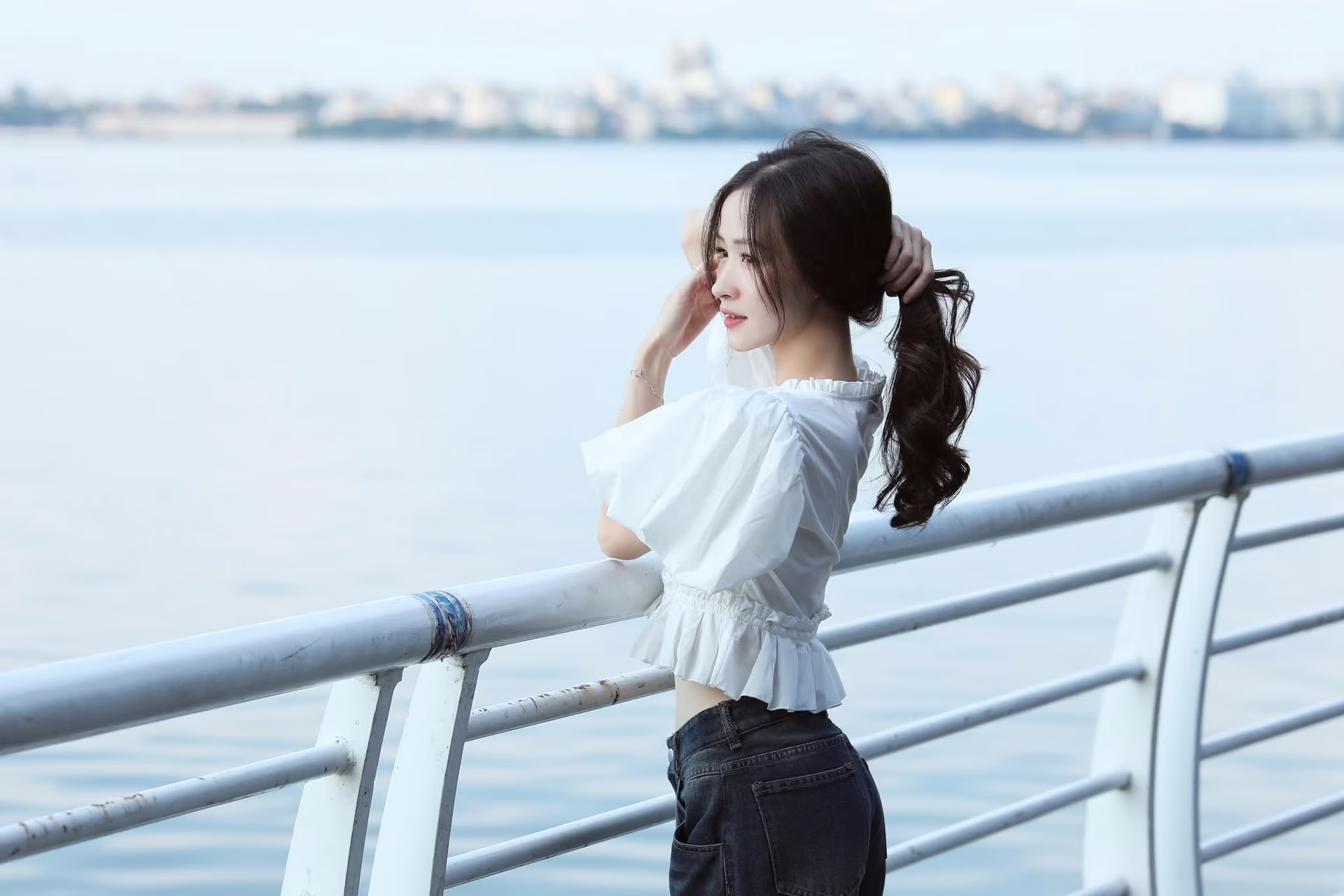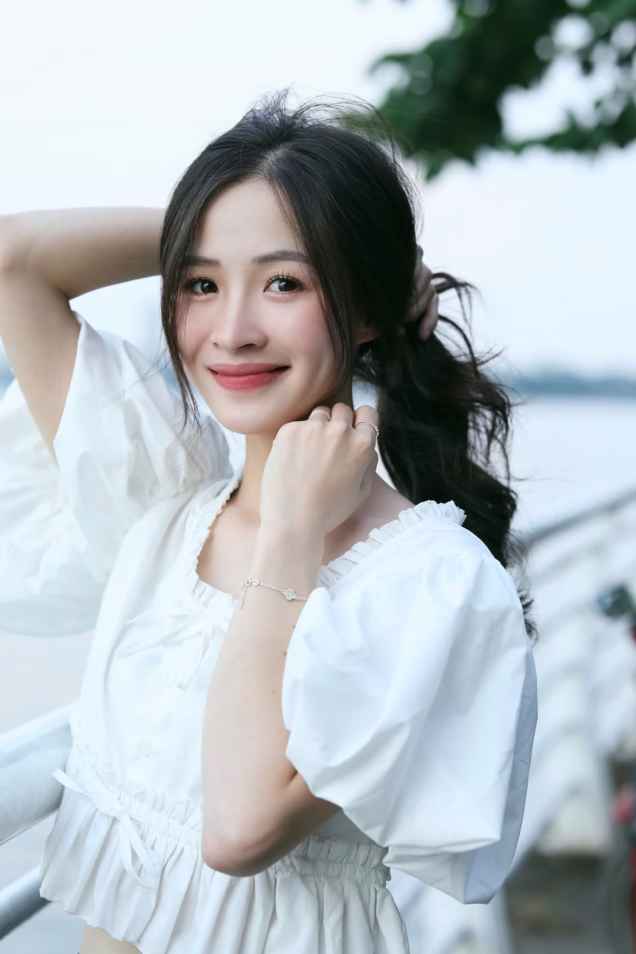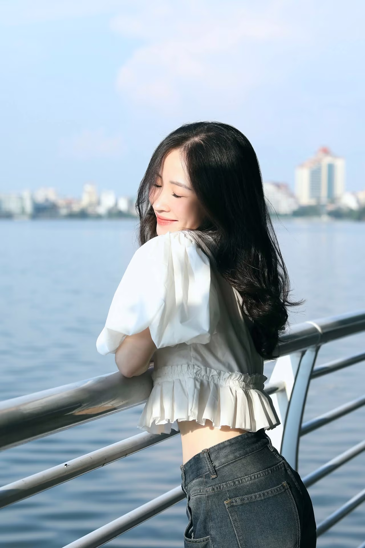 The image XVG No44 captures a beautiful moment of a charming young woman by a breezy lakeside Her fresh radiant smile seems to dispel all worries bringing a sense of peace Her flowing dark hair and smooth fair skin highlight her elegant beauty Dressed in a pristine white top she resembles a blooming flower showcasing its colors under the gentle golden sunlight Her sparkling eyes with a hint of playfulness and dreaminess captivate viewers In the background the clear blue lake and sky create a poetic and picturesque scene This is not just a beautiful photo but also a moment of vibrant youthfulness full of life and joy This white-clad muse will surely leave an unforgettable impression on everyones heartĐông Hoàng