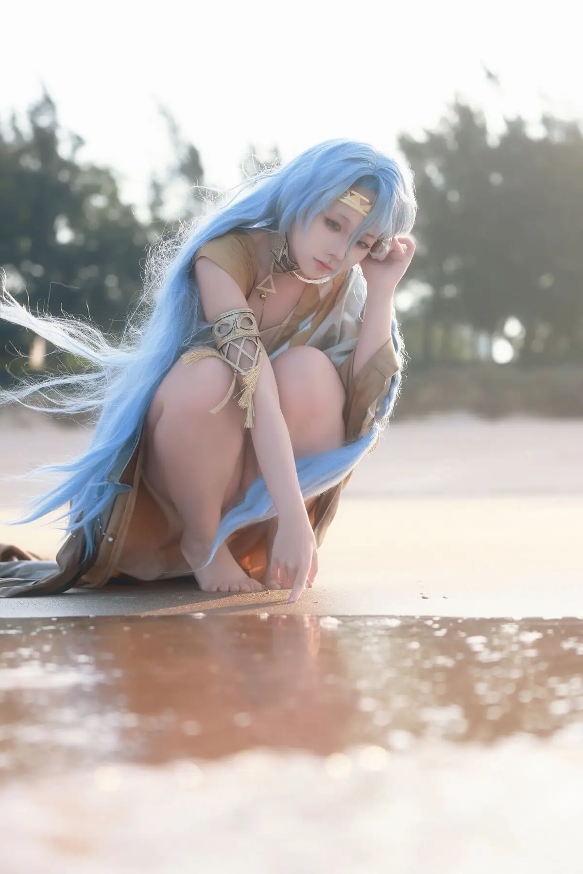 In this captivating photo cosplayer G44 Bu Hui Shou Shang masterfully embodies a character from the popular game Reverse: 1999. The stunning beach setting bathed in golden sunlight and clear blue ocean creates an incredibly picturesque and refreshing backdrop. The character's costume is meticulously recreated with intricate details and soft colors that perfectly harmonize with the vast seascape. The cosplayer's graceful gentle beauty inviting gaze and subtle smile further accentuate the character's ethereal aura. This image not only showcases the elaborate effort invested in cosplay but also evokes a sense of serene relaxation reminiscent of a memorable summer vacation. It is truly an impressive piece of cosplay artistry.