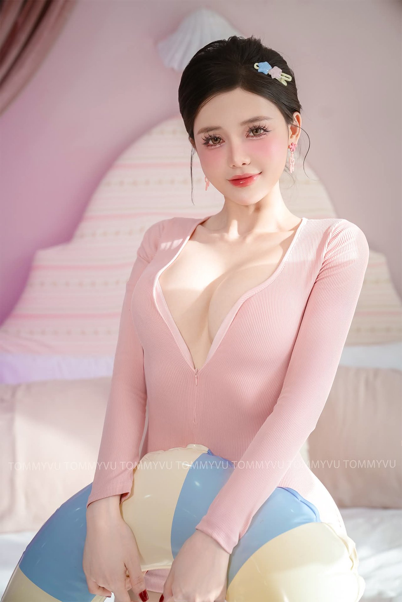 The image unveils a dreamy and sweet scene where a beautiful girl shines brightly She wears a form-fitting pink dress accentuating her graceful curves Her gentle beauty is further enhanced by white knee-high socks with pink bows creating a style both adorable and alluring The girl sits comfortably on a soft bed surrounded by romantic pink decor Her hand gently holds a blue and white striped swim ring reminiscent of vibrant summer days and sunny beach trips The picture evokes a fresh and dreamy feeling like an endless summer fantasy The harmonious blend of outfit accessories and setting creates an artistic and emotionally rich composition that draws every eye This truly captures a wonderful moment of feminine beauty and elegance