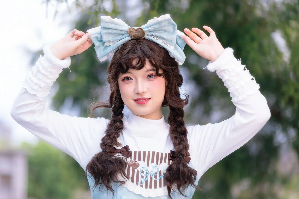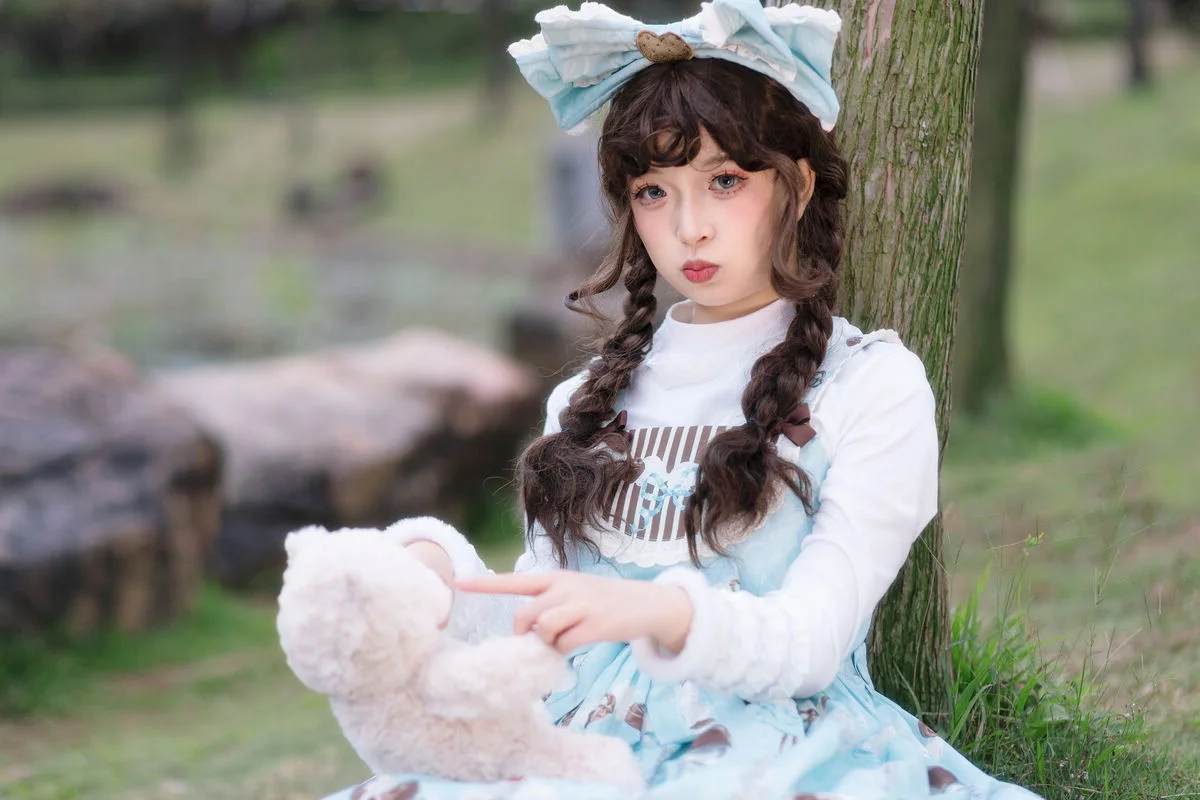 Stepping into a fairytale world, Nuo Mi Tuan captures the essence of innocence and elegance in the Art Language Vol.8935 collection. Dressed in a charming Sweet Lolita outfit, the combination of a patterned light blue dress and a soft white turtleneck creates a visually soothing and sophisticated look. The oversized bow and playful braids perfectly complement her doll-like features, while the teddy bear adds a touch of whimsical nostalgia to the entire composition. The soft lighting and architectural background evoke the feeling of a peaceful morning in a European-style park, making every frame feel like a scene from a dreamy storybook. This photoshoot is not just about fashion; it is a celebration of youthful spirit and artistic expression. Whether you are a fan of intricate fashion details or simply seeking a moment of aesthetic bliss, Nuo Mi Tuan performance offers a refreshing and heartfelt experience that resonates with the beauty of springtime.#LolitaAesthetic #NuoMiTuan #ArtLanguage #DreamyVisuals #FairytaleStyle
