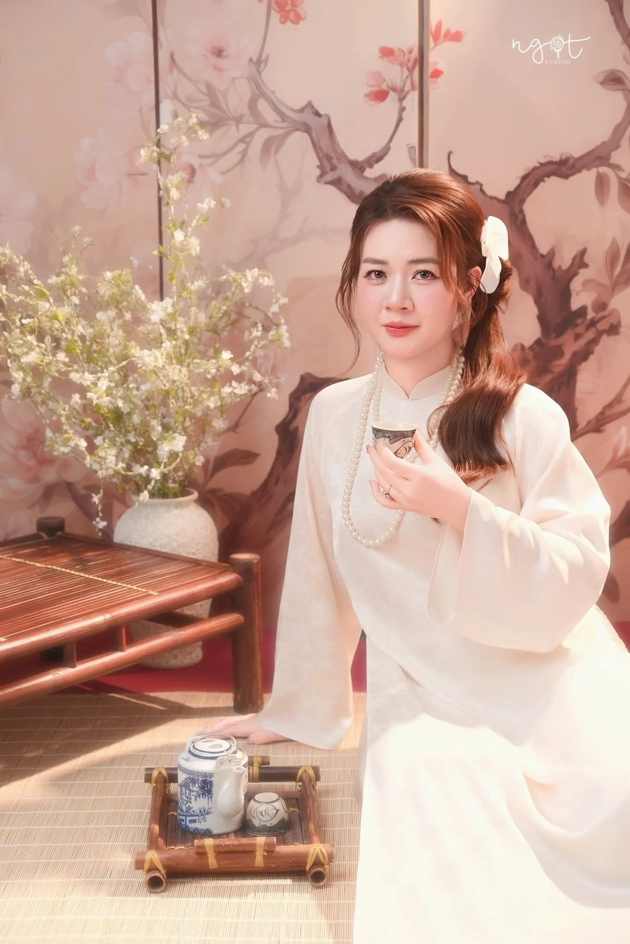This exquisite photo captures the gentle beauty of an Asian woman in elegant traditional attire. She sits serenely in a culturally rich space, adorned with an intricate cherry blossom screen and a classic tea set. Her graceful charm radiates from her gaze, a soft smile, and long hair accented by a white flower, creating a moment of peaceful contemplation. The image evokes traditional values, a sense of tranquility, and the timeless beauty of Asian women, offering viewers a feeling of relaxation and aesthetic pleasure.#AsianBeauty #TraditionalAttire #TeaCeremony #SereneMoment #CulturalElegance #AoDai