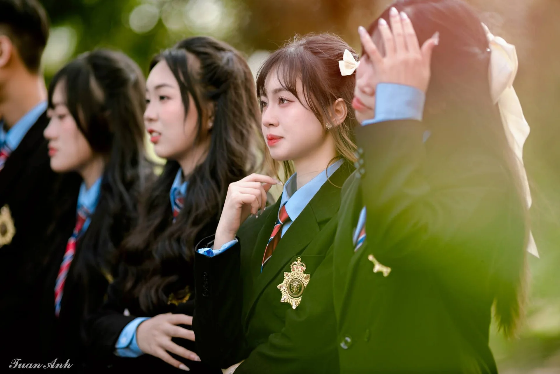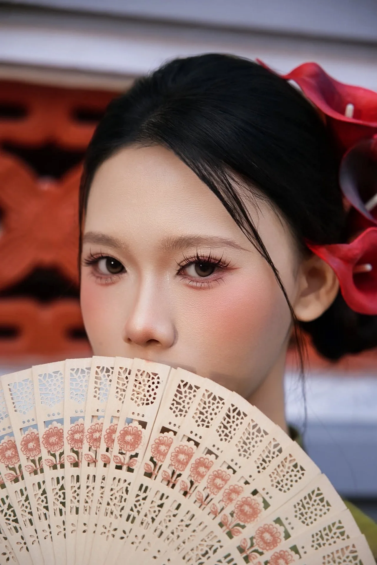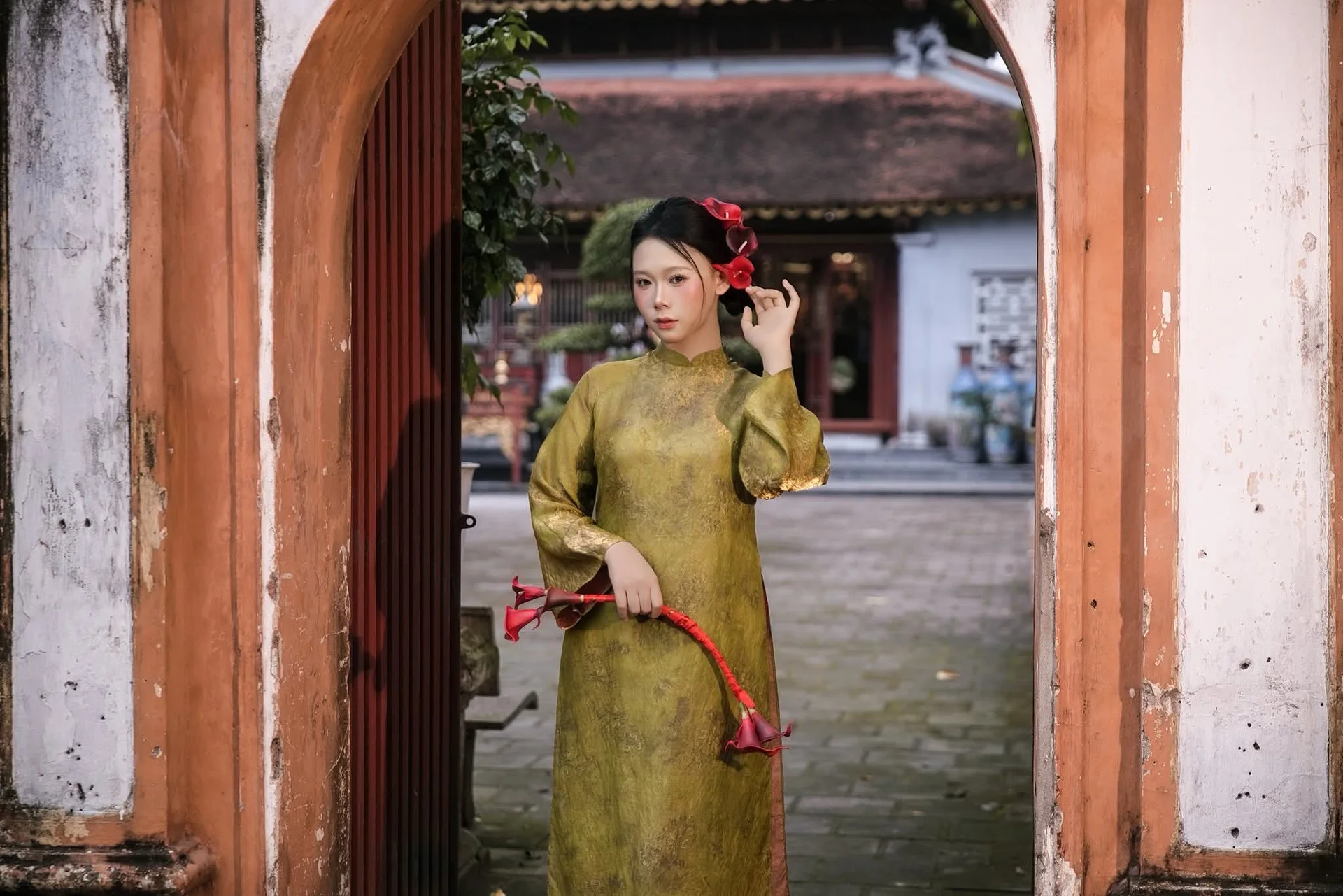 This exquisite portrait beautifully captures the traditional and elegant charm of Vietnamese women. The young lady exudes grace and gentleness in her sophisticated golden-green classic Ao Dai, a profound cultural symbol. A striking highlight is the vibrant red calla lilies delicately placed in her dark hair, creating a harmonious blend of natural beauty and a touch of modern flair. Her delicate features, dreamy eyes, and blushing cheeks evoke a sense of shyness, inviting viewers into a nostalgic space where time seems to stand still. This is not just a photograph but a tribute to timeless traditional beauty.#Vietnamese #AoDai #TraditionalBeauty #VietnameseWomen #RedCallaLilies #VietnameseCulture