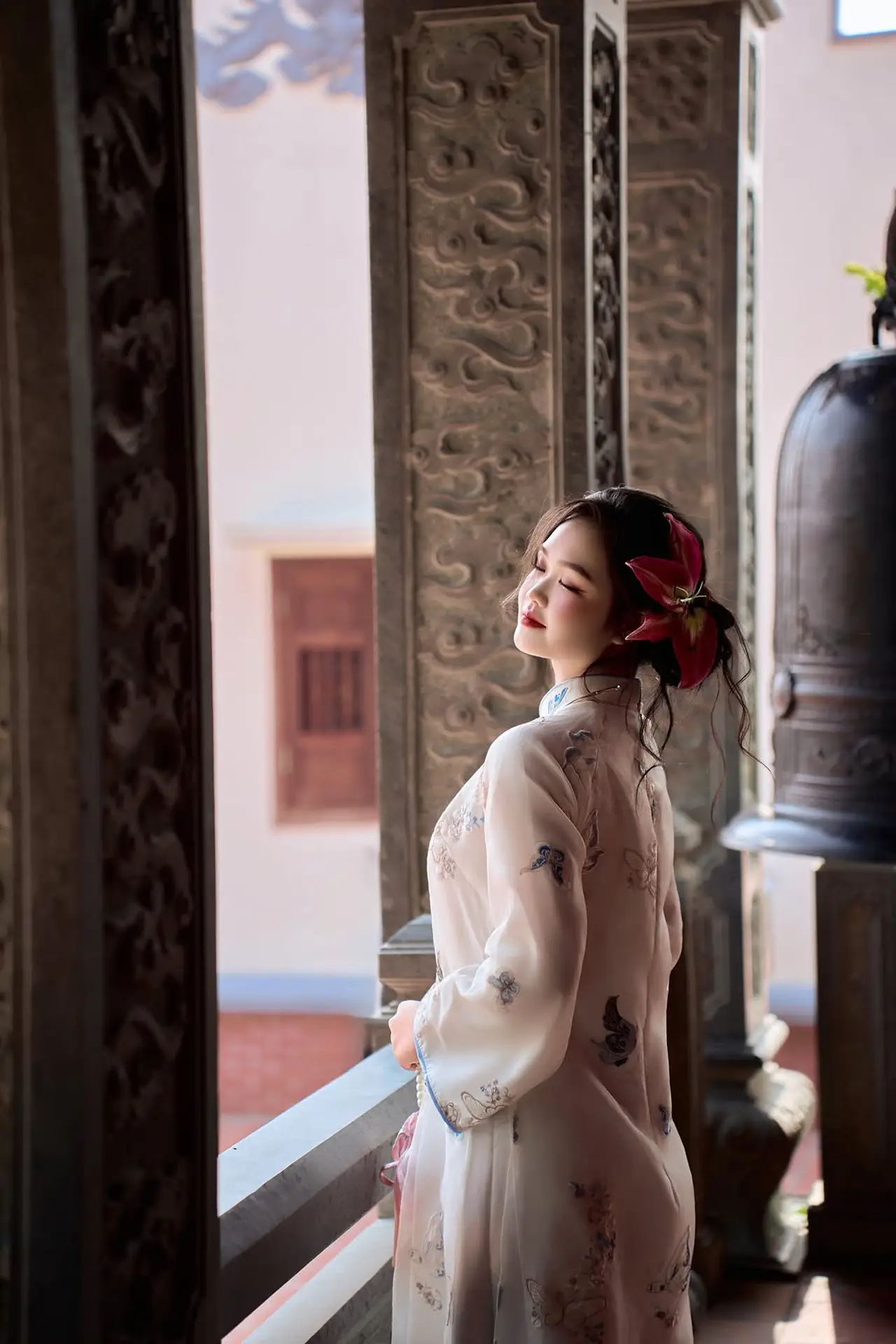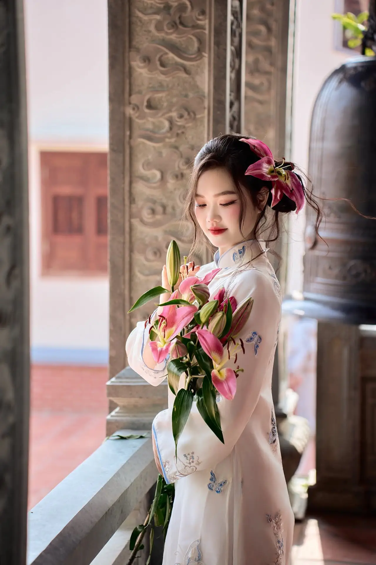 This stunning photograph captures a serene moment of a Vietnamese woman in a pristine white Ao Dai exuding elegant and graceful beauty With her hair elegantly styled in a bun adorned with a vibrant red flower she gently turns her head gazing upwards as if in contemplation The traditional Ao Dai with its delicate patterns accentuates the graceful figure of Vietnamese women The backdrop of ancient architecture featuring intricately carved stone pillars and a large bronze bell adds cultural depth to the image Natural light illuminates her gentle features and the essence of Vietnamese tradition It is a harmonious blend of human beauty and historical cultural space#Vietnamese #AoDai #TraditionalBeauty #AncientArchitecture #VietnameseWoman #VietCulture