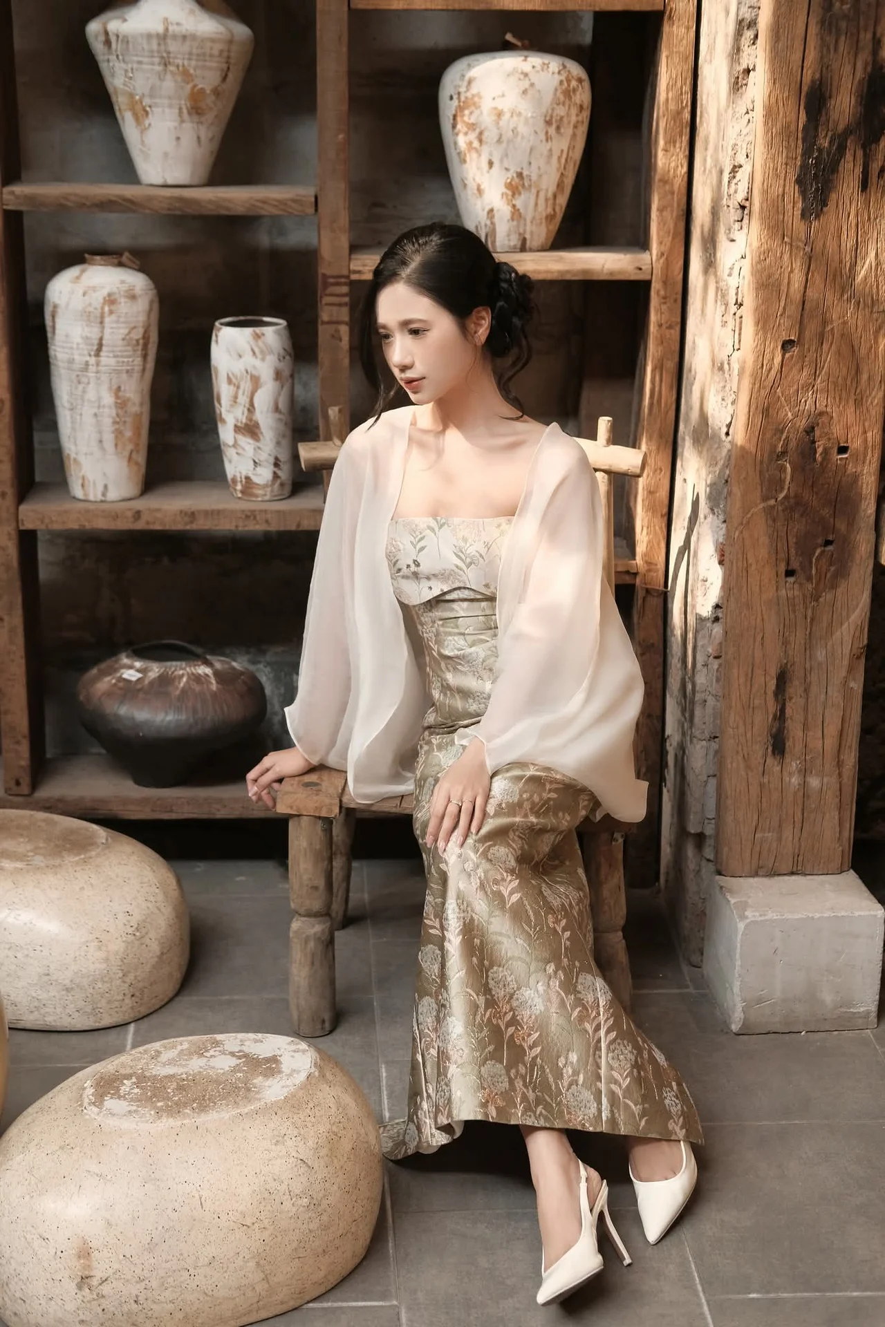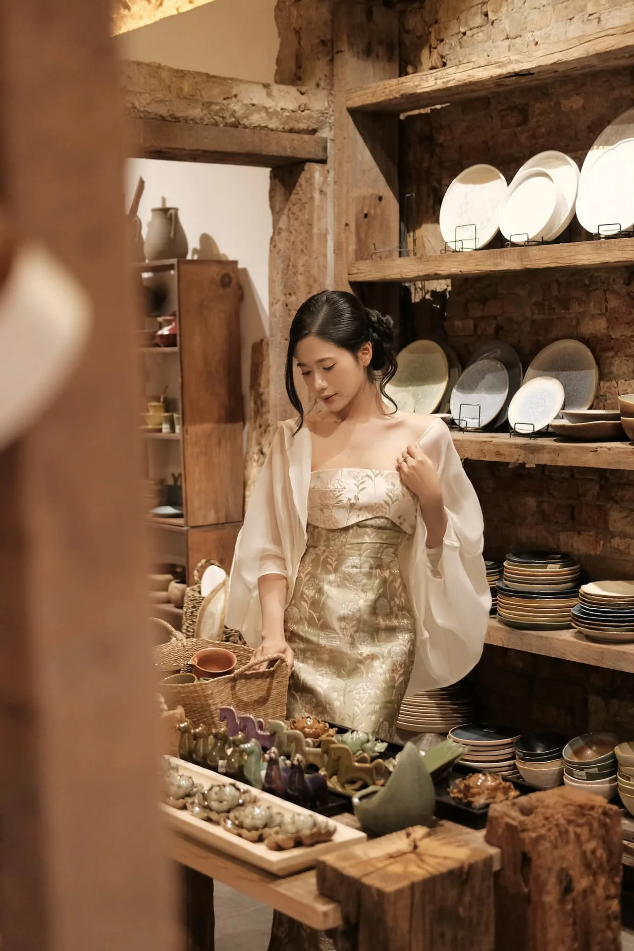 This moment feels like a scene from a slow paced indie film where the elegant beauty of a young woman blends perfectly with the rustic ceramic backdrop. Her pensive gaze and gentle expression create a captivating aura that invites deep reflection and emotional connection. In terms of fashion the outfit features a sophisticated cream palette with delicate floral embroidery crafted from light and airy fabrics that enhance her natural femininity and grace. The soft bun with loose strands adds a touch of effortless artistry to the entire composition making her look like a true muse. This is not just a portrait but a harmonious intersection of an artistic soul and refined aesthetic taste evoking a sense of peace found in tradition reimagined through a modern and poetic lens.#ElegantStyle #ArtisticVibe #PortraitPhotography #TraditionalBeauty #VietnameseMuse