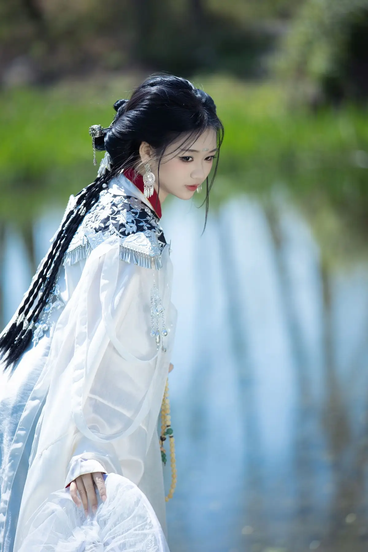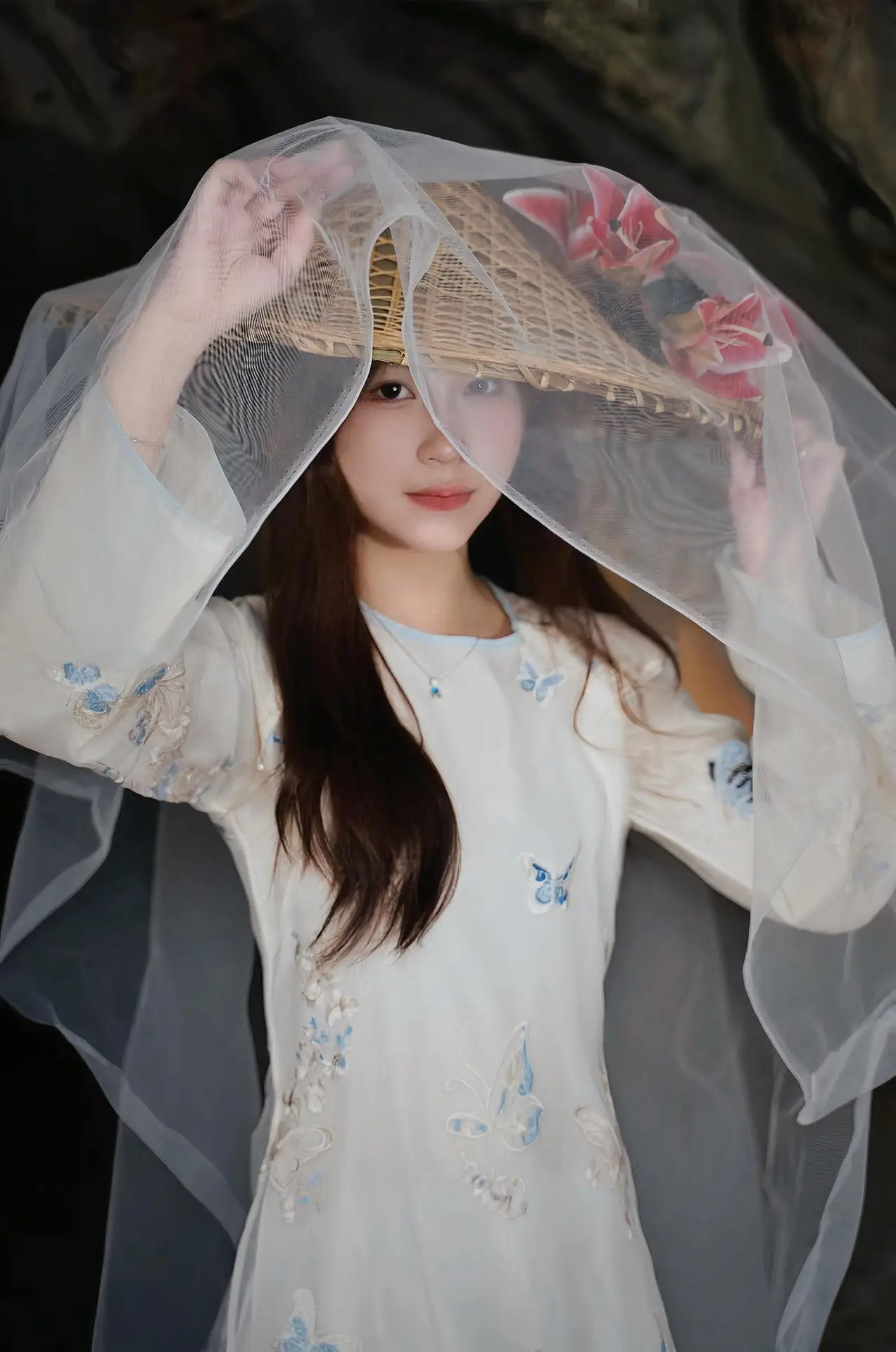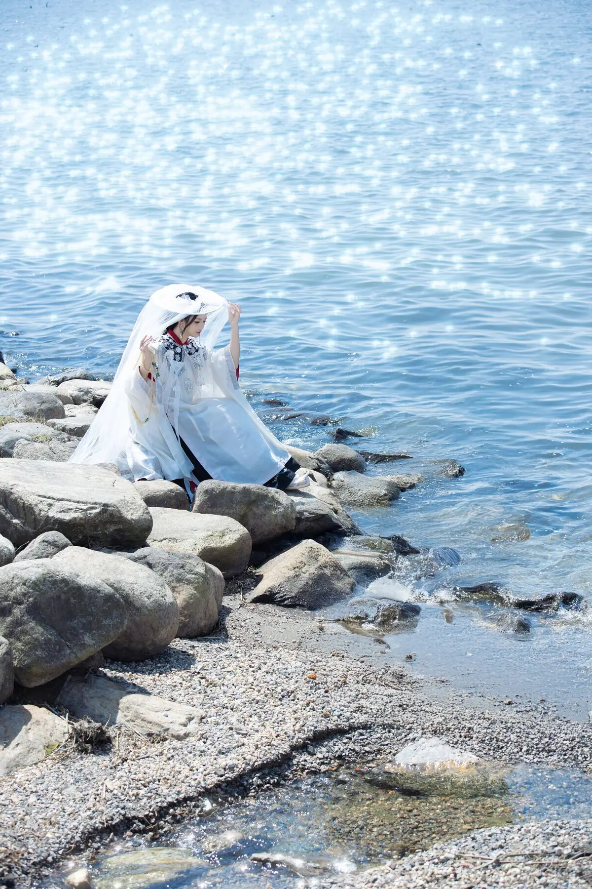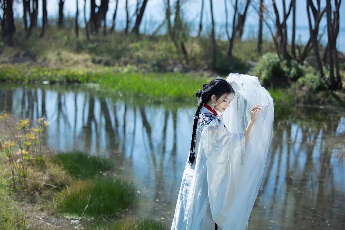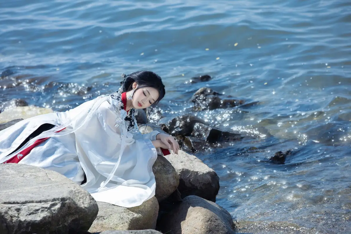 In this YiTuYu Vol.8722 collection, model Wan Jiang Ting embodies an ethereal and graceful beauty beside a crystal-clear stream. Dressed in pristine white traditional attire, adorned with a delicate sheer veil, she presents a poetic and dreamy silhouette. Her gentle sitting pose, with a contemplative gaze towards the flowing water, evokes a sense of serenity and a profound connection to nature. The backdrop of smooth pebbles and clear blue stream water beautifully complements Wan Jiang Ting's delicate and refined charm, transforming each photograph into a captivating piece of visual art that invites viewers to explore its emotional depth.#WanJiangTing #VisualArt #TraditionalBeauty #EtherealPhotography #NatureSerenity #YiTuYu