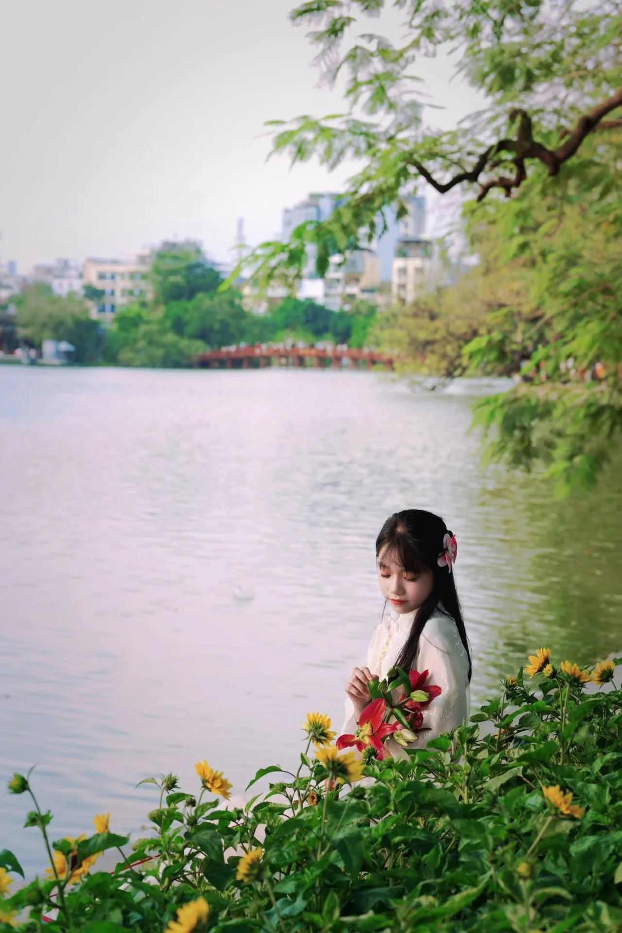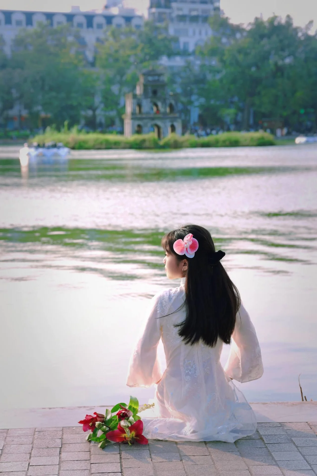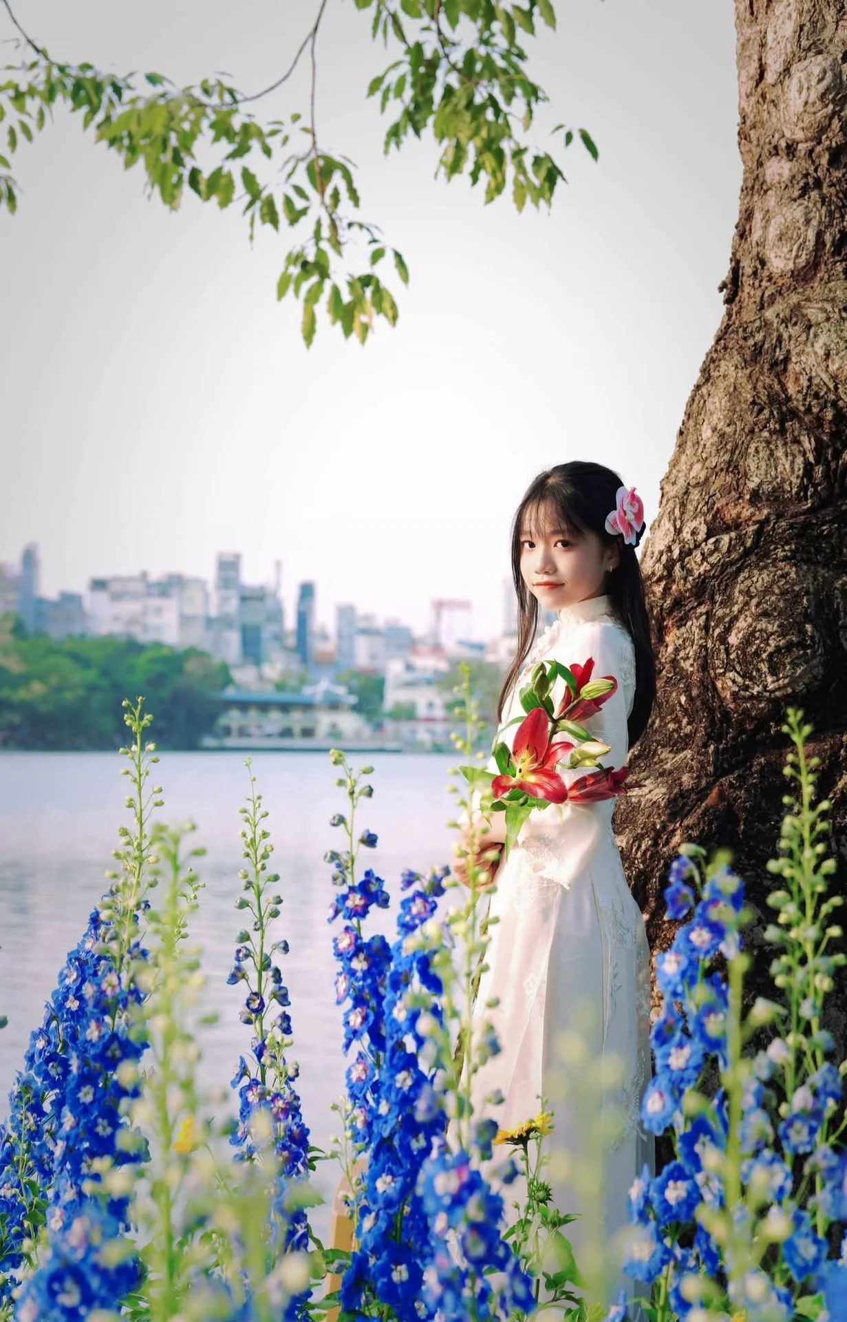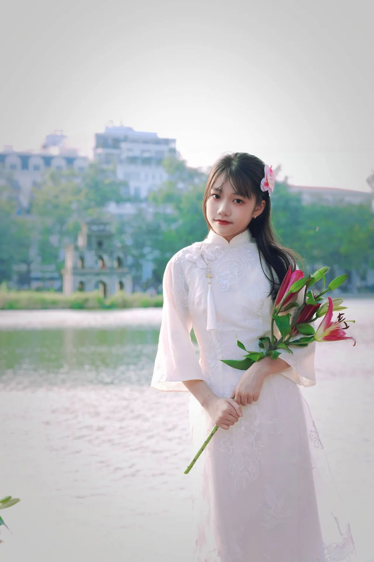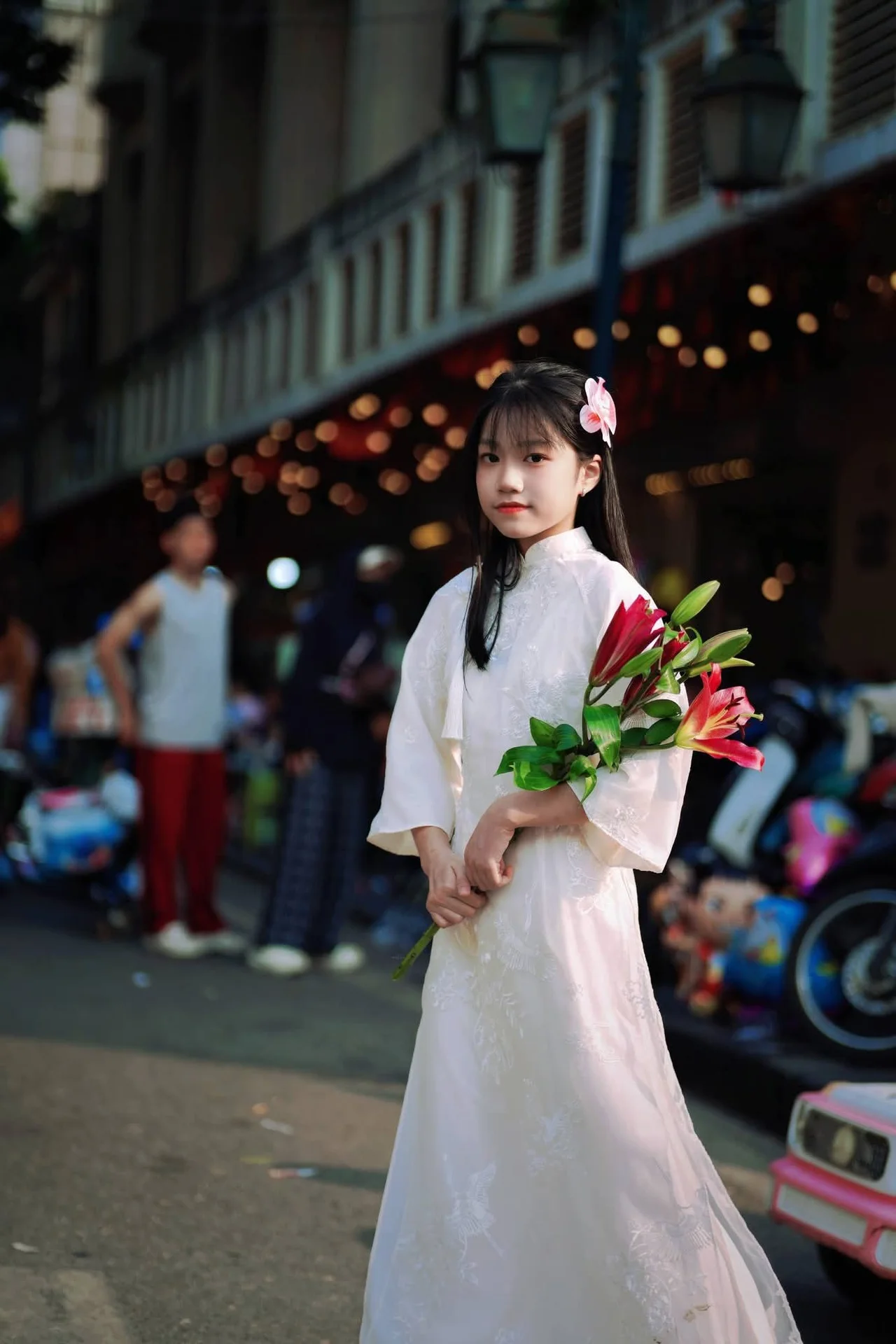 This beautiful photograph captures a young Vietnamese girl dressed in a pristine white ao dai, standing gracefully amidst the bustling ambiance of an old quarter. With a gentle smile and a delicate pink flower adorning her hair, she holds a vibrant bouquet of red lilies, exuding an elegant and pure beauty. The warm golden hour sunlight illuminates her, highlighting the charm and traditional essence of Vietnamese women. This image perfectly blends ancient cultural charm with contemporary grace, inviting viewers to admire and feel a sense of tranquility within the urban landscape. It is a heartfelt tribute to the beauty of Vietnam.#AoDai #VietnameseBeauty #OldQuarter #VietnameseGirl #TraditionalBeauty