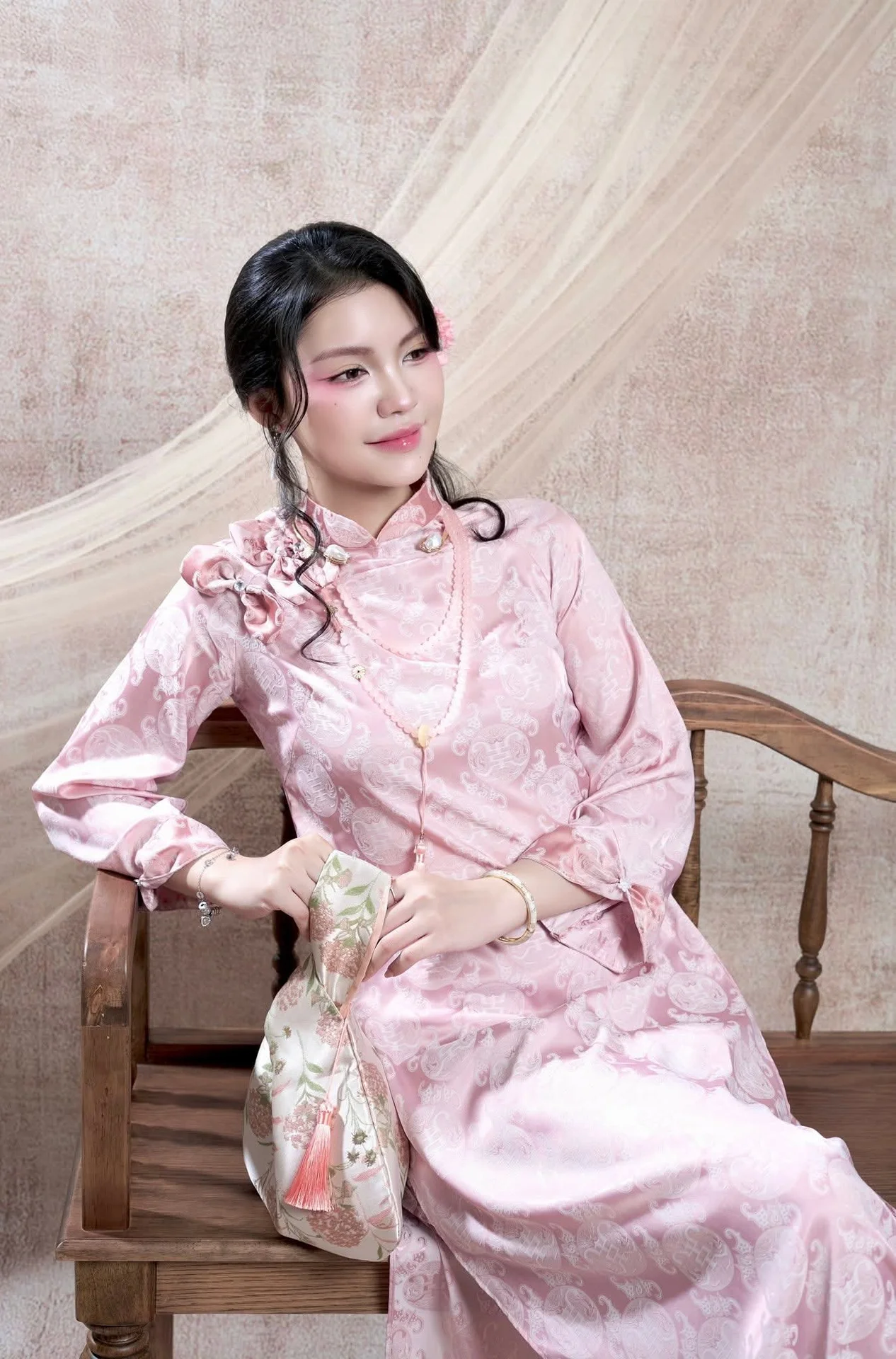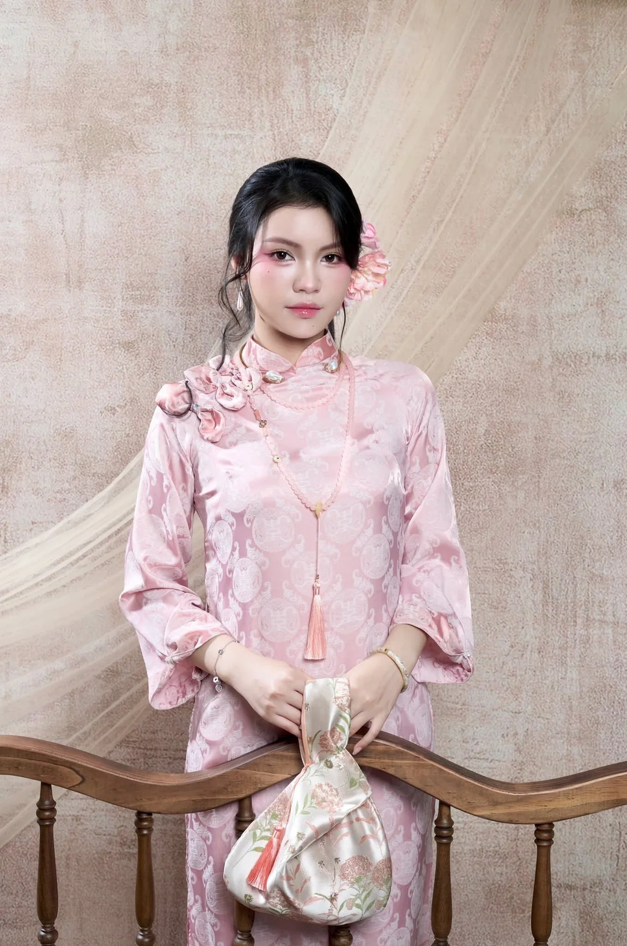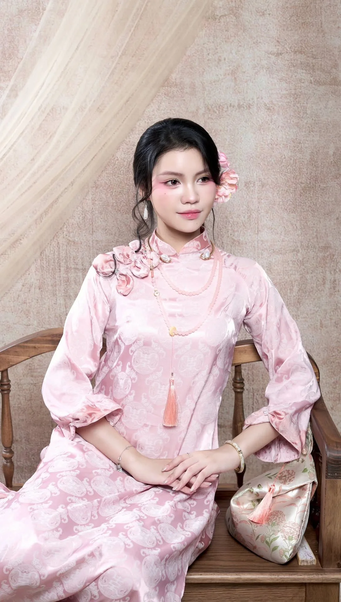 Capturing the essence of poetic Eastern beauty, this portrait radiates a sense of nostalgic elegance through the iconic Vietnamese Ao Dai. The subject exudes a gentle aura with her soft gaze and poised demeanor, perfectly embodying the sophisticated charm of traditional heritage. Dressed in a rich magenta silk ensemble, the outfit stands out with its exquisite 3D floral appliqués that add a tactile and luxurious dimension to the visual narrative. The warm lighting and earthy background tones harmonize beautifully with the vibrant fabric, creating a mood that is both intimate and grand. Every detail, from the delicate hair accessory to the intricate embroidery, reflects a high level of craftsmanship and a refined fashion sense. This visual story invites the viewer to appreciate the seamless blend of cultural tradition and contemporary artistic expression, celebrating a femininity that is as enduring as it is breathtaking.#Vietnamese #AoDai #TraditionalBeauty #ElegantFashion #OrientalCharm #FloralEmbroidery