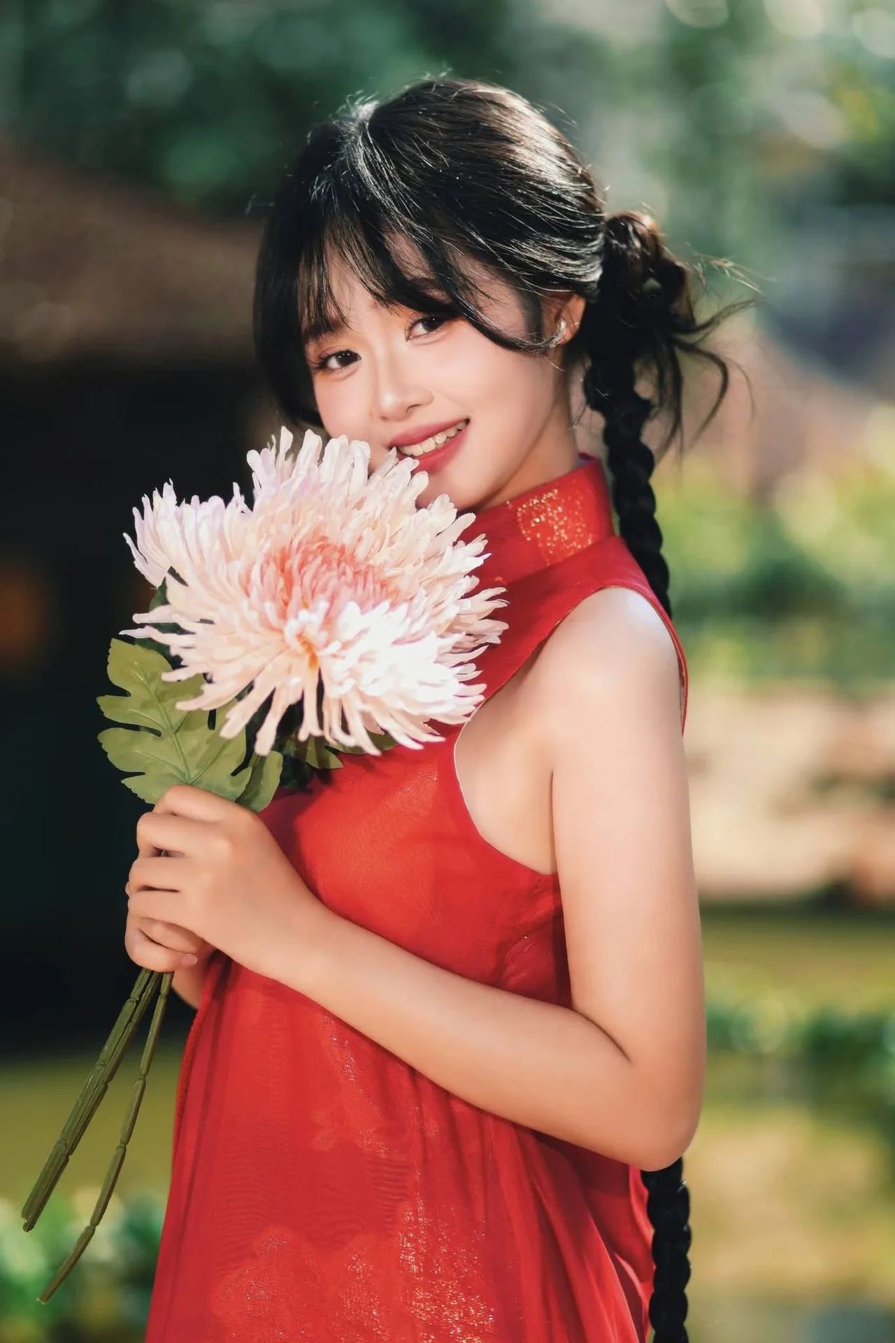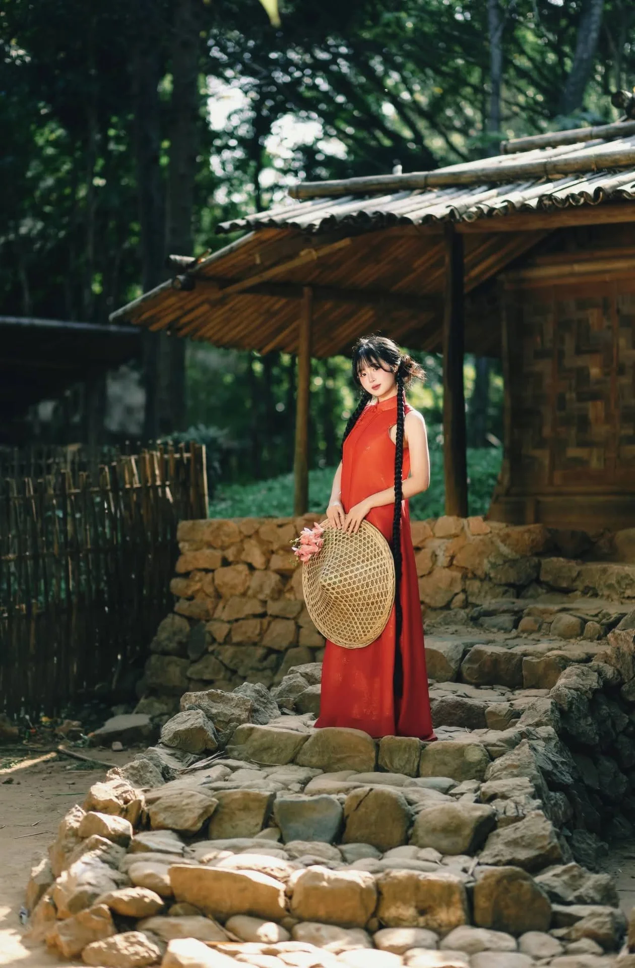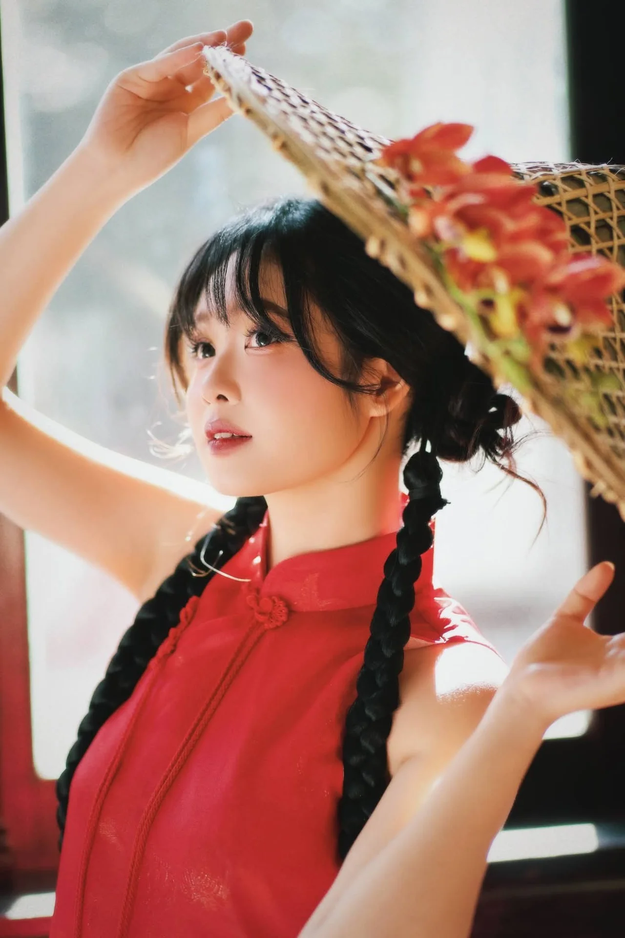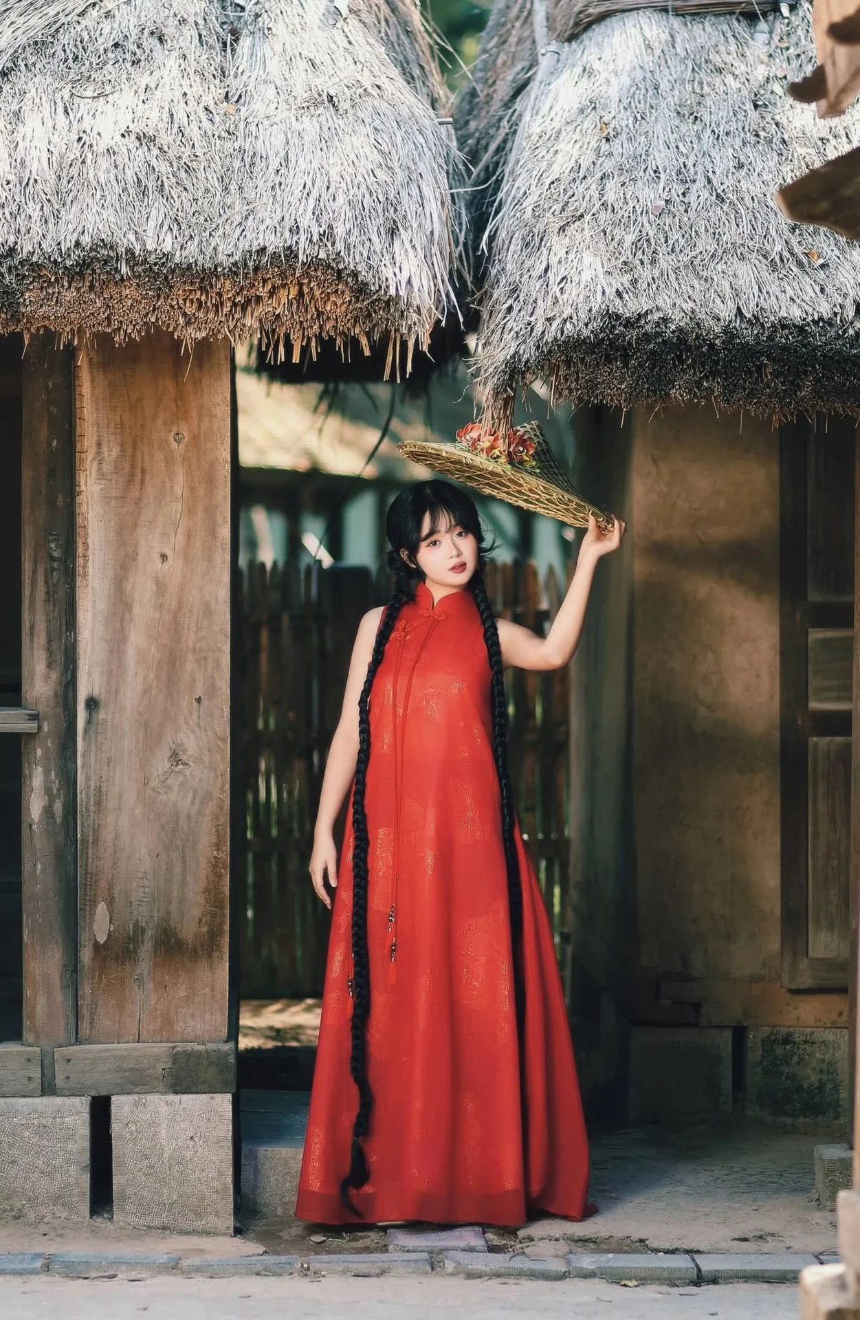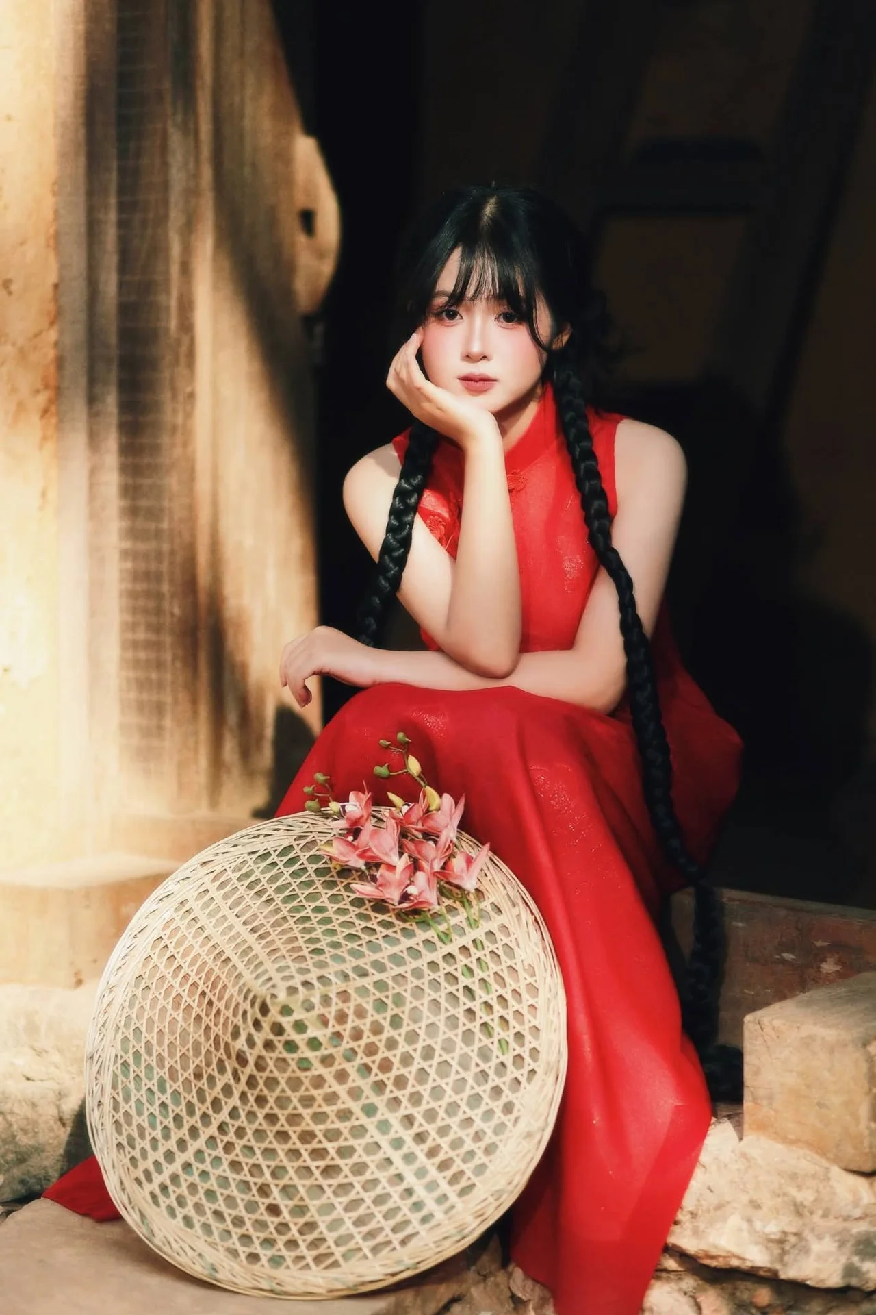 This stunning photograph captures a Vietnamese girl embodying gentle elegance and timeless beauty. She is adorned in a vibrant red Ao Dai a symbol of good fortune and the traditional grace of Vietnamese women. Her long braided hair simple yet captivating further enhances her rustic charm and delicate allure. The girl's eyes convey a sense of serenity and a hint of gentle reverie. Beside her sits a rustic bamboo winnowing basket adorned with small pink flowers creating a harmonious scene rich in East Asian essence. The overall image evokes a profound emotion of enduring beauty sophistication and the unique grace of a Vietnamese woman.#VietnameseGirl #AoDai #TraditionalBeauty #AsianBeauty #RedDress