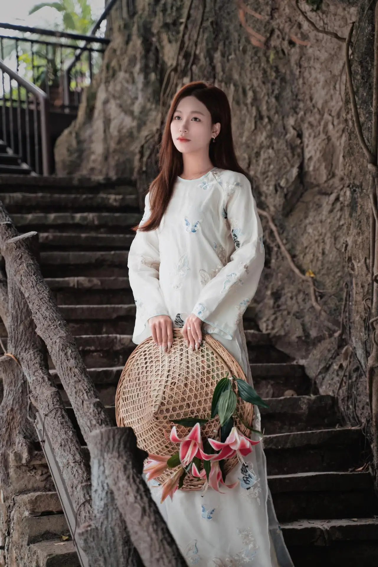 This captivating image portrays the gentle and elegant beauty of a Vietnamese girl adorned in a pristine white Ao Dai The traditional dress is subtly embellished with delicate blue floral patterns enhancing her graceful charm She sits gracefully on ancient stone steps her long hair flowing softly and her clear eyes gazing directly at the viewer Beside her rests a woven basket brimming with fresh pink lilies creating a harmonious and poetic scene This portrait not only showcases the timeless elegance of Vietnamese women but also evokes the enduring beauty of traditional Asian culture It is a perfect blend of human grace and a tranquil natural setting#Vietnamese #AoDai #TraditionalBeauty #AsianGirl #PinkLilies #StoneSteps
