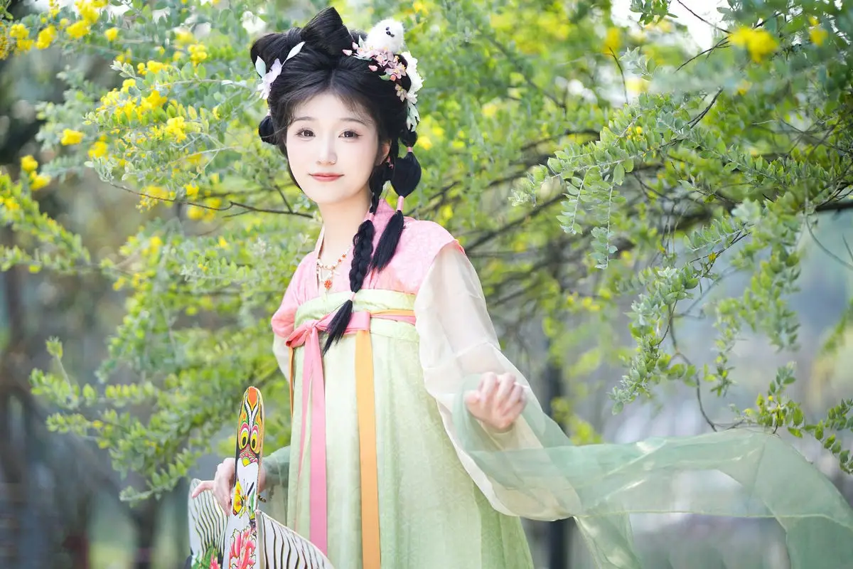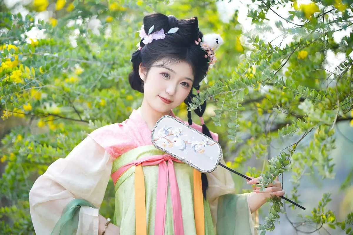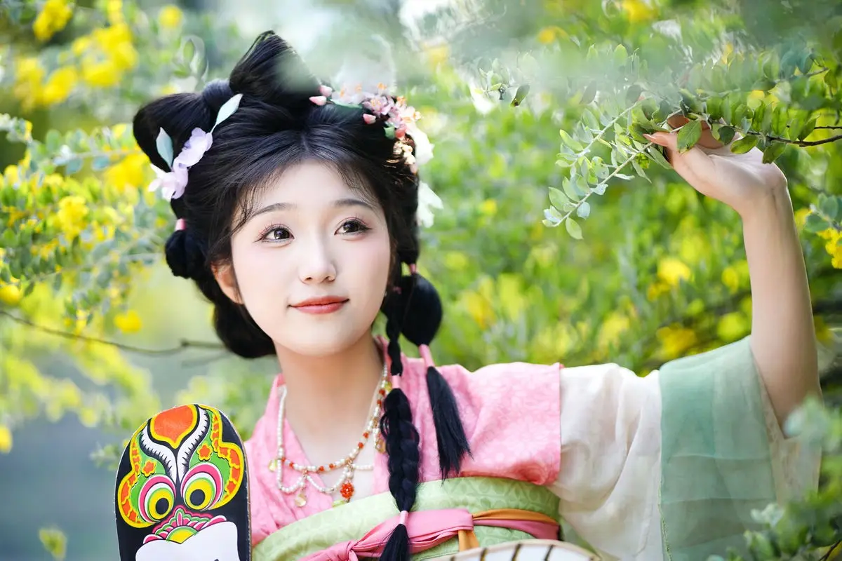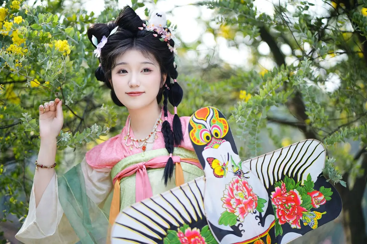 Discover the ethereal beauty of Zi Yu adorned in exquisite traditional Hanfu. Her soft pastel green and pink attire perfectly complements her intricate braided updo, embellished with delicate hair ornaments. Playfully holding a vibrant butterfly kite, she creates a picturesque and serene scene amidst lush natural greenery. The image beautifully blends classical cultural aesthetics with youthful charm, evoking a sense of tranquility and admiration for her pure elegance. This is a captivating and emotionally rich artistic moment, showcasing timeless grace.#Hanfu #AsianBeauty #ButterflyKite #TraditionalChinese #ZiYu