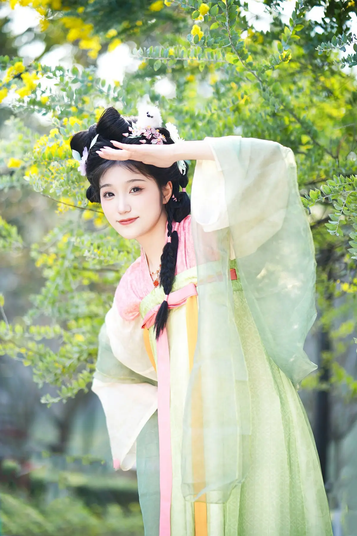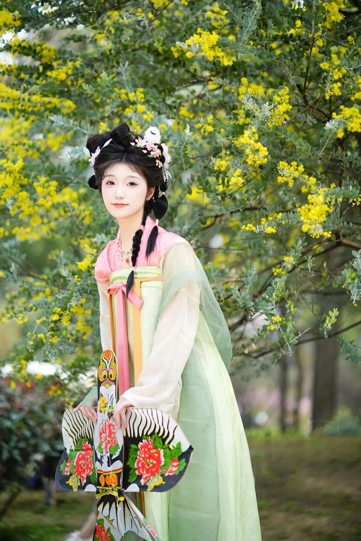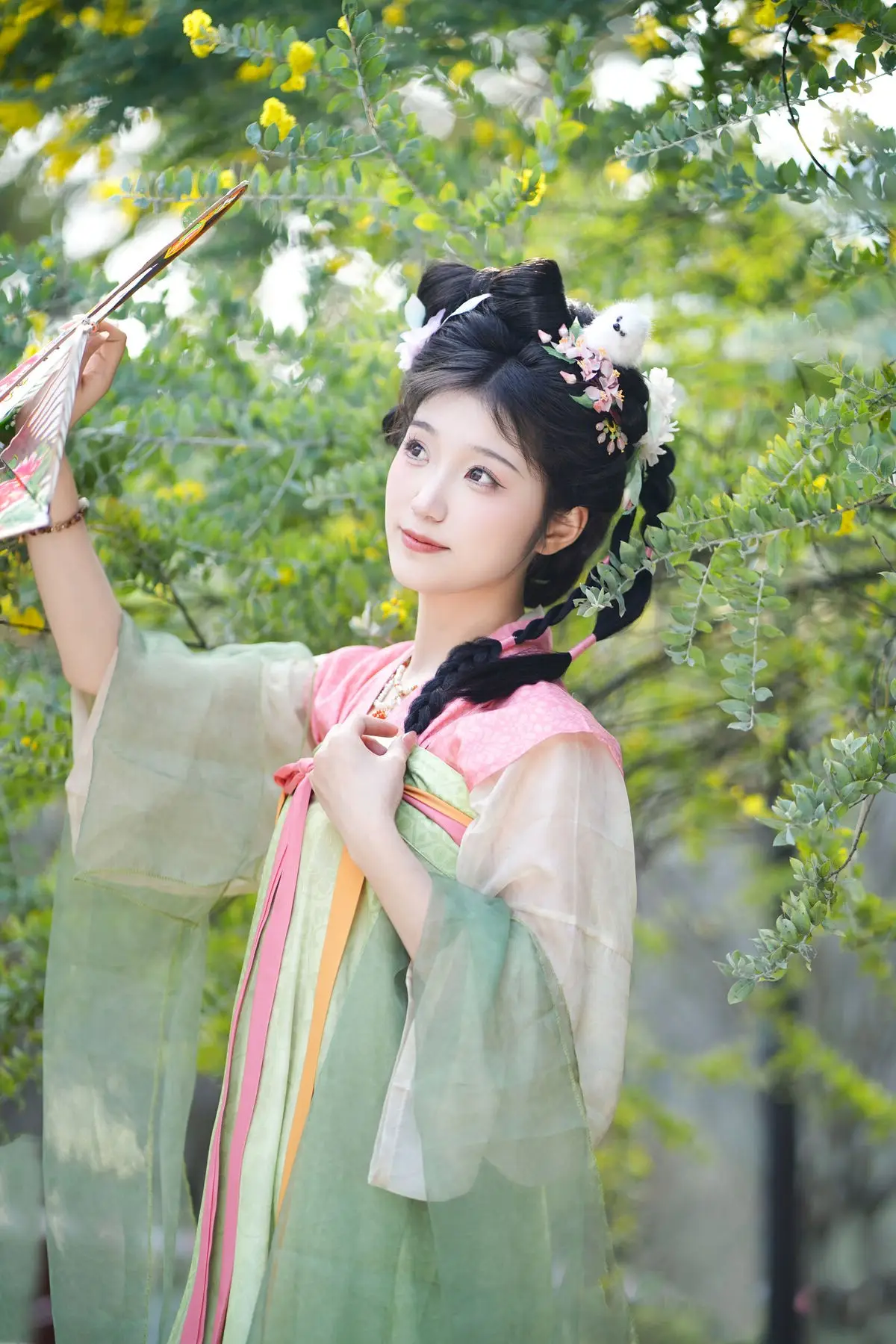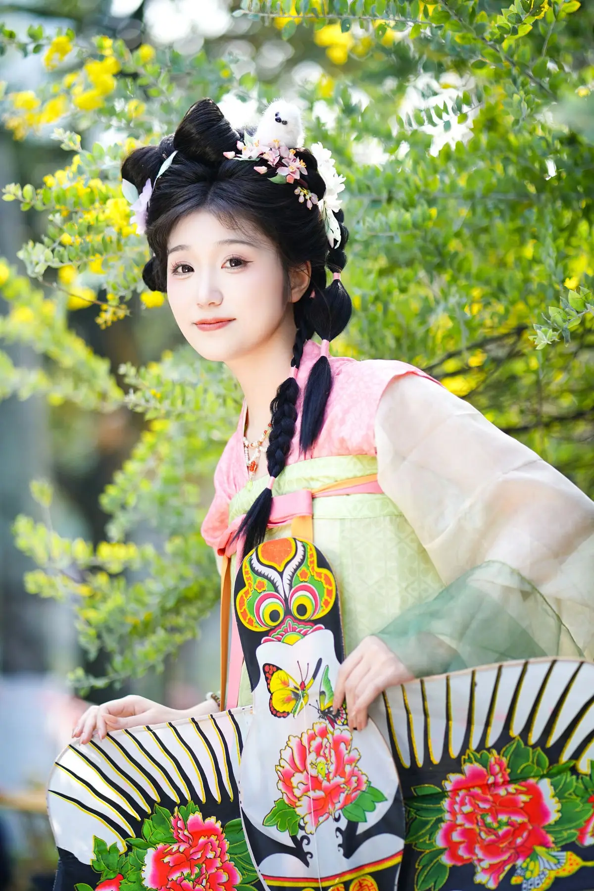 Discover the ethereal beauty of Zi Yu adorned in exquisite traditional Hanfu. Her soft pastel green and pink attire perfectly complements her intricate braided updo, embellished with delicate hair ornaments. Playfully holding a vibrant butterfly kite, she creates a picturesque and serene scene amidst lush natural greenery. The image beautifully blends classical cultural aesthetics with youthful charm, evoking a sense of tranquility and admiration for her pure elegance. This is a captivating and emotionally rich artistic moment, showcasing timeless grace.#Hanfu #AsianBeauty #ButterflyKite #TraditionalChinese #ZiYu
