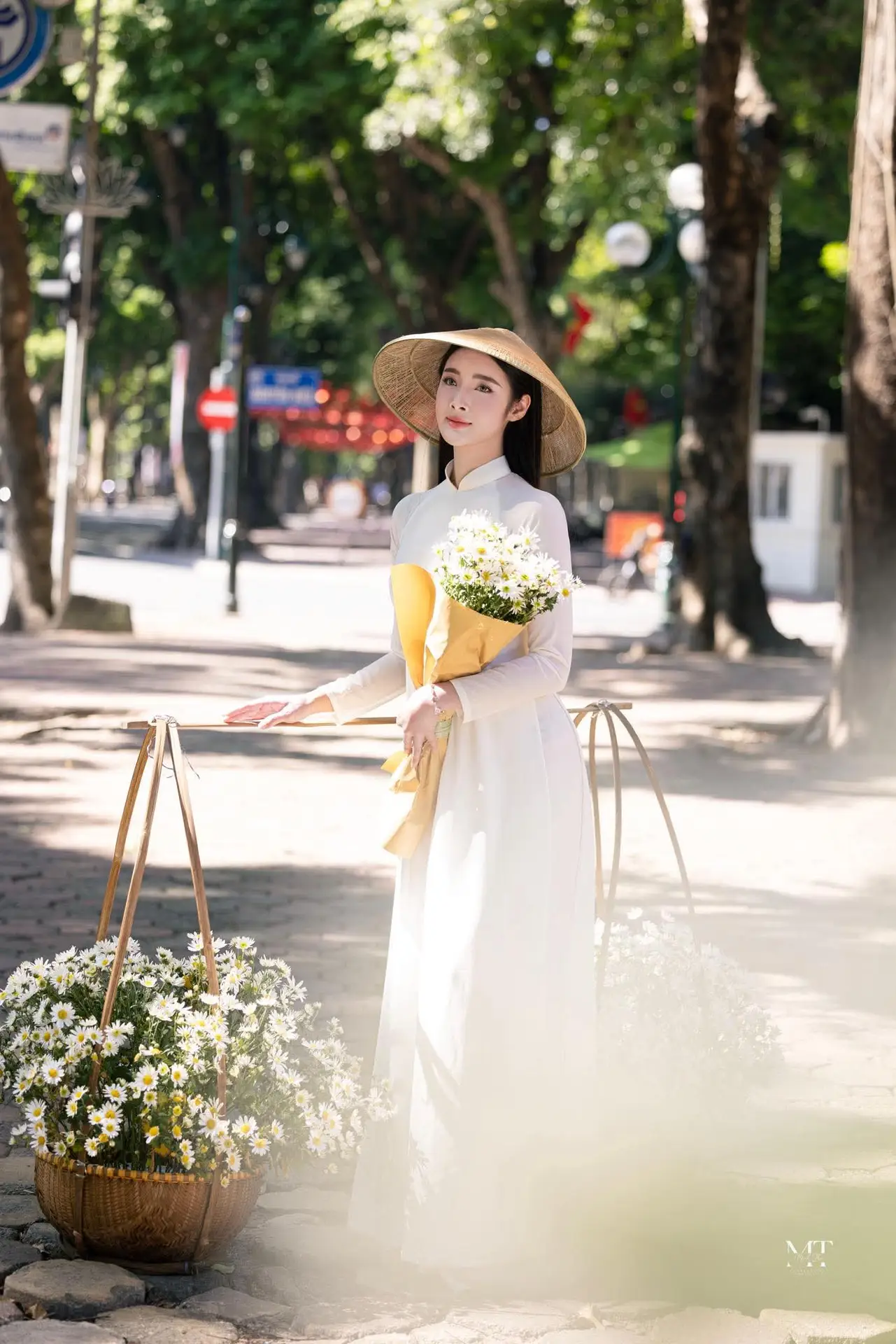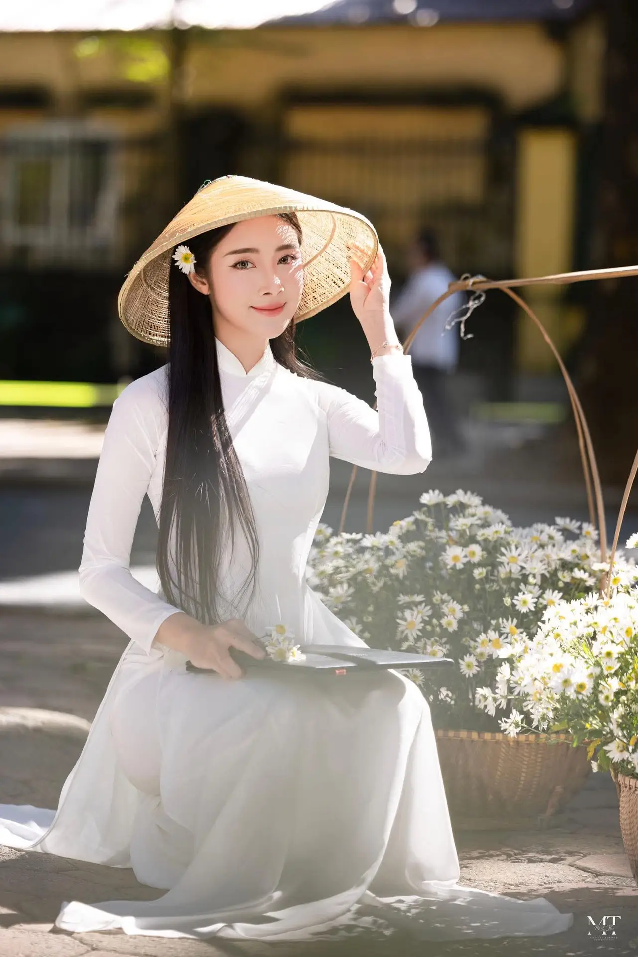 In this stunning photograph we admire the pure and gentle beauty of a graceful Vietnamese girl She wears a pristine white Ao Dai a symbol of Vietnamese culture and elegance Traditional beauty is delicately honored through her conical hat and the bouquet of pure white daisies in her hand symbolizing innocence and purity Her long dark hair and dreamy distant gaze create a poetic and romantic image This is not just a captured moment but a tribute to the Vietnamese soul a perfect blend of traditional attire and rustic natural beauty captivating viewers evoking a sense of peace and nostalgia for timeless cultural values