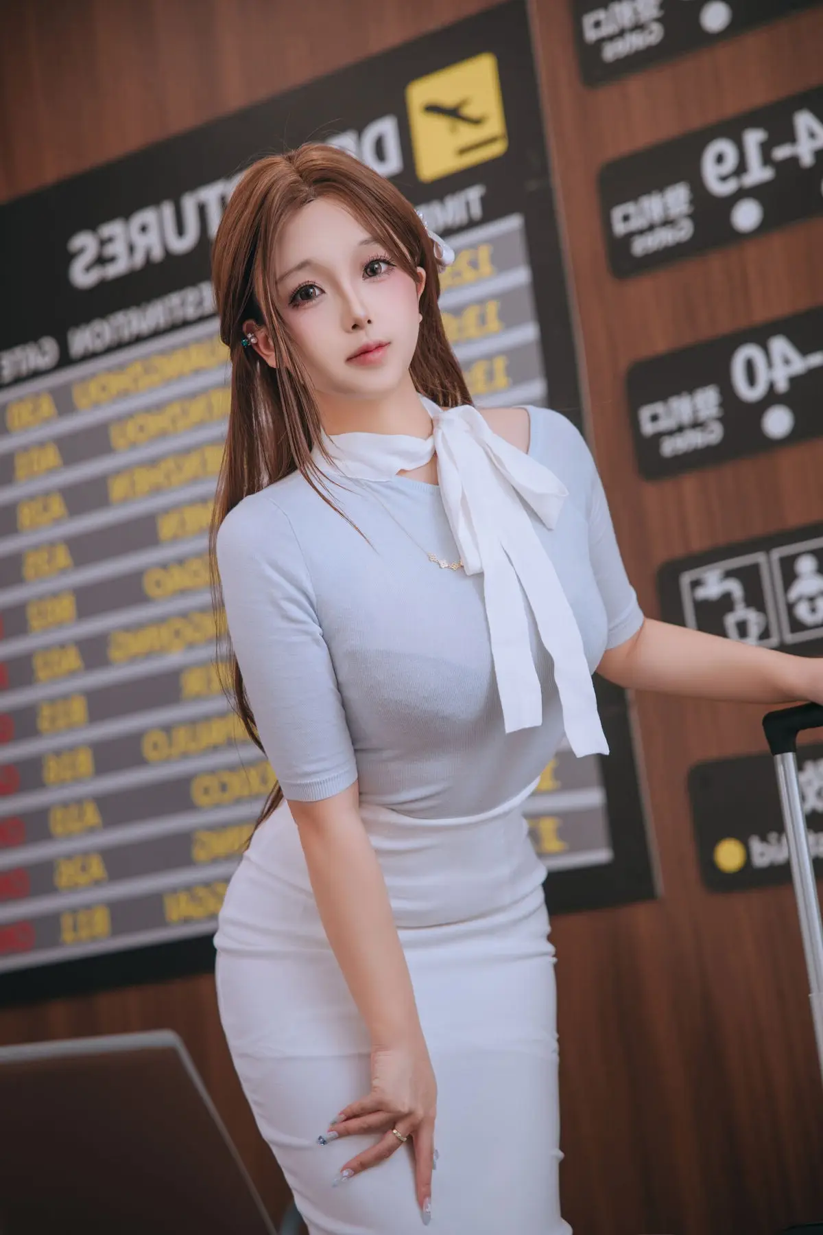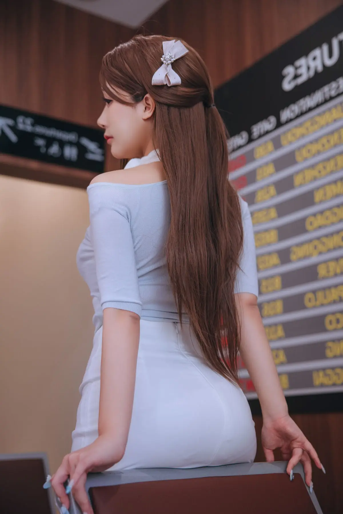 In the 'International Flight' Part02 collection, coser Ri Nai Jiao shines with elegant and alluring beauty. She poses gracefully in a light, sophisticated outfit consisting of a bright top and a short white skirt, paired with high heels that accentuate her long, slender legs. Her charming pose, leaning slightly over a white sofa, with her gaze directly at the camera, is utterly captivating. The image evokes the luxurious, modern essence of a flight attendant or a stylish traveler in a cozy resting space. This photo set not only displays exquisite aesthetics but also captures Ri Nai Jiao's alluring and confident demeanor, inviting viewers to explore more memorable moments.#CoserRiNaiJiao #InternationalFlight #TravelFashion #AsianBeauty #ElegantStyle #OL #OfficeLady #Secretary